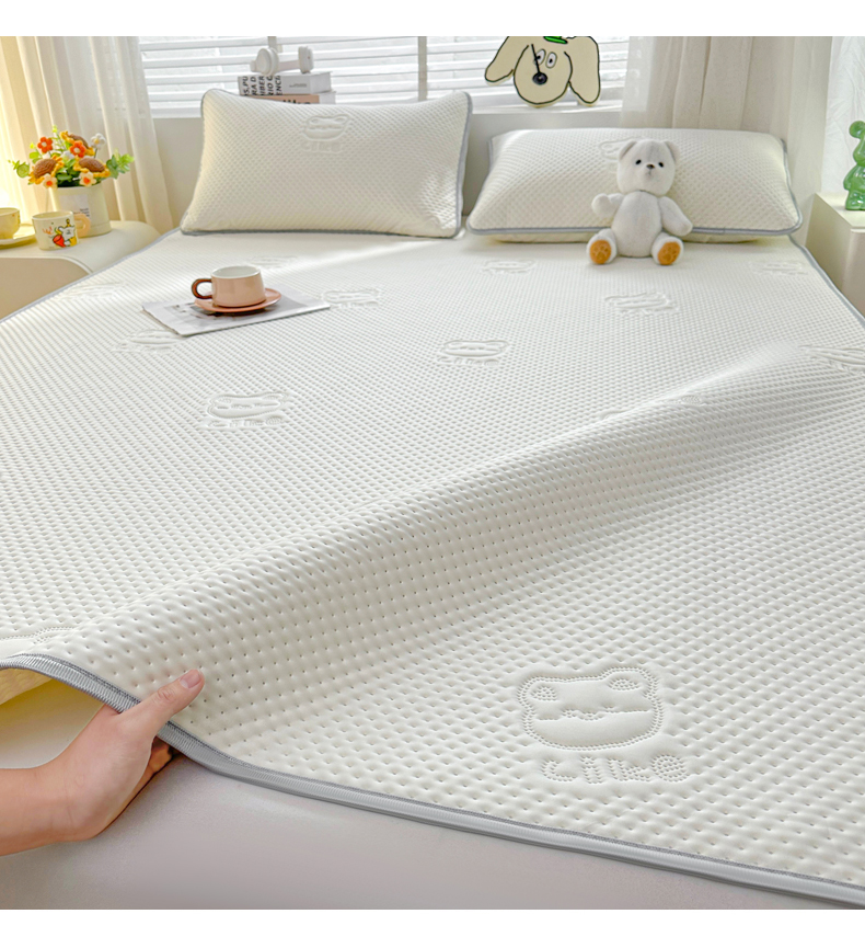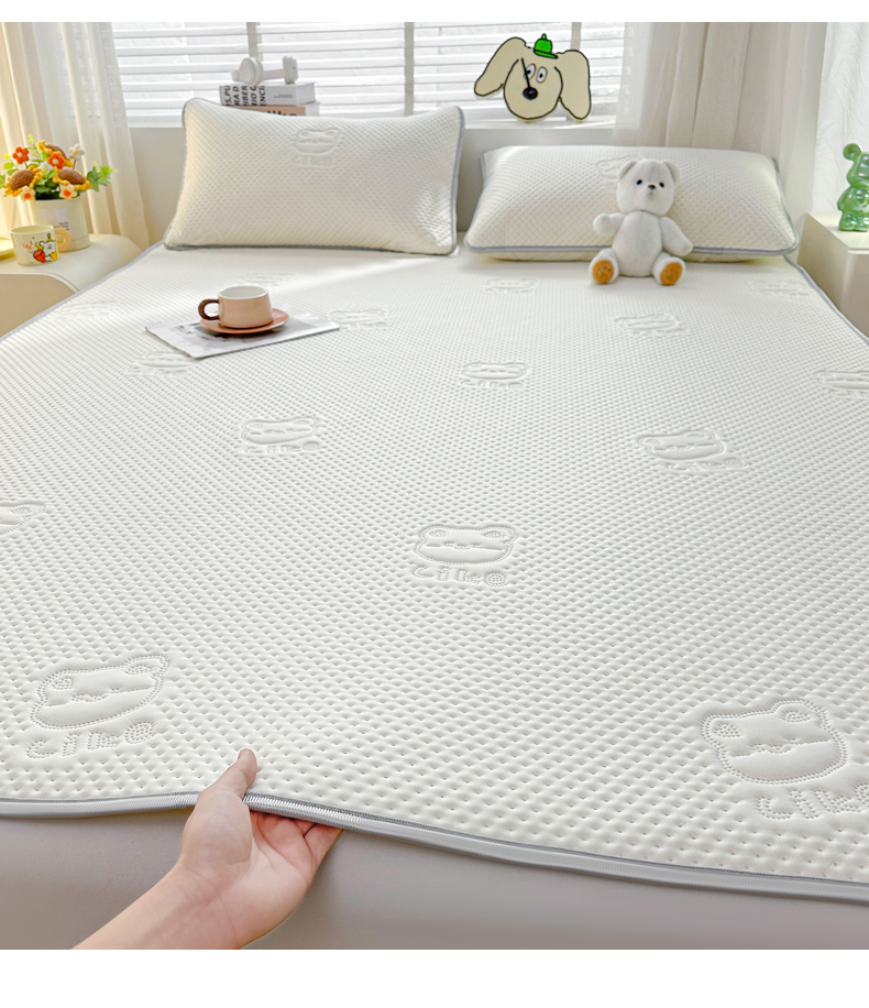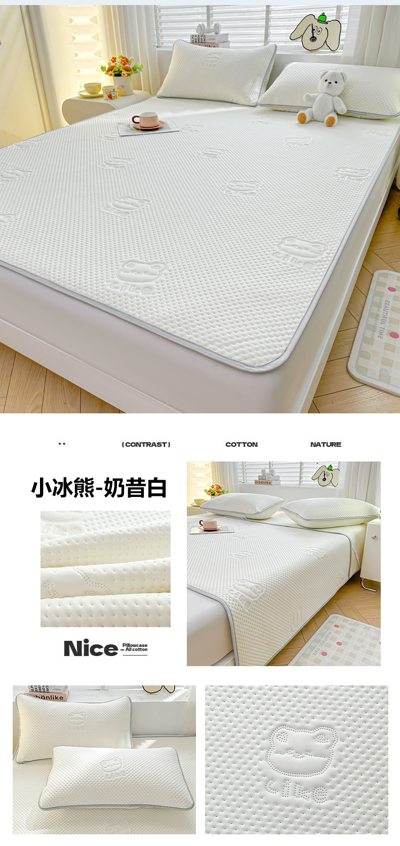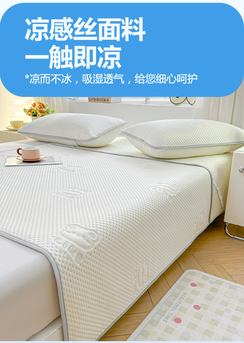 • 91家纺网 家纺一手货源 找家纺 慕木2025新款A类凉感丝小冰熊云母冰丝凉席床笠夏被系列  小冰熊-奶昔白