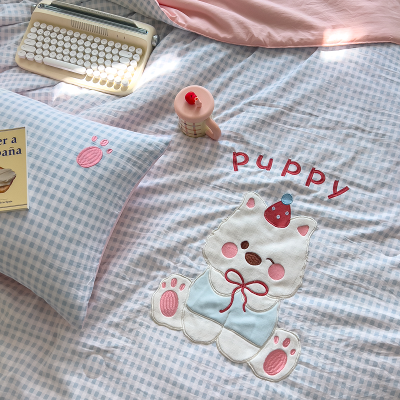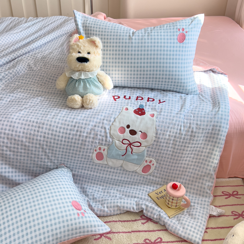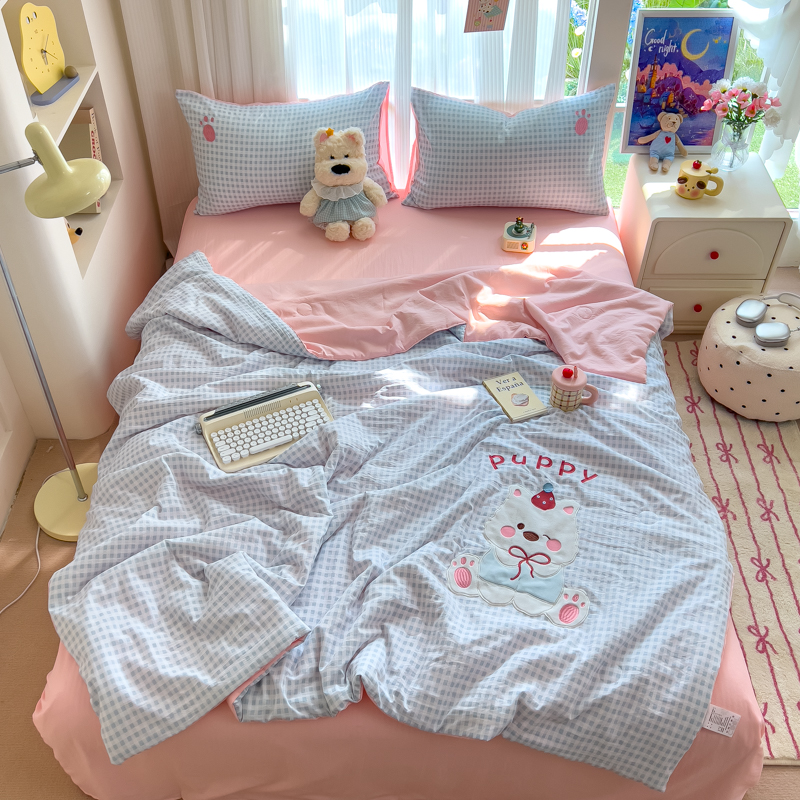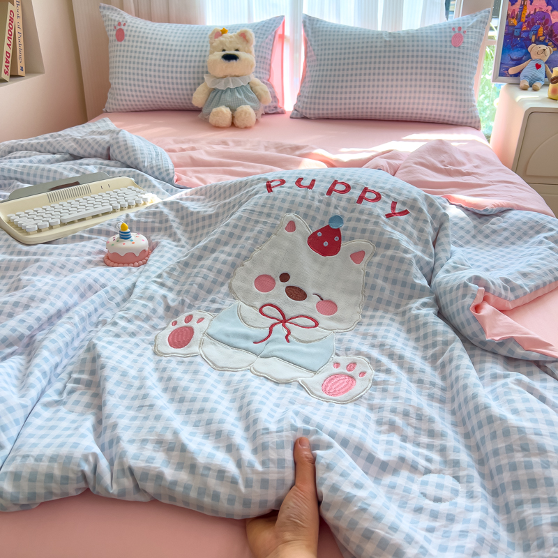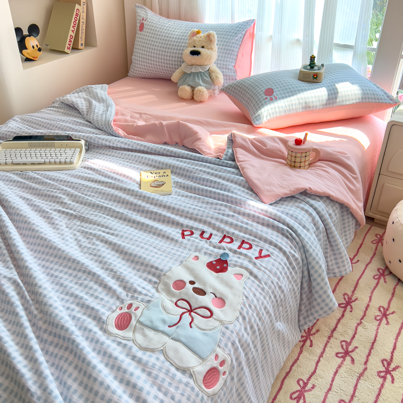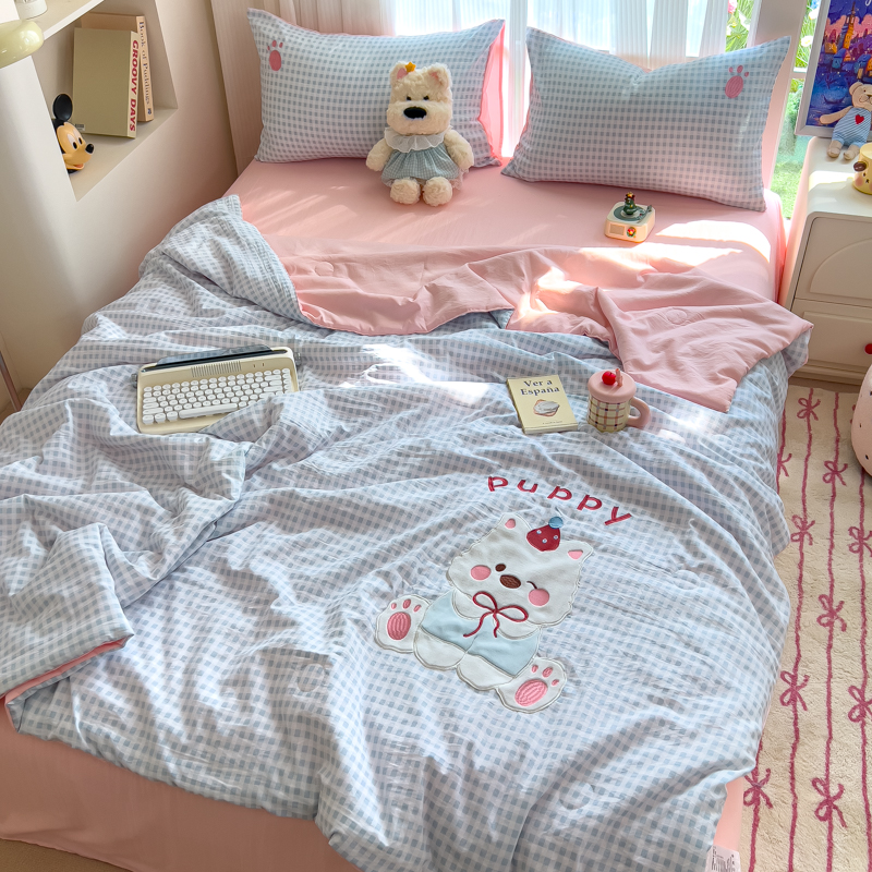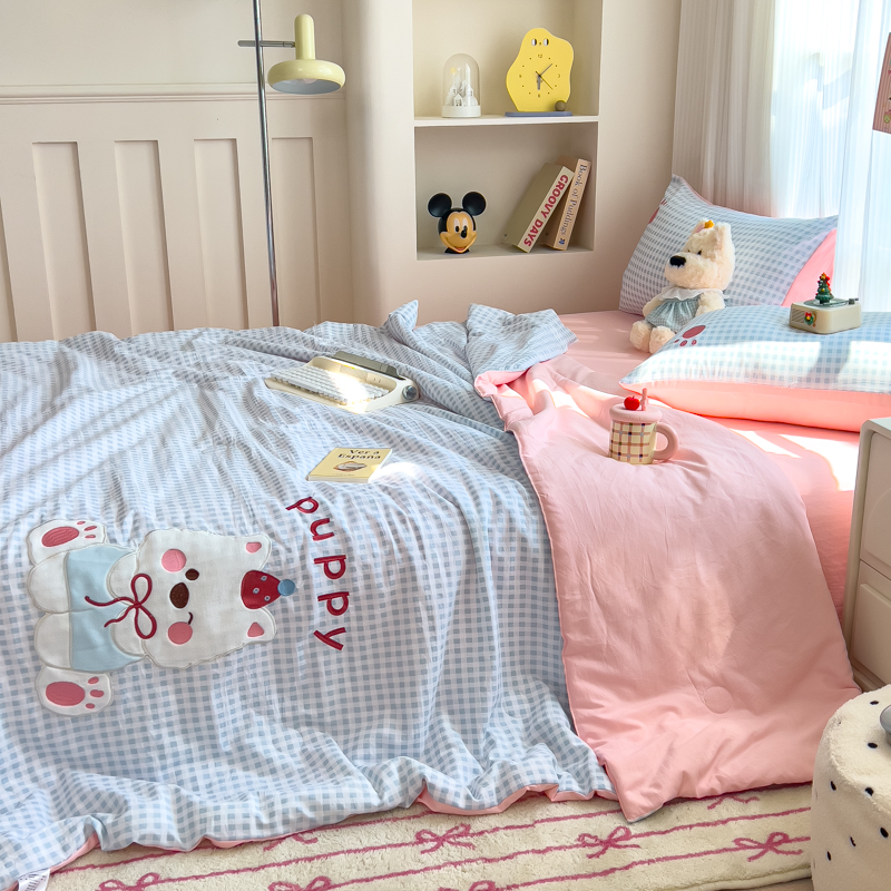 N先生+V 13814689556 发大图/买家秀 2025新款超柔水洗棉贴布绣夏被夏凉被空调被-微笑狗狗系列 微笑狗狗夏被-蓝格