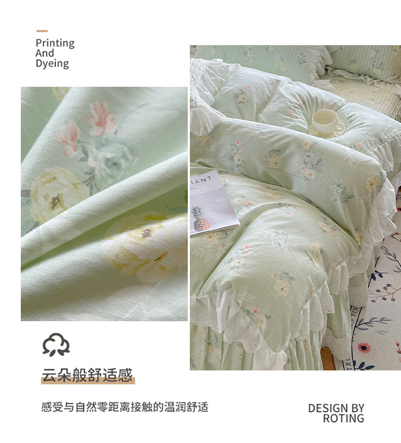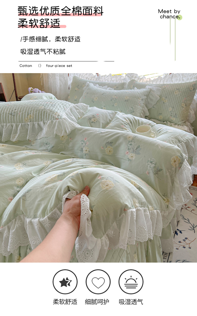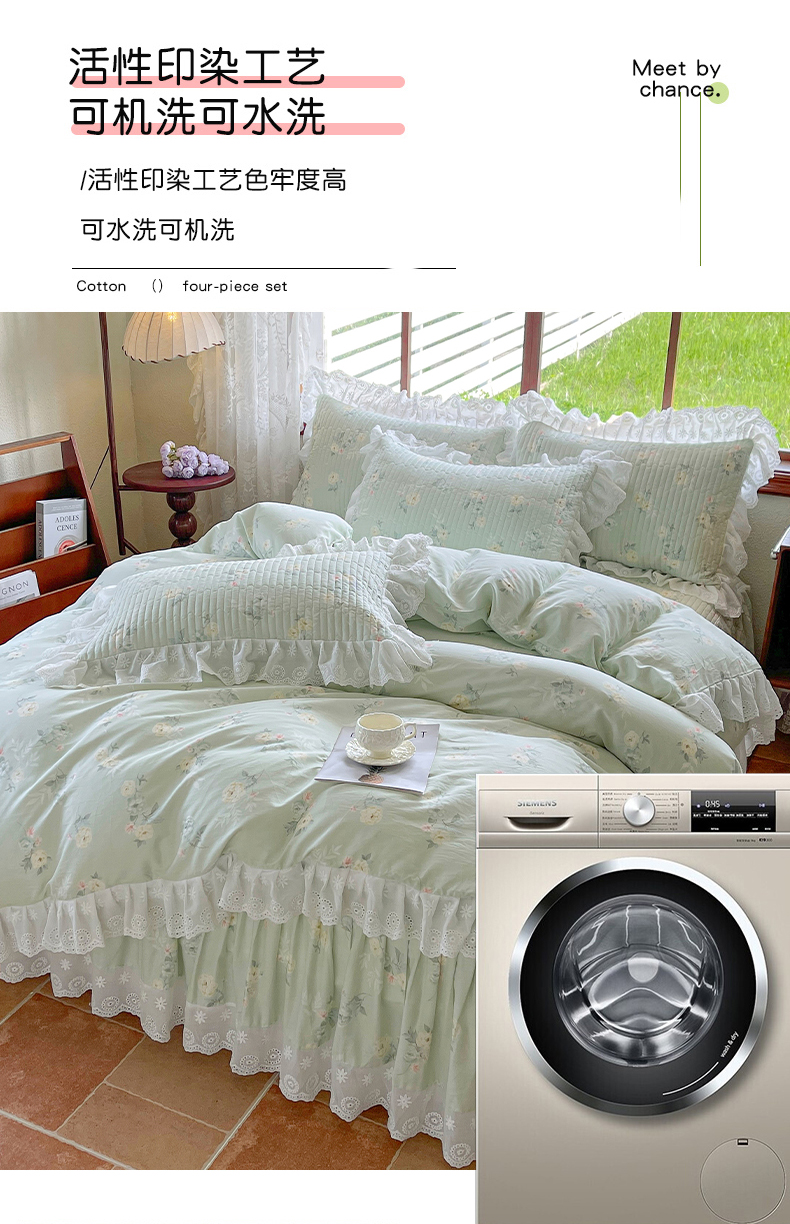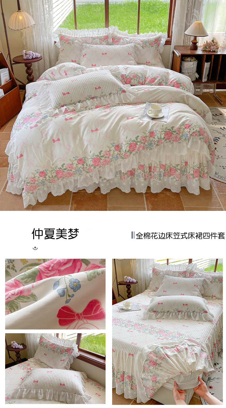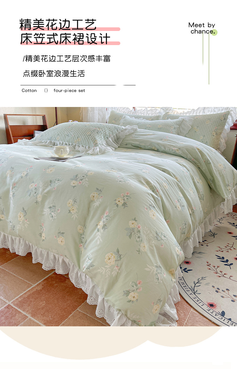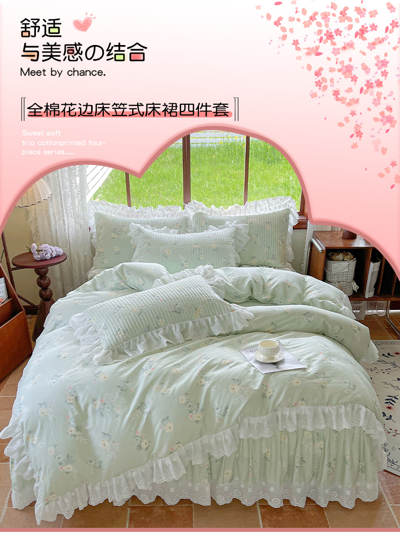 当前位置: 91家纺网 > 商品网购 > 床品套件 > 四件套 > 全棉普通四件套 > 罗艺轩 2025新款全棉印花床笠式花边床裙四件套 茉莉清雨