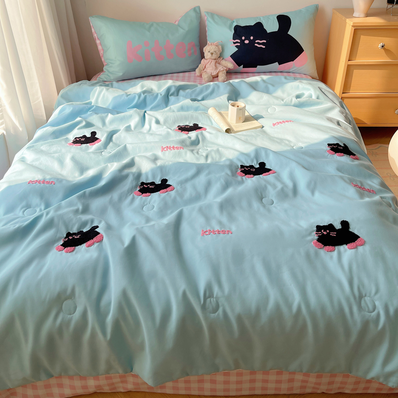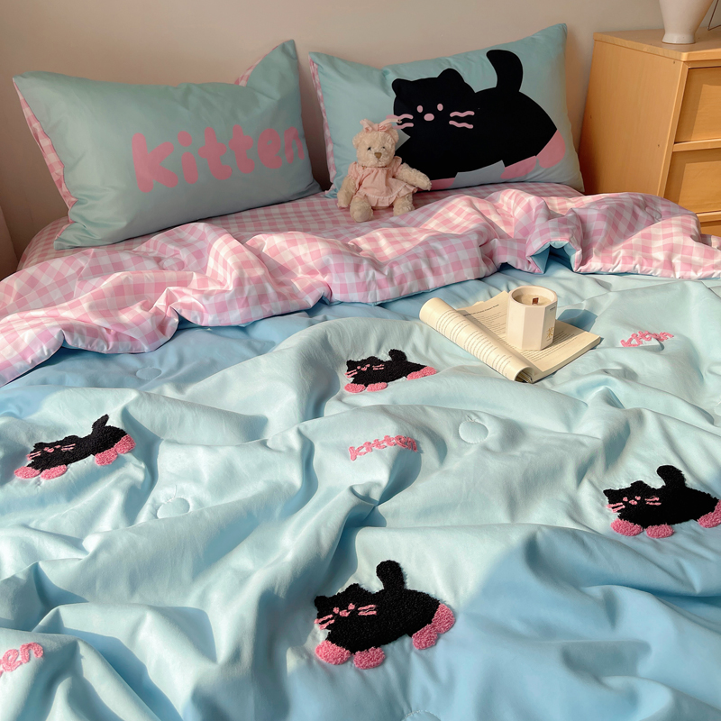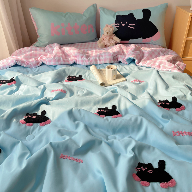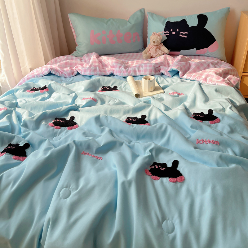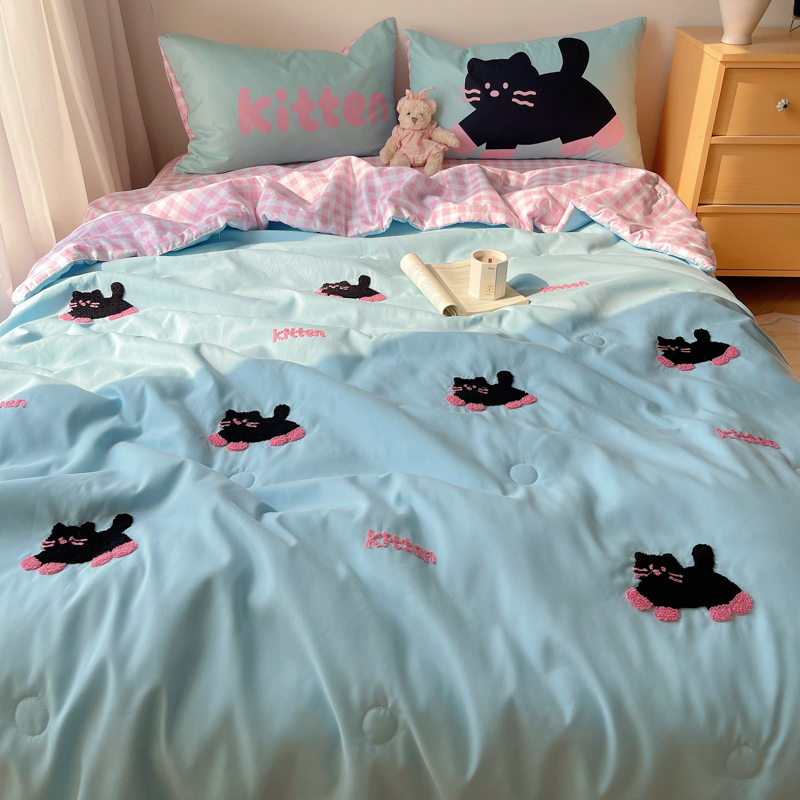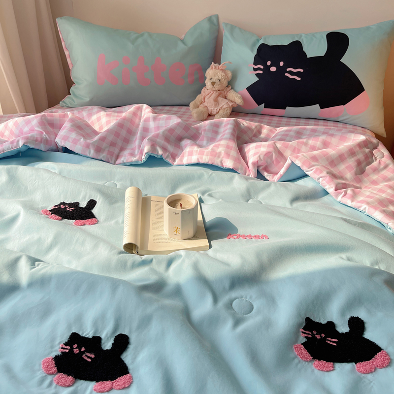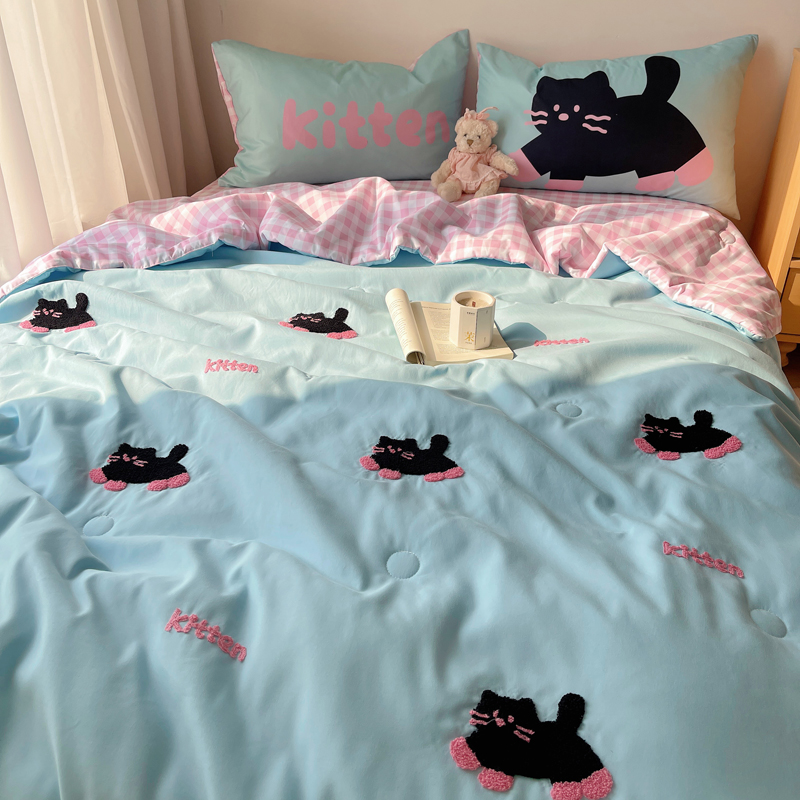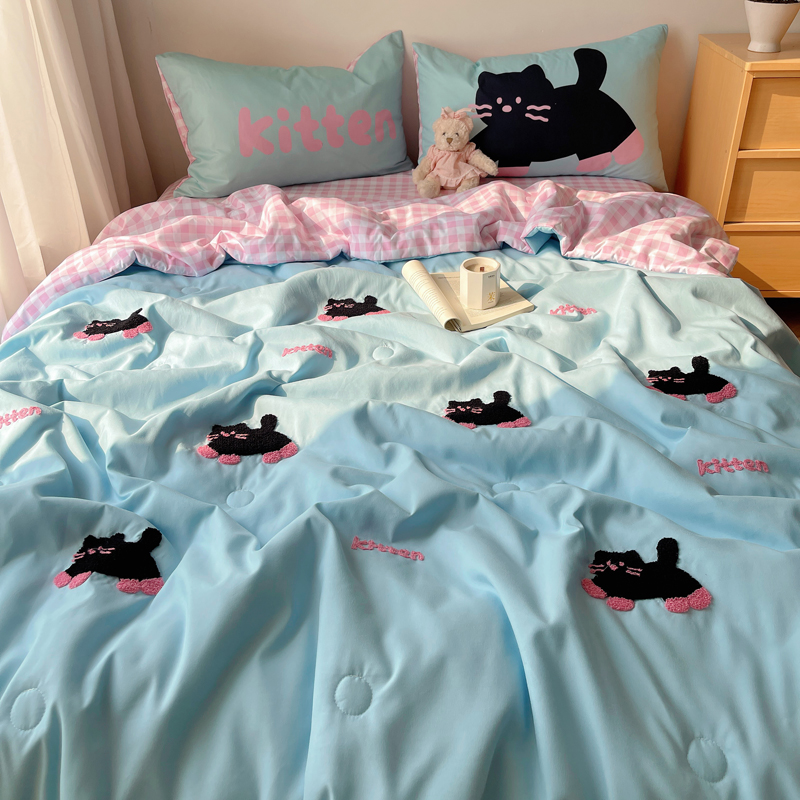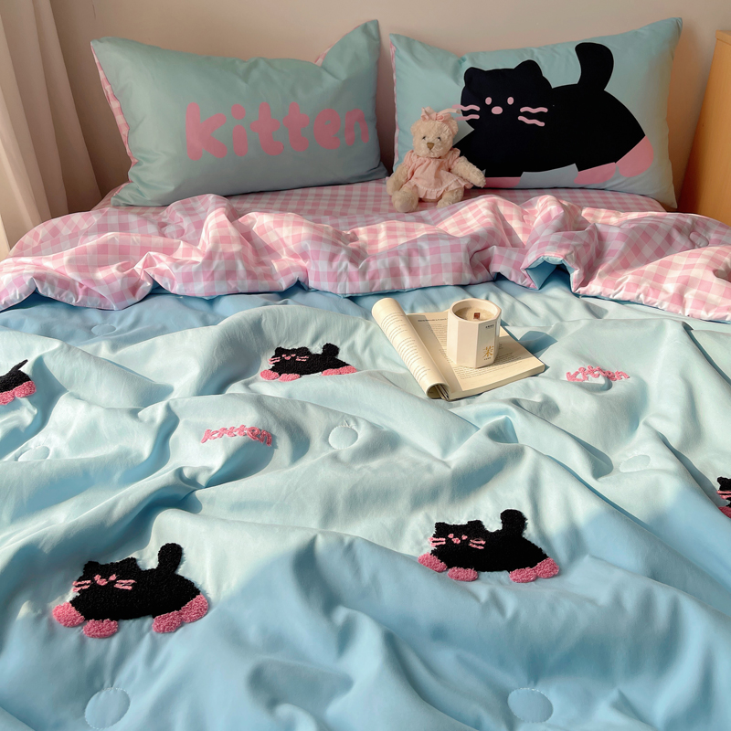 桃喜 2025新款水洗棉毛巾绣单夏被被子被芯夏被套件(非全棉)系列1 粉格小黑猫