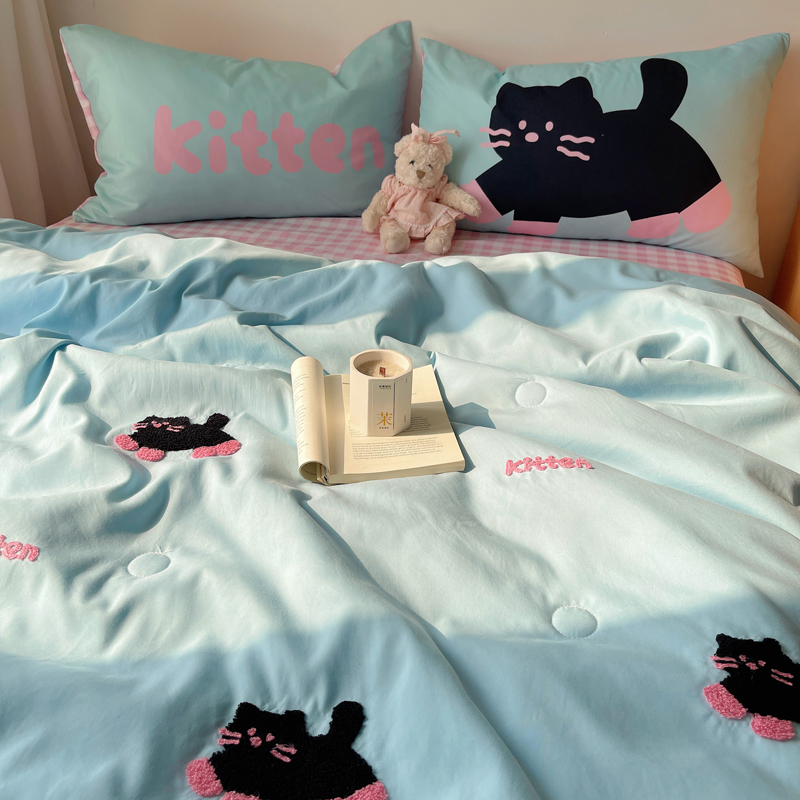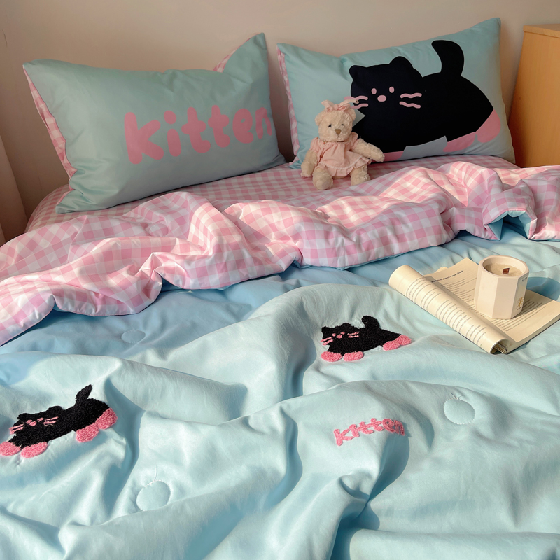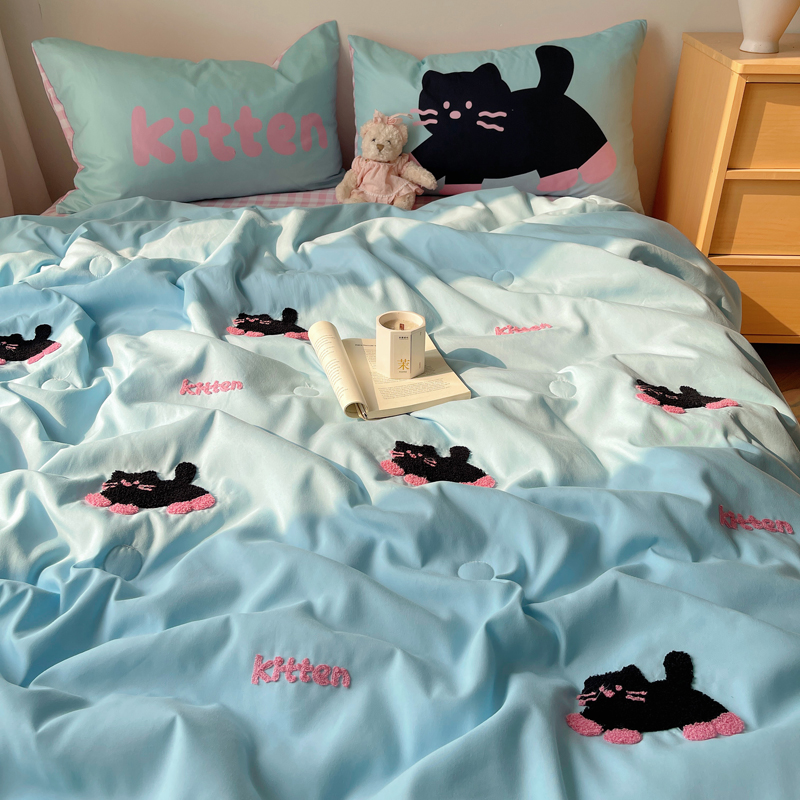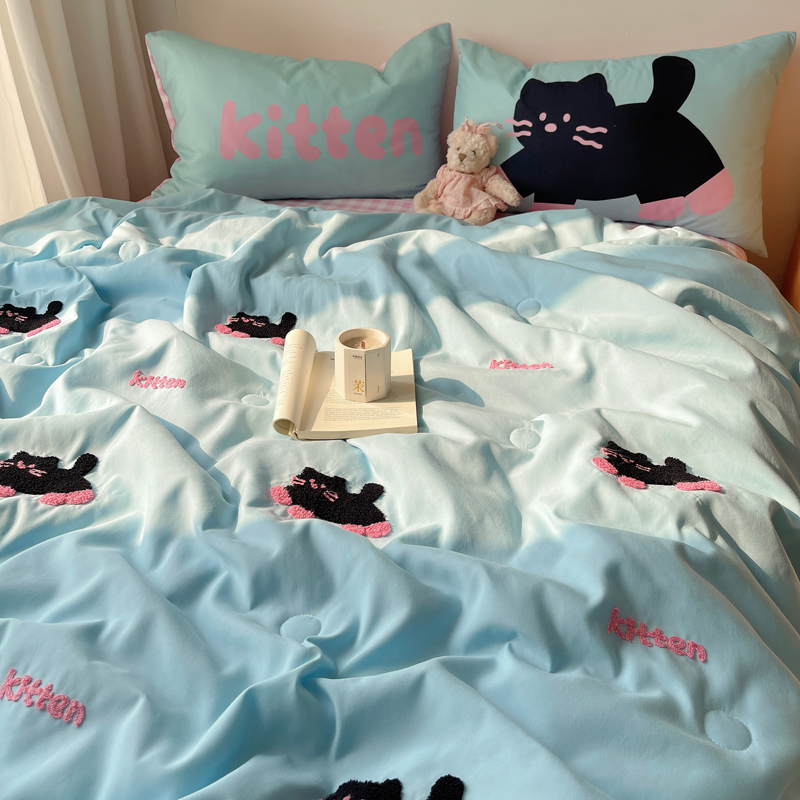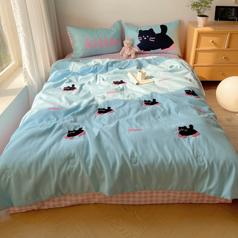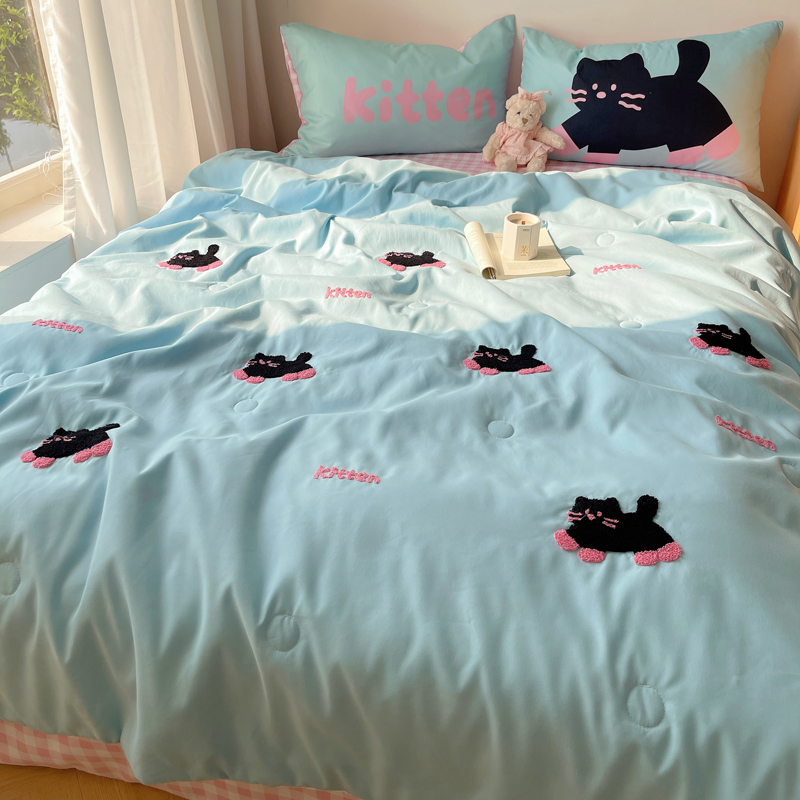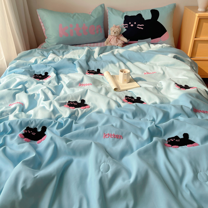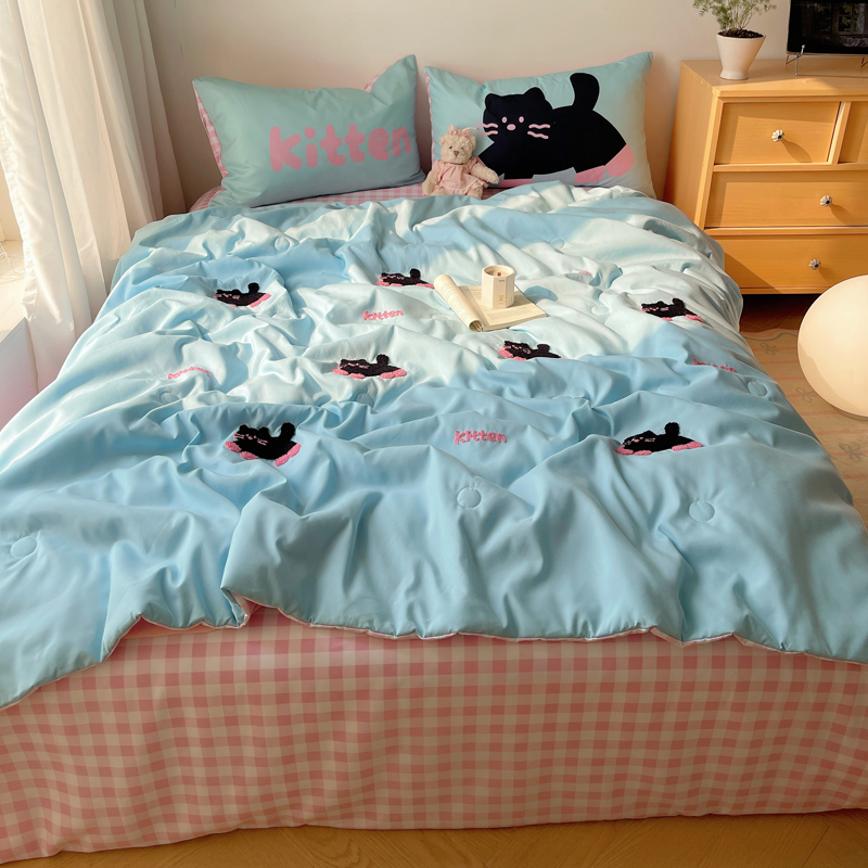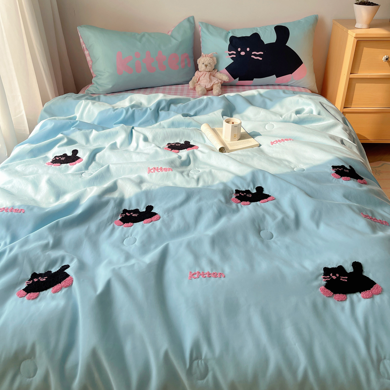 桃喜 2025新款水洗棉毛巾绣单夏被被子被芯夏被套件(非全棉)系列1 粉格小黑猫