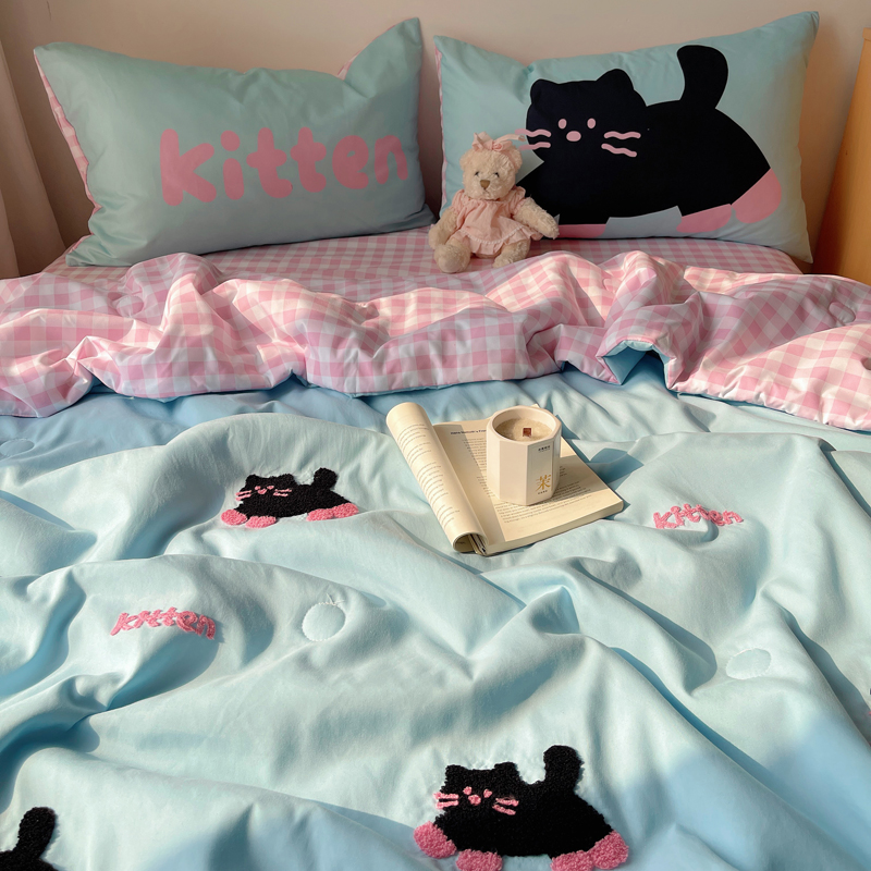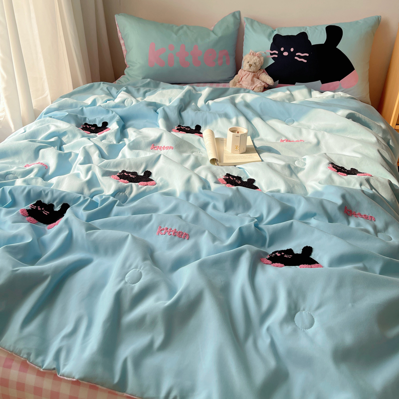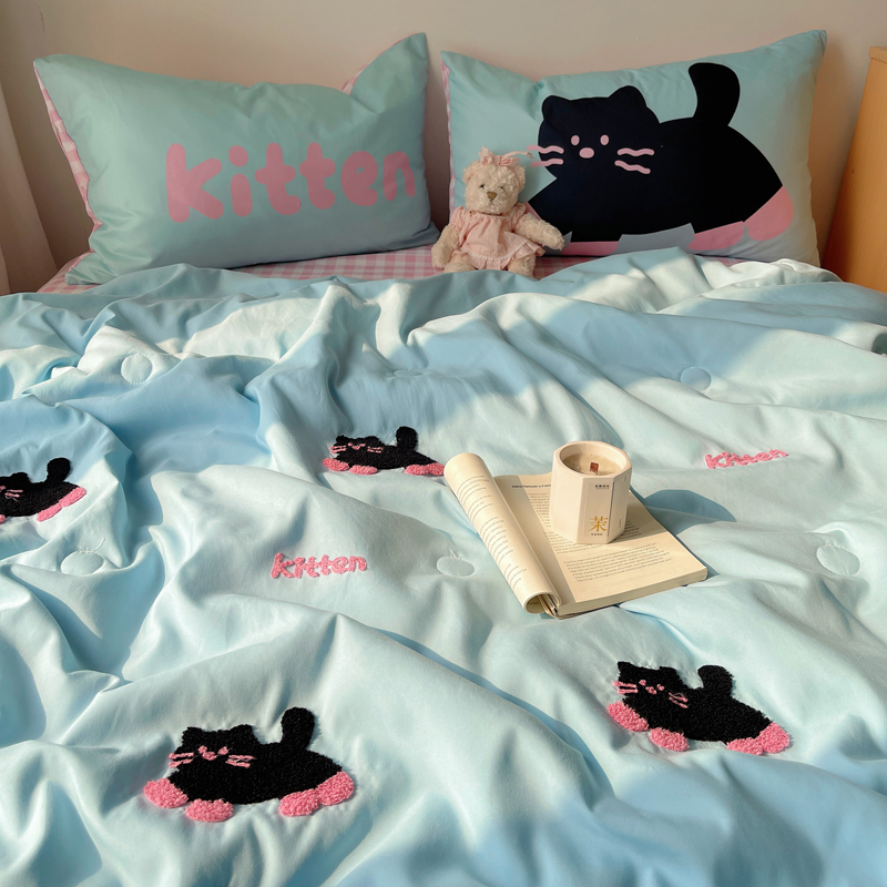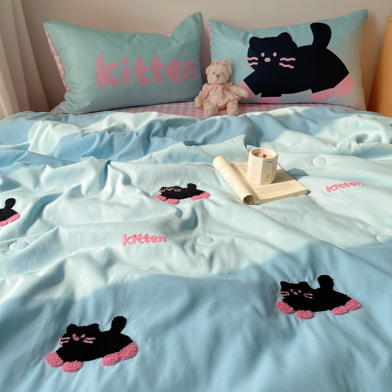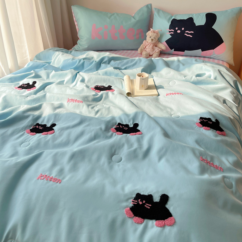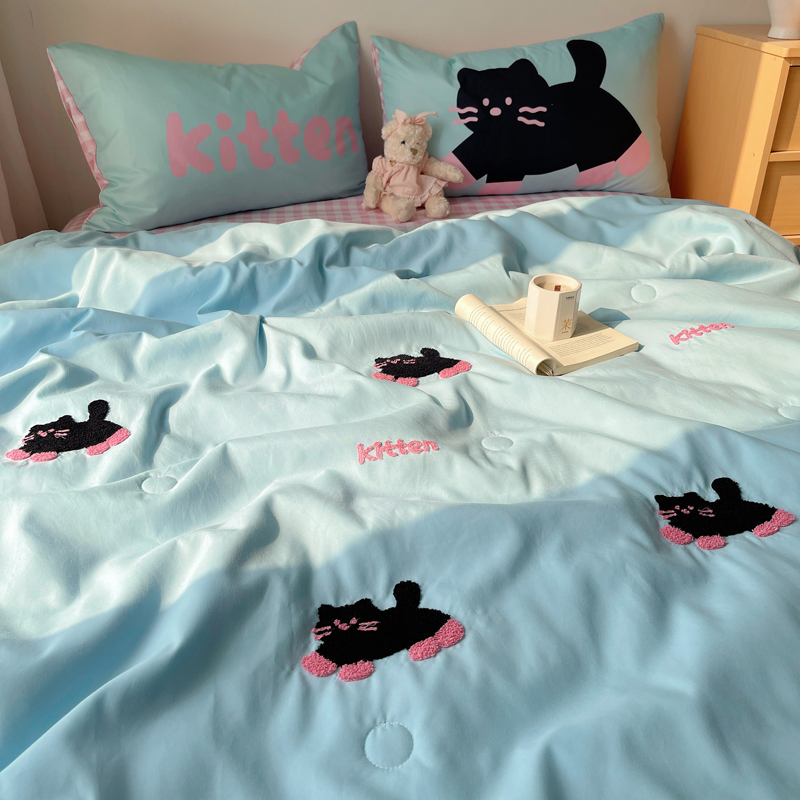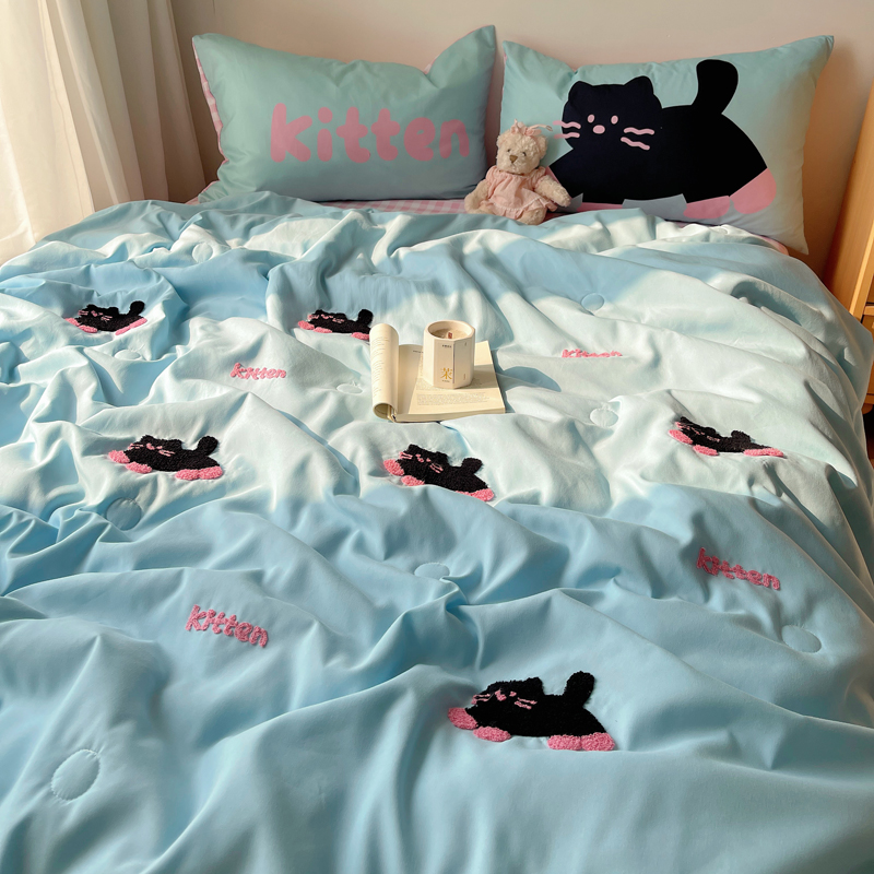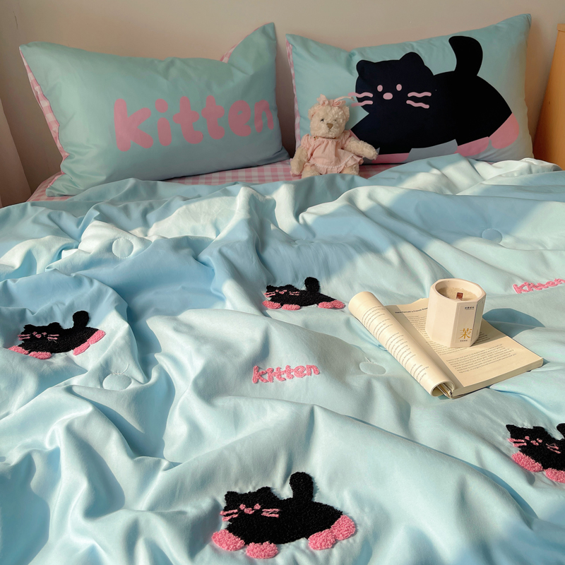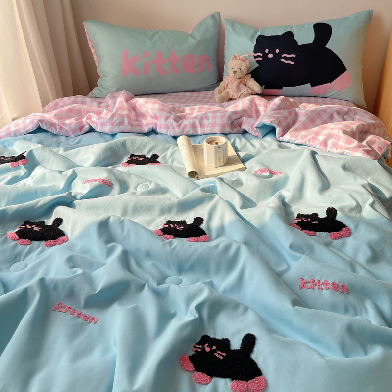 桃喜 2025新款水洗棉毛巾绣单夏被被子被芯夏被套件(非全棉)系列1 粉格小黑猫