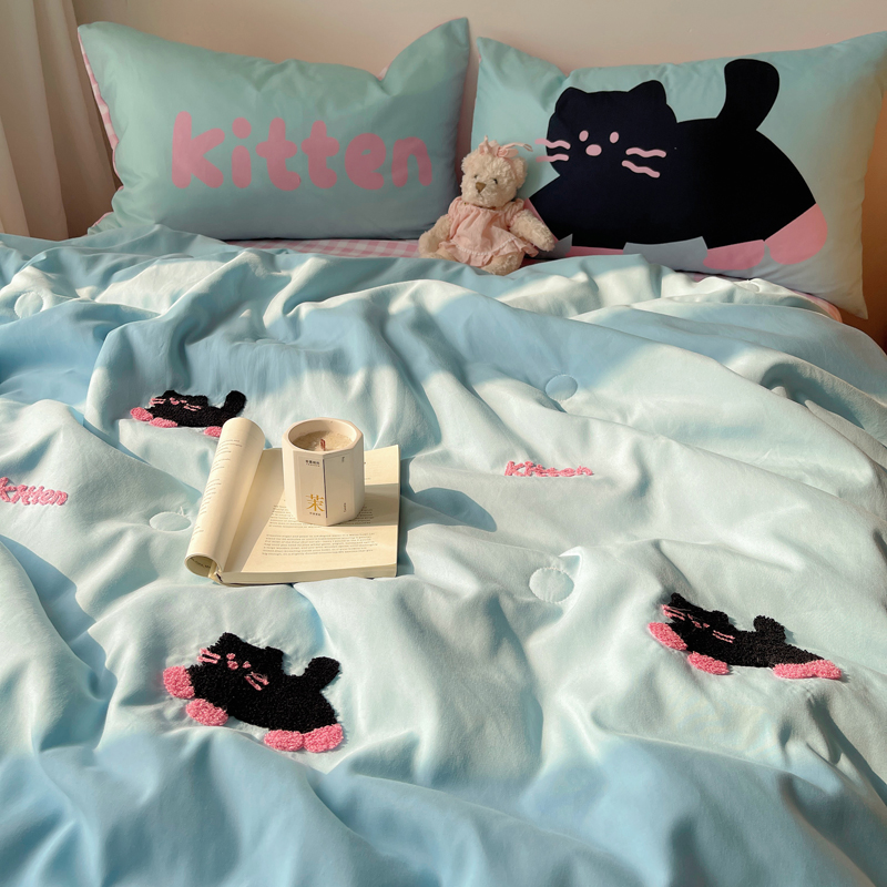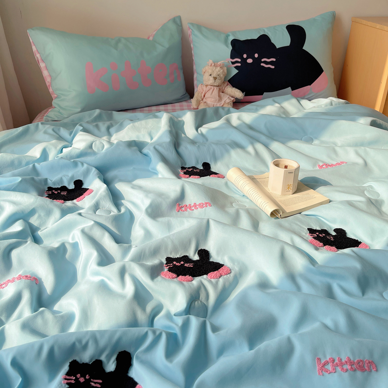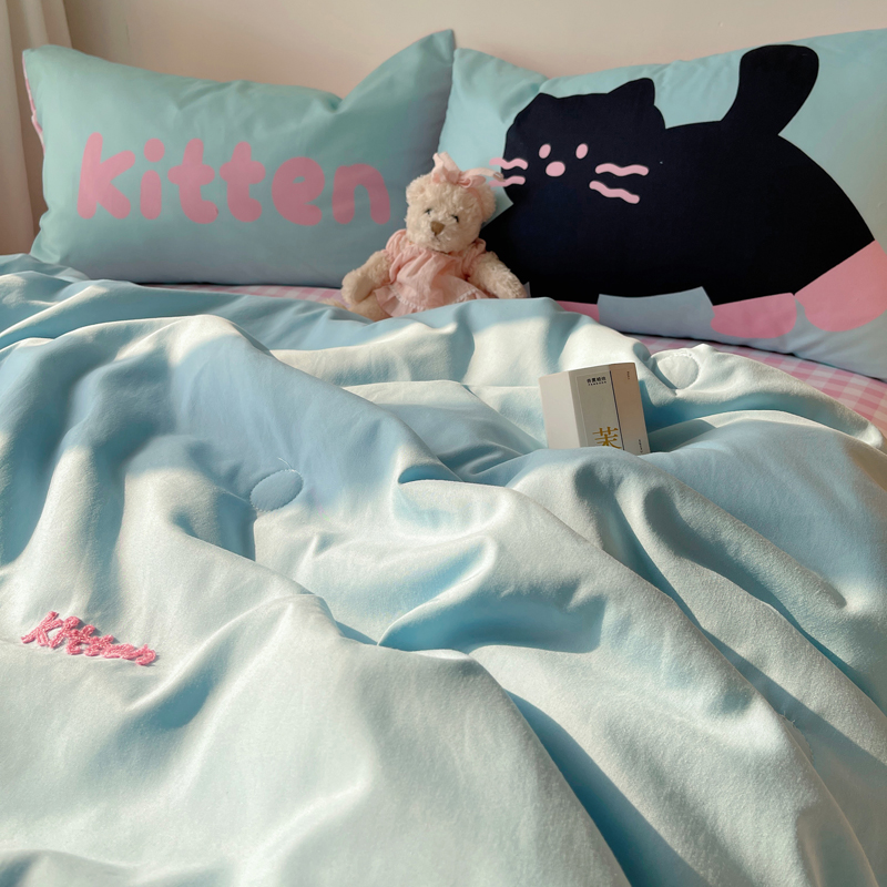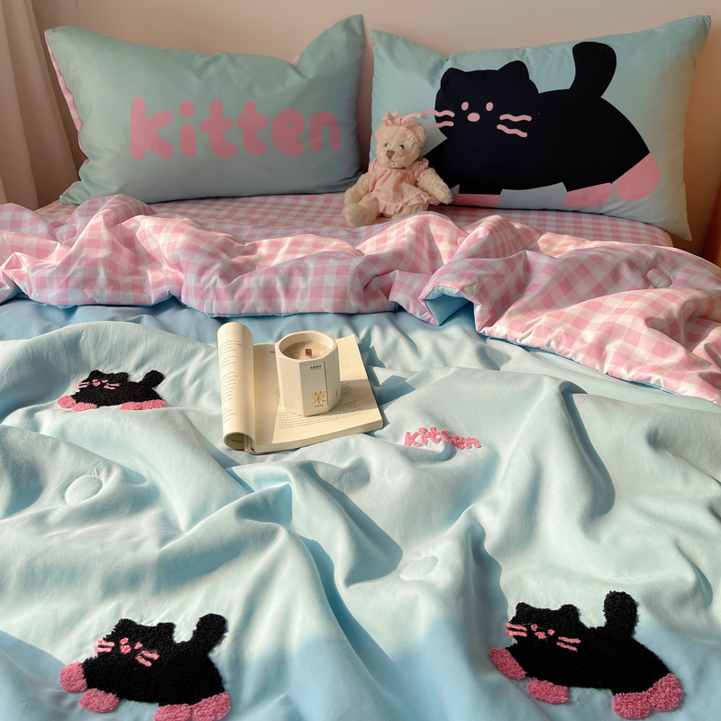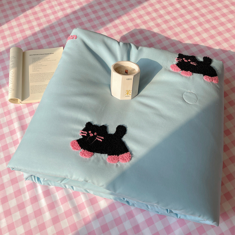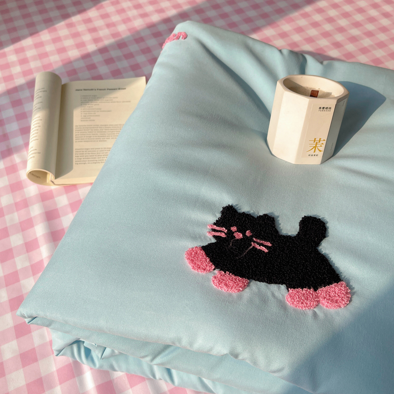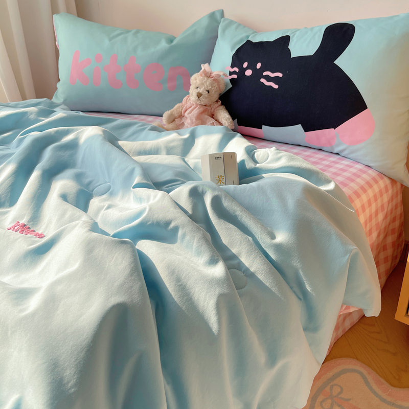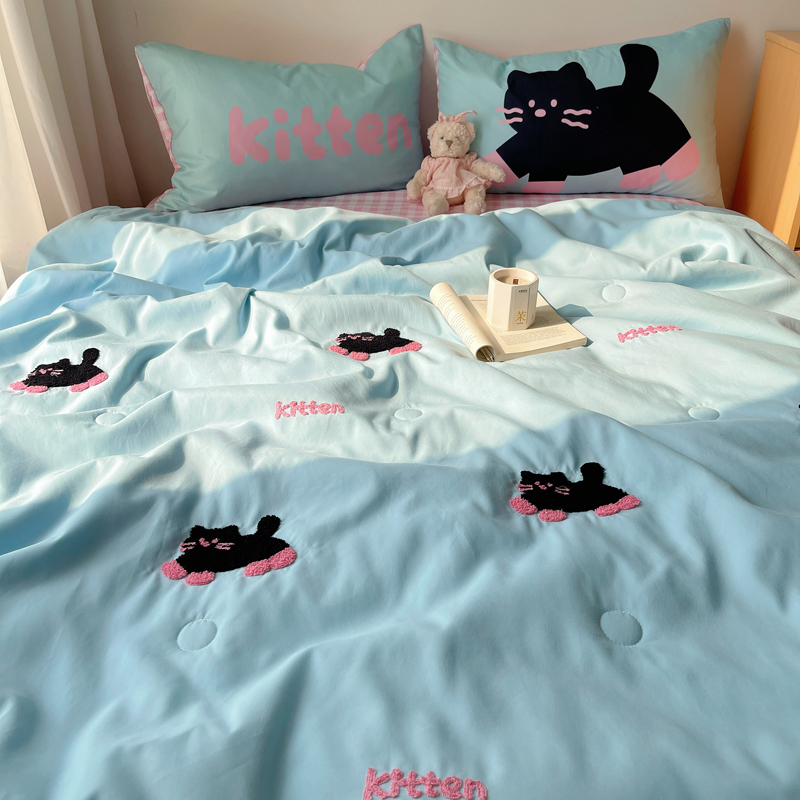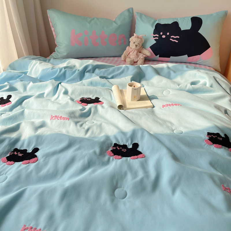 桃喜 2025新款水洗棉毛巾绣单夏被被子被芯夏被套件(非全棉)系列1 粉格小黑猫