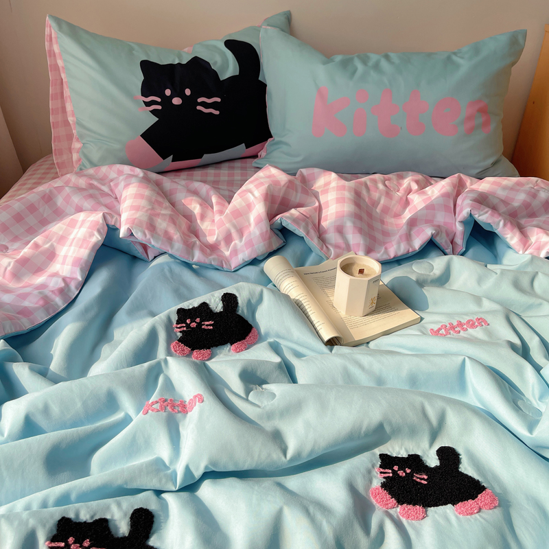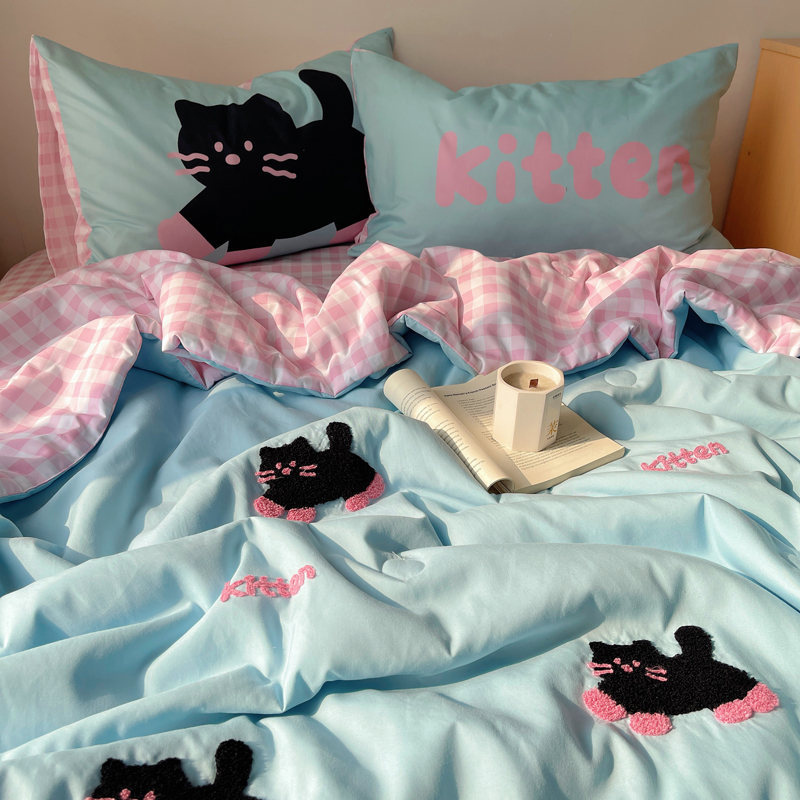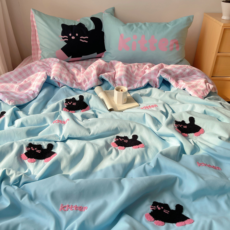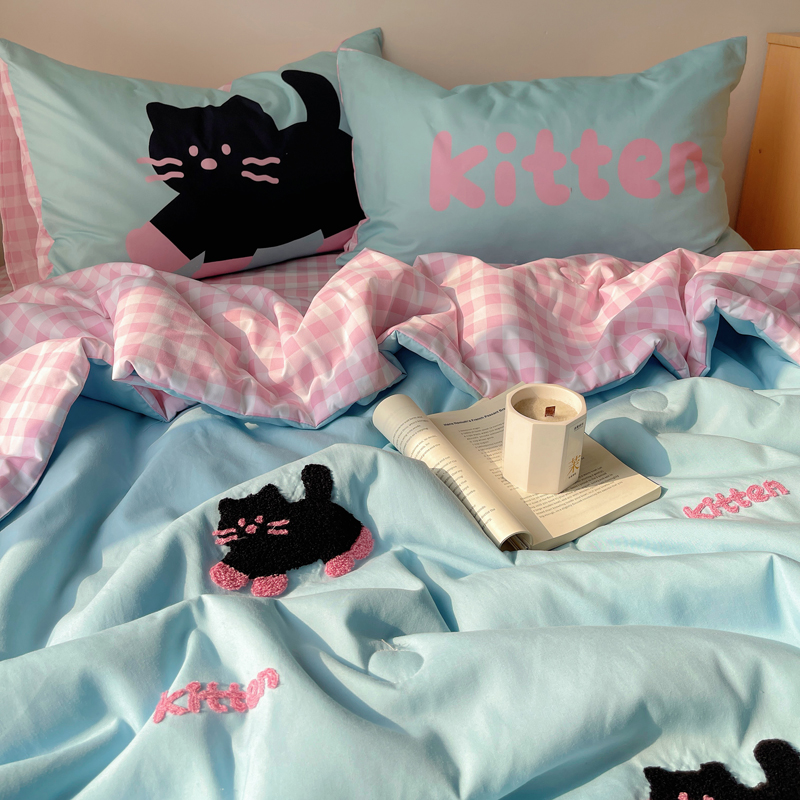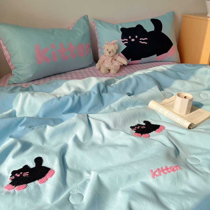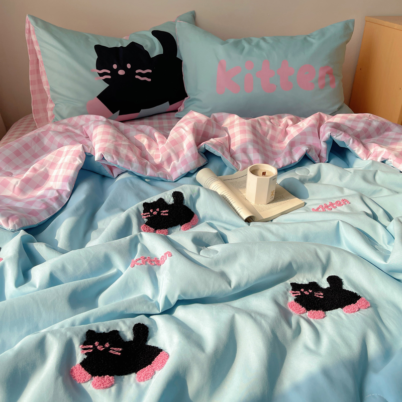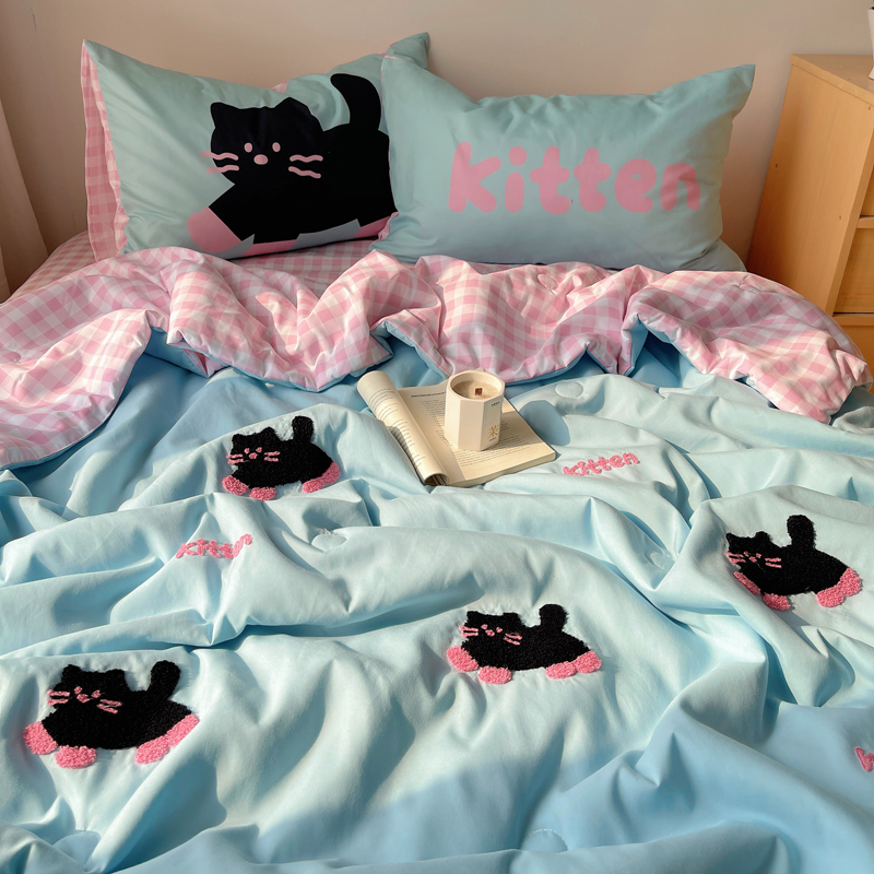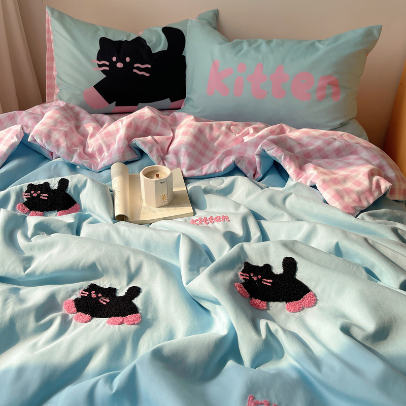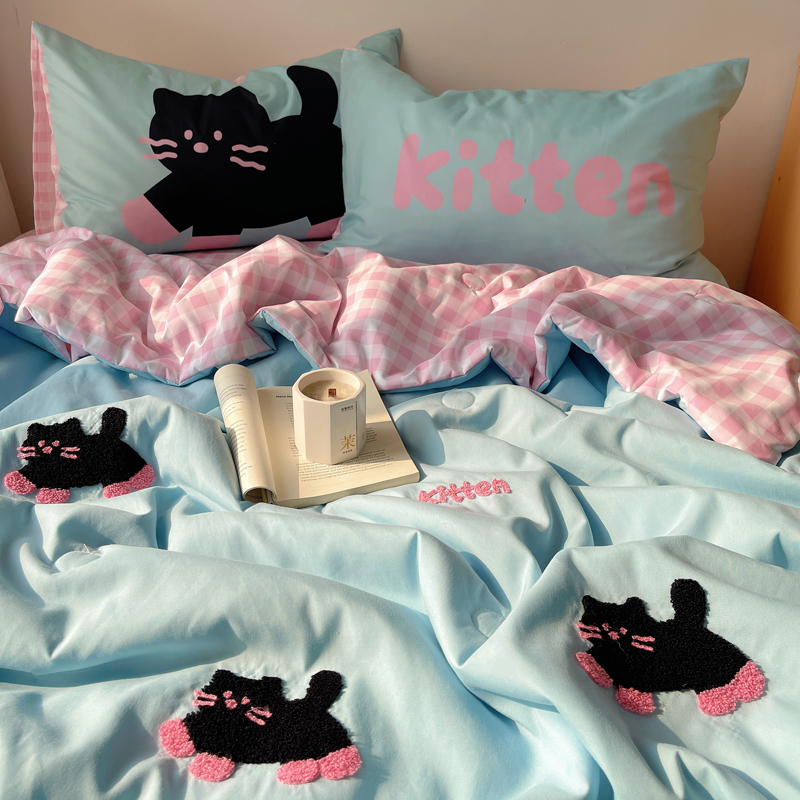 桃喜 2025新款水洗棉毛巾绣单夏被被子被芯夏被套件(非全棉)系列1 粉格小黑猫