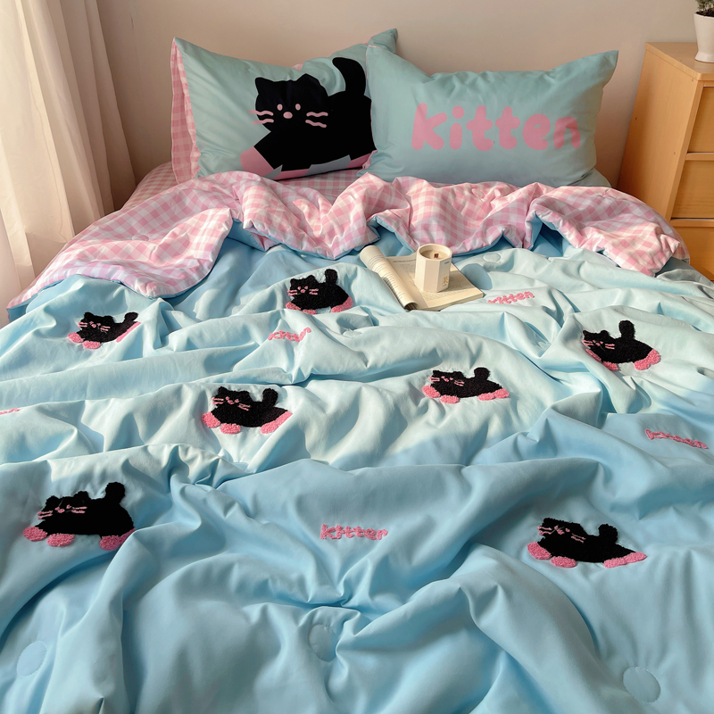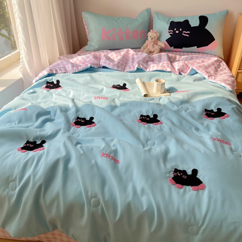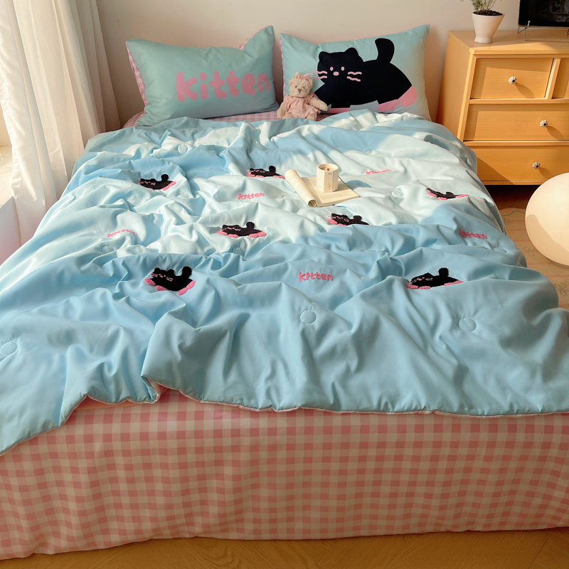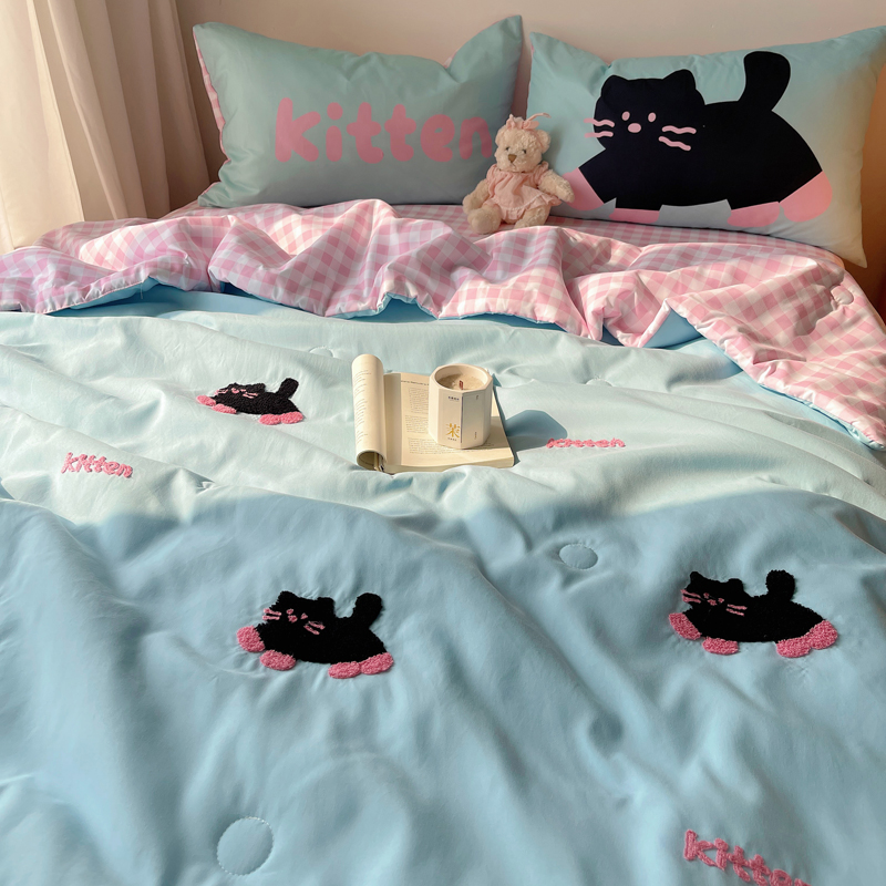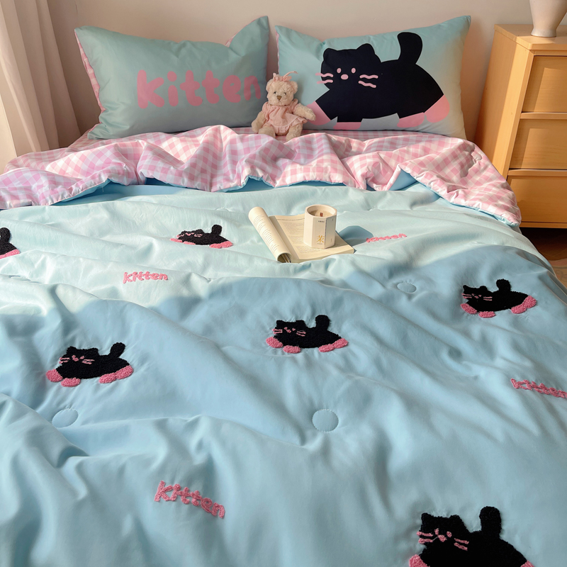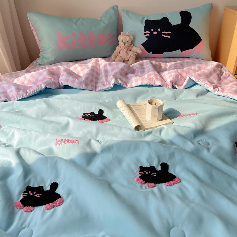 商品名称:桃喜 2025新款水洗棉毛巾绣单夏被被子被芯夏被套件(非全棉)系列1 粉格小黑猫