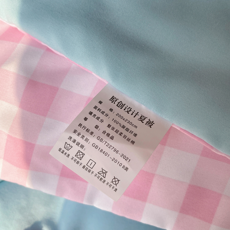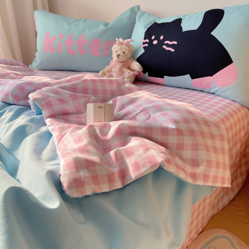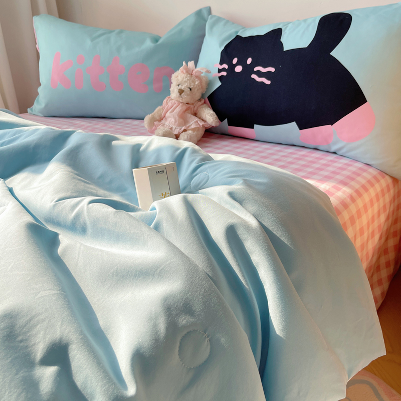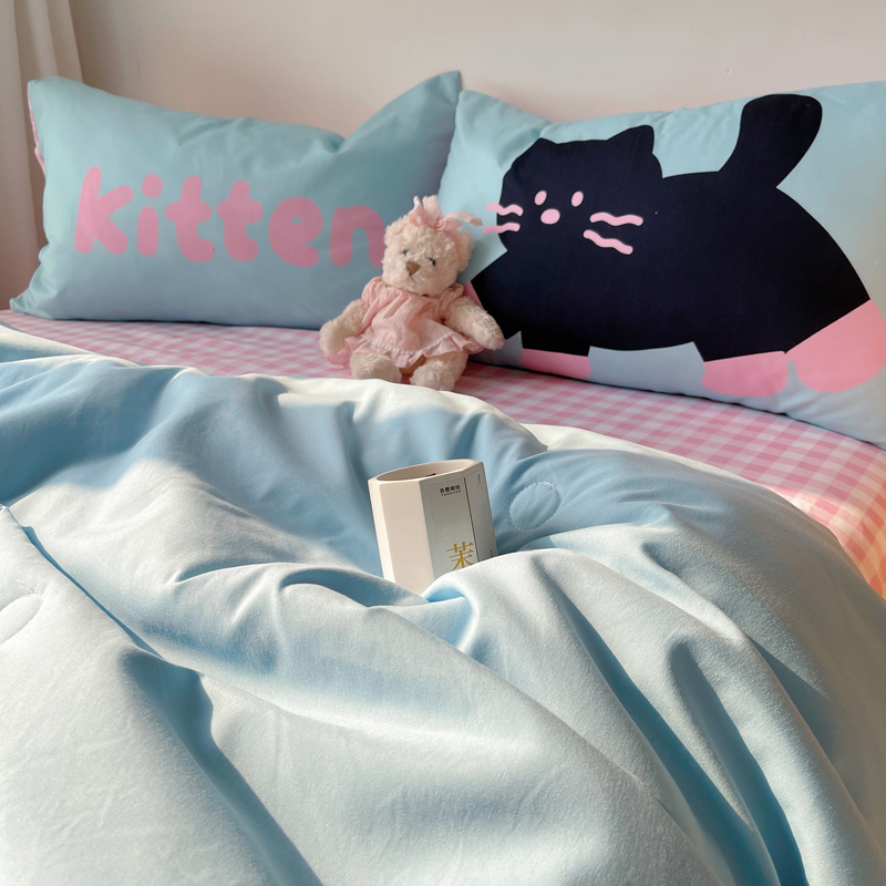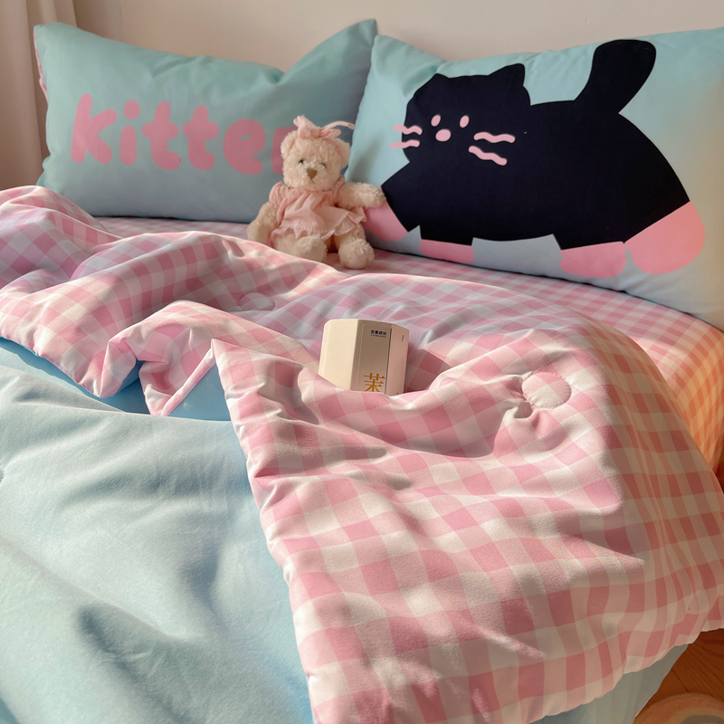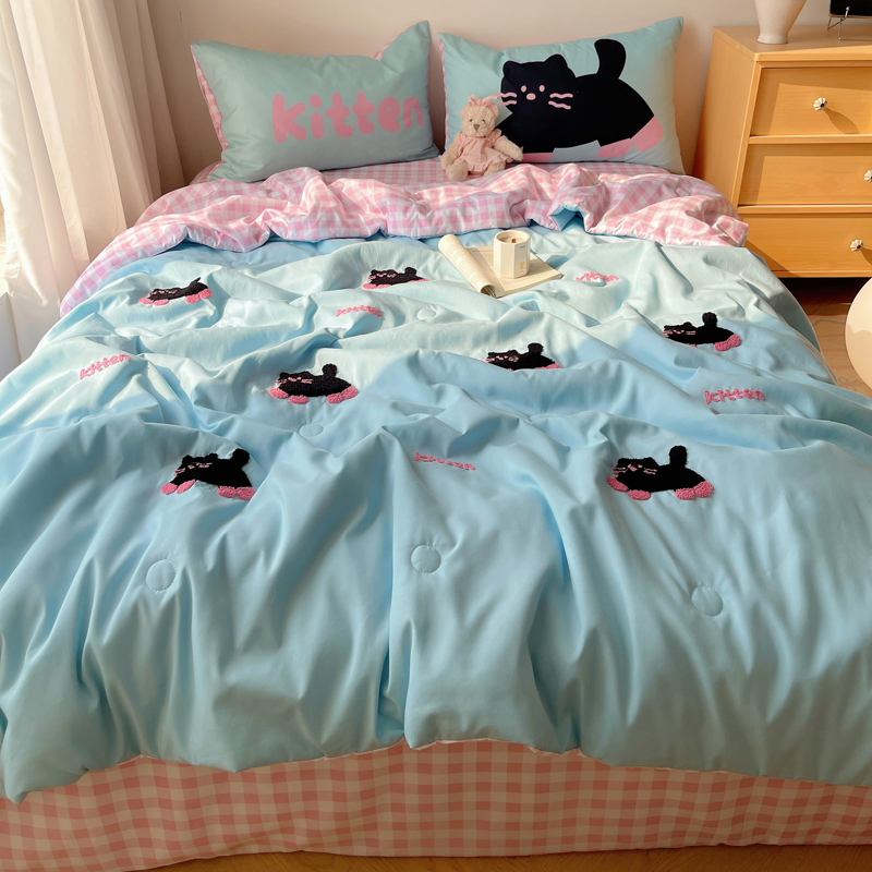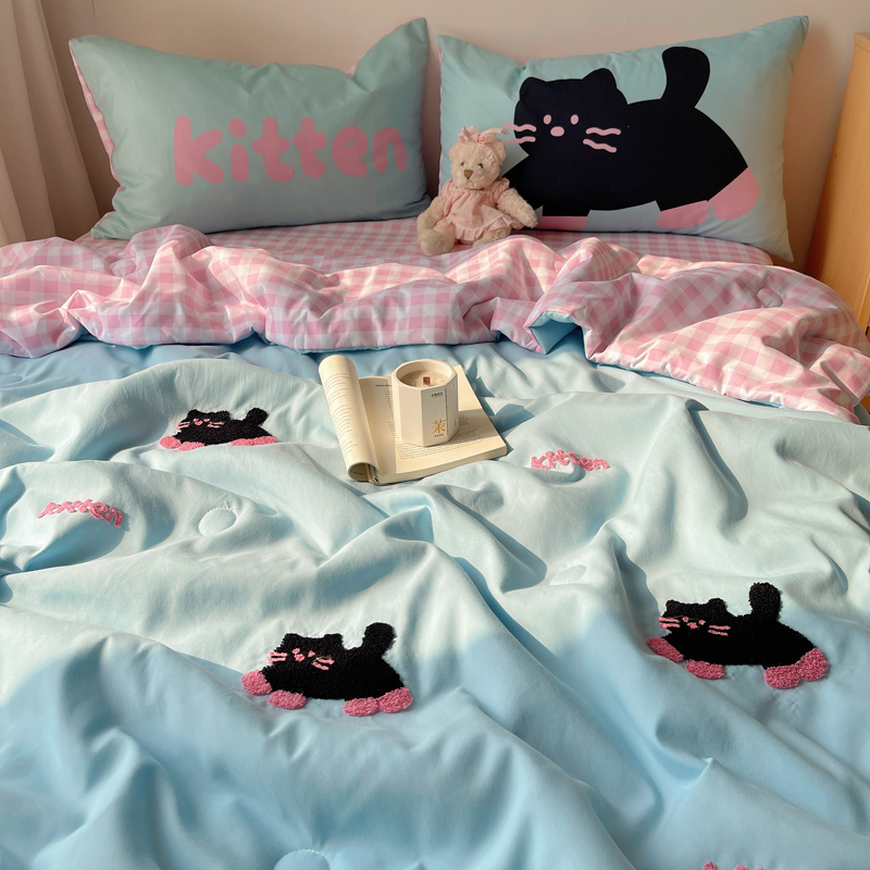 商品名称:桃喜 2025新款水洗棉毛巾绣单夏被被子被芯夏被套件(非全棉)系列1 粉格小黑猫
