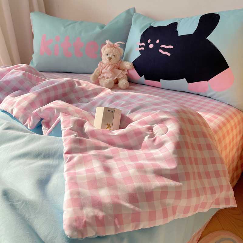 (总)桃喜 2025新款亲肤卡通系列四件套,黄格小熊,拼接甜心猫