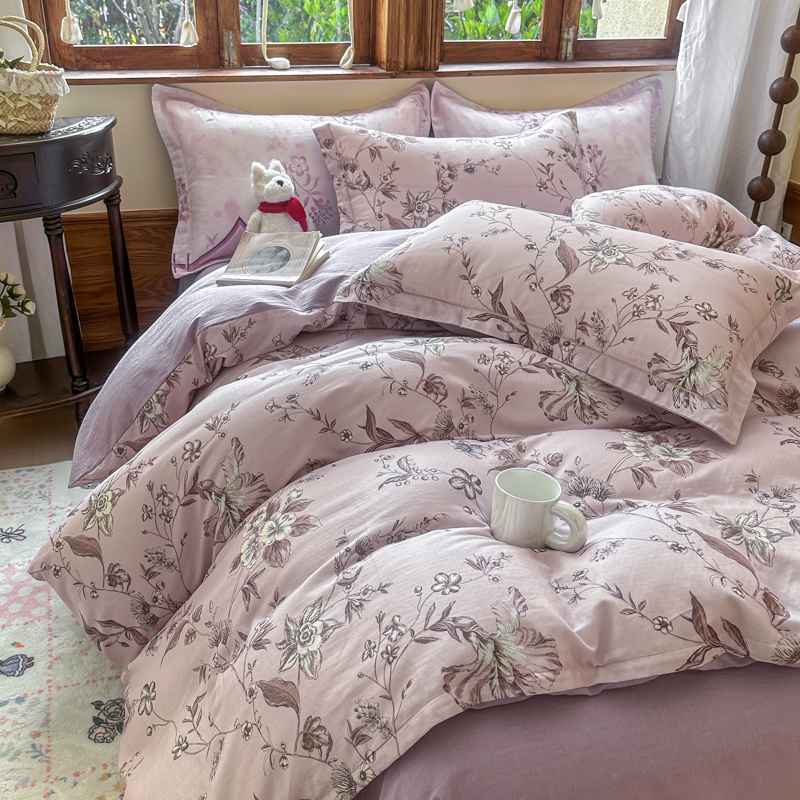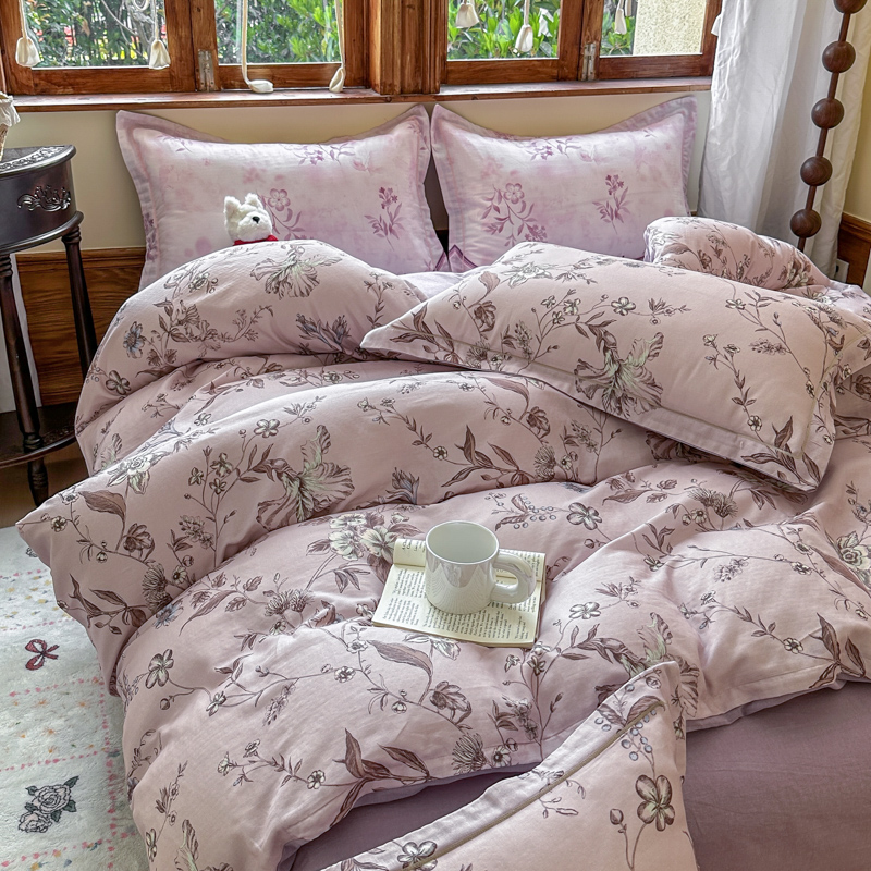 喜四方 2025新款全棉A类母婴级抗菌全棉双层纱四件套 雅莹-粉
