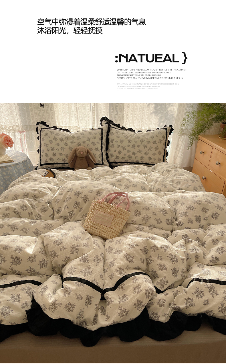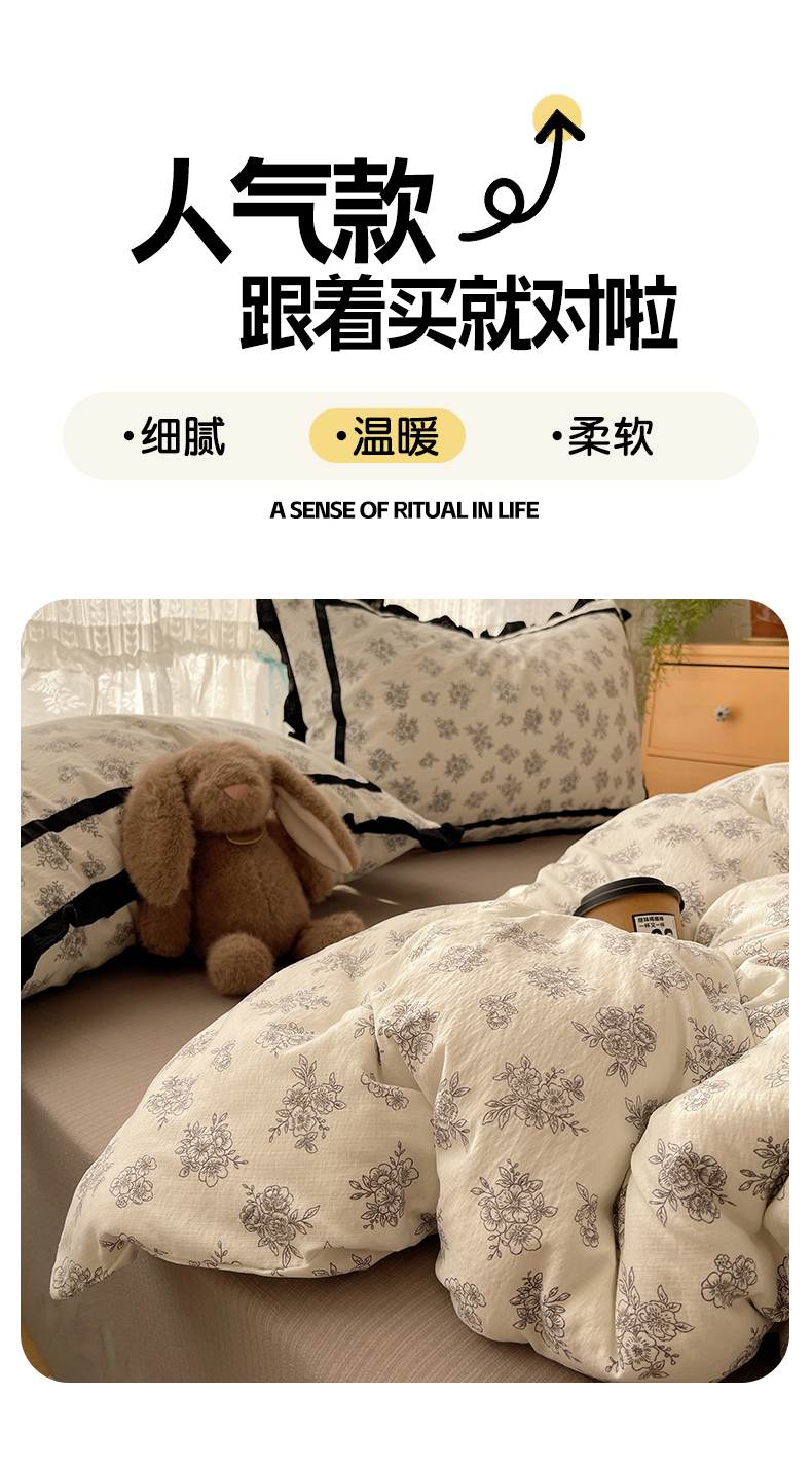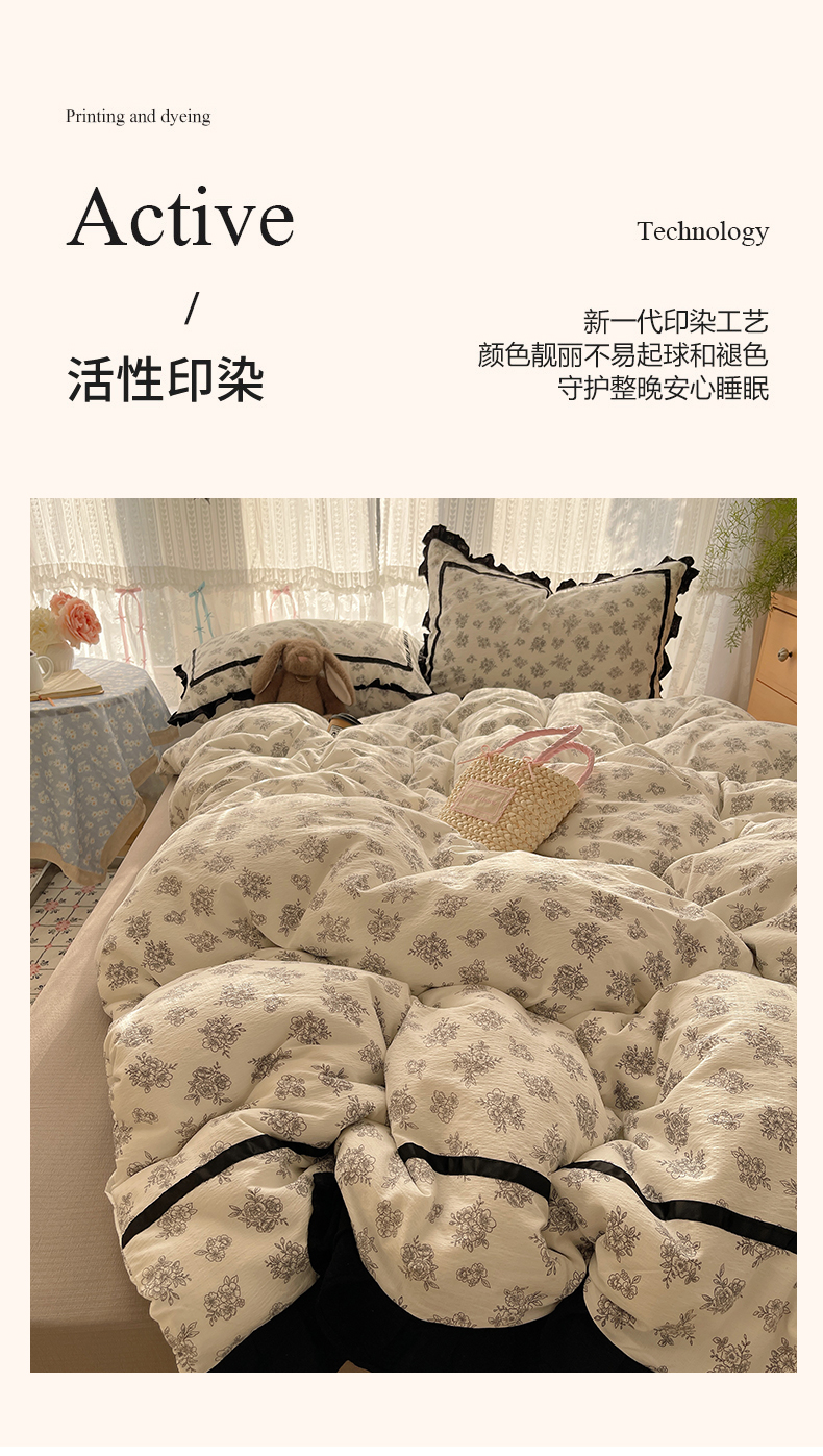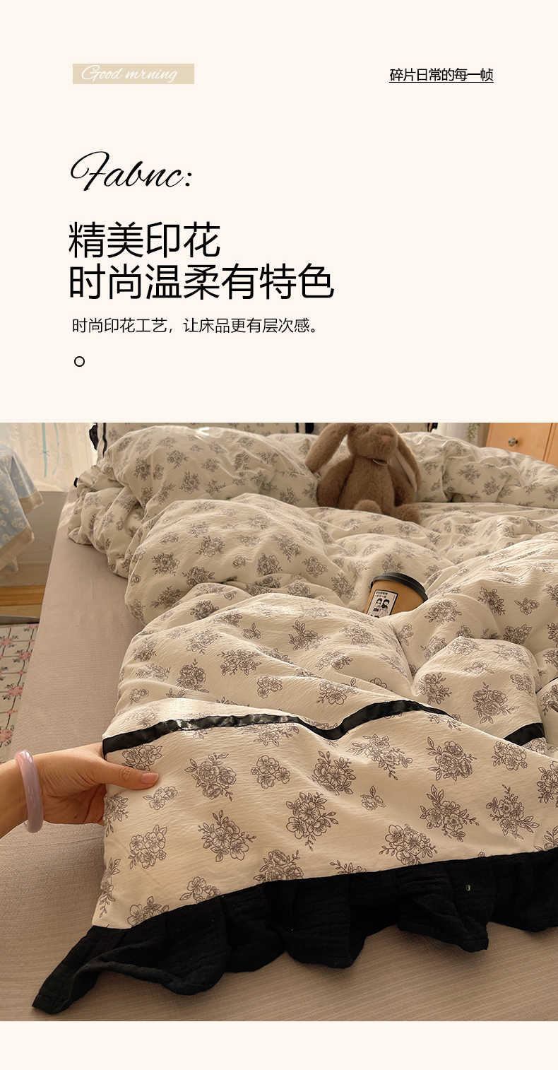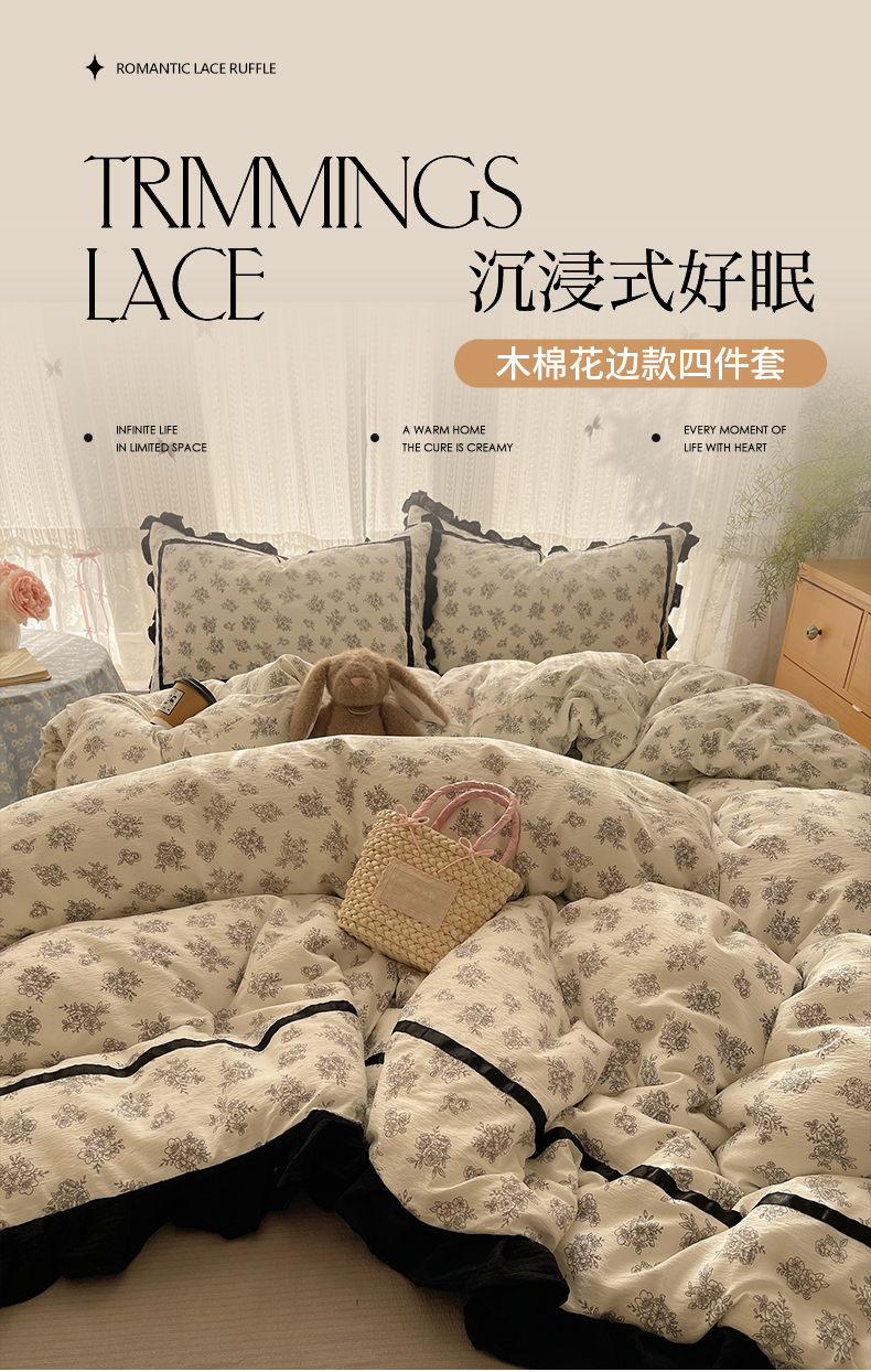 当前位置: 91家纺网 > 商品网购 > 床品套件 > 四件套 > 全棉普通四件套 > 繁花家居 2025新款云感木棉花边款法式印花四件套 夜皇后