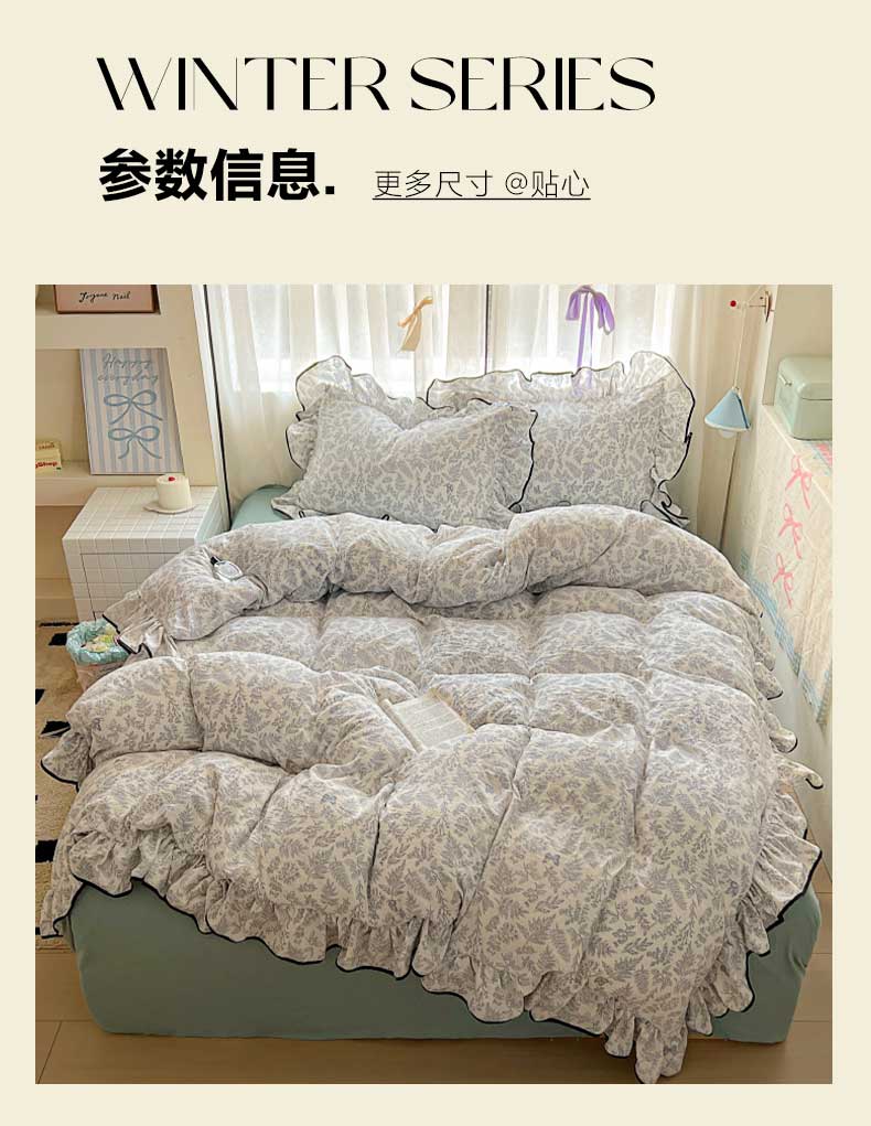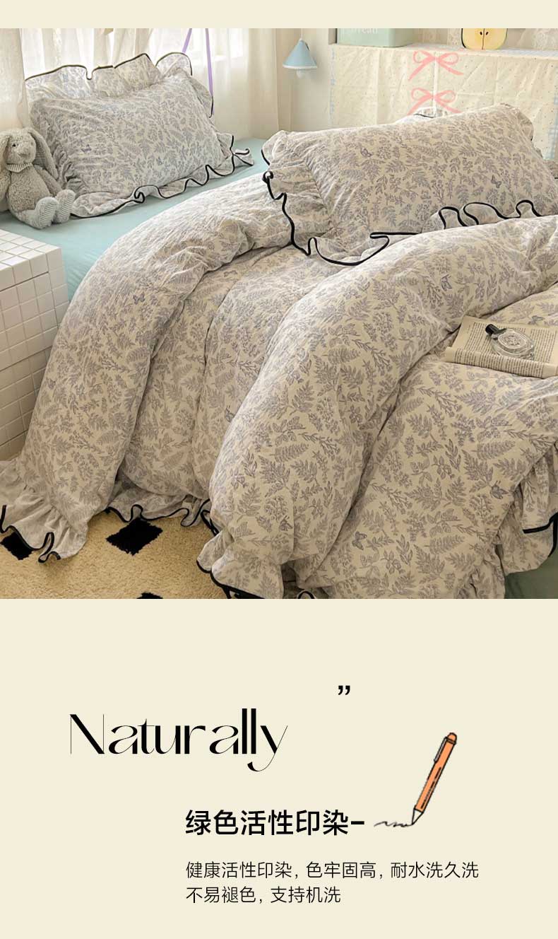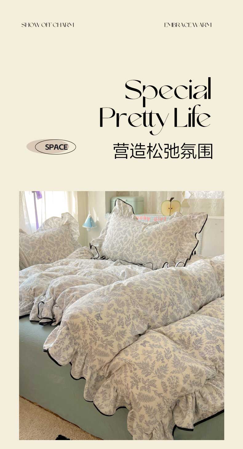 当前位置: 91家纺网 > 商品网购 > 床品套件 > 四件套 > 水洗棉四件套 > 繁花家居 2025春夏新款学生季韩式云感针织棉大花边木耳边四件套 花枝蝶影