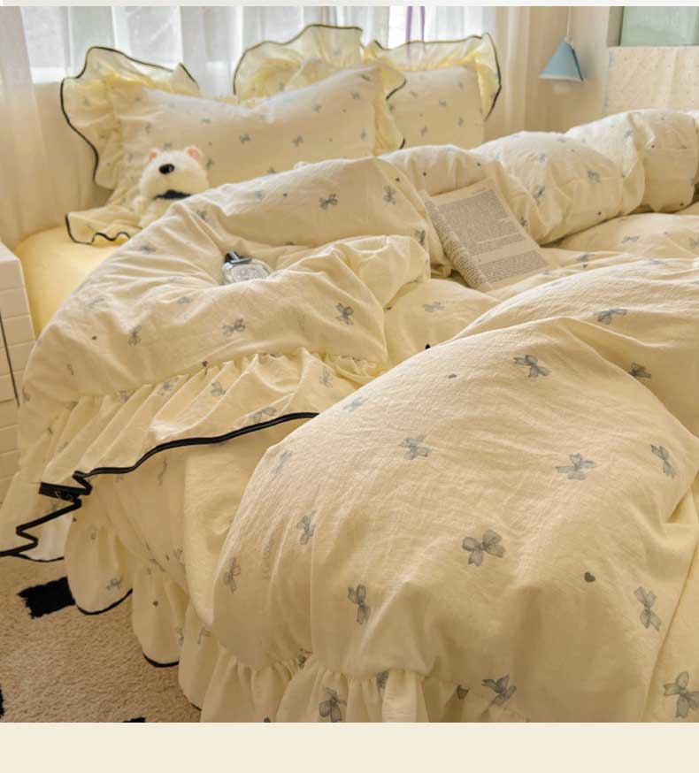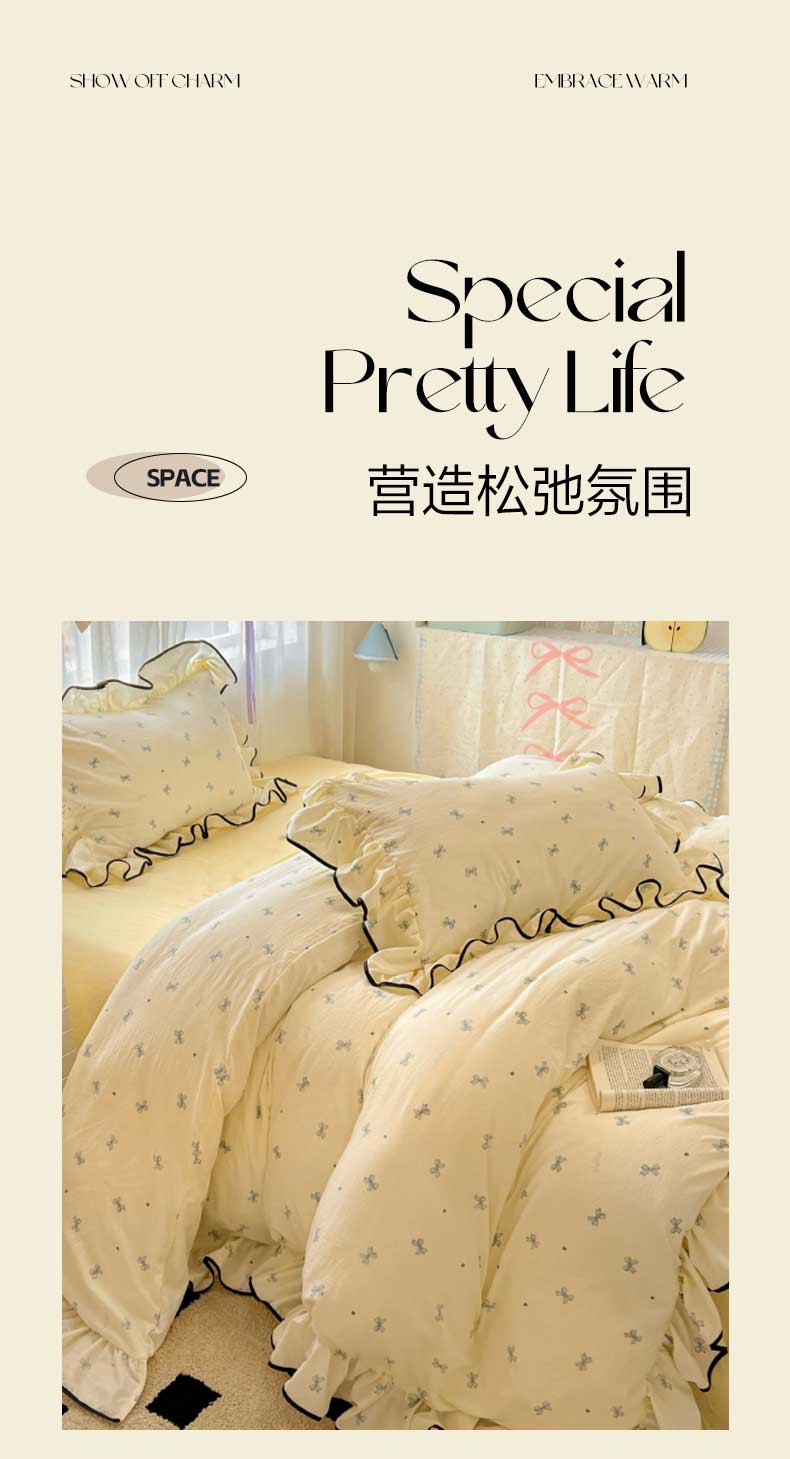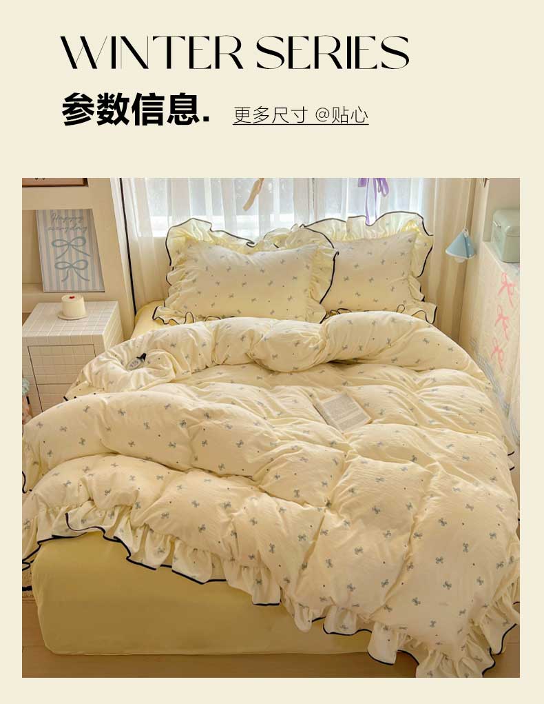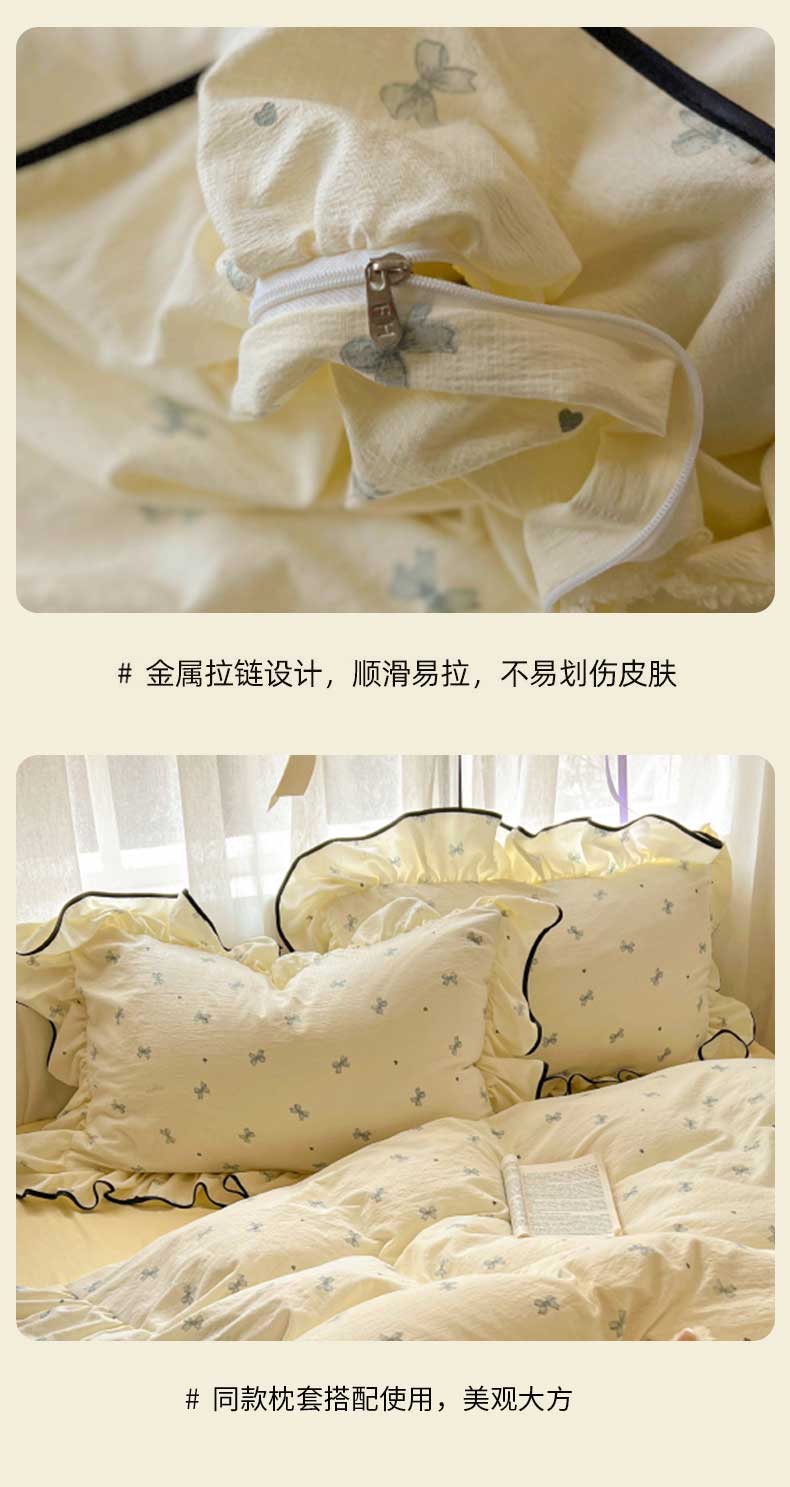 当前位置: 91家纺网 > 商品网购 > 床品套件 > 四件套 > 水洗棉四件套 > 繁花家居 2025春夏新款学生季韩式云感针织棉大花边木耳边四件套 芝士少女心结
