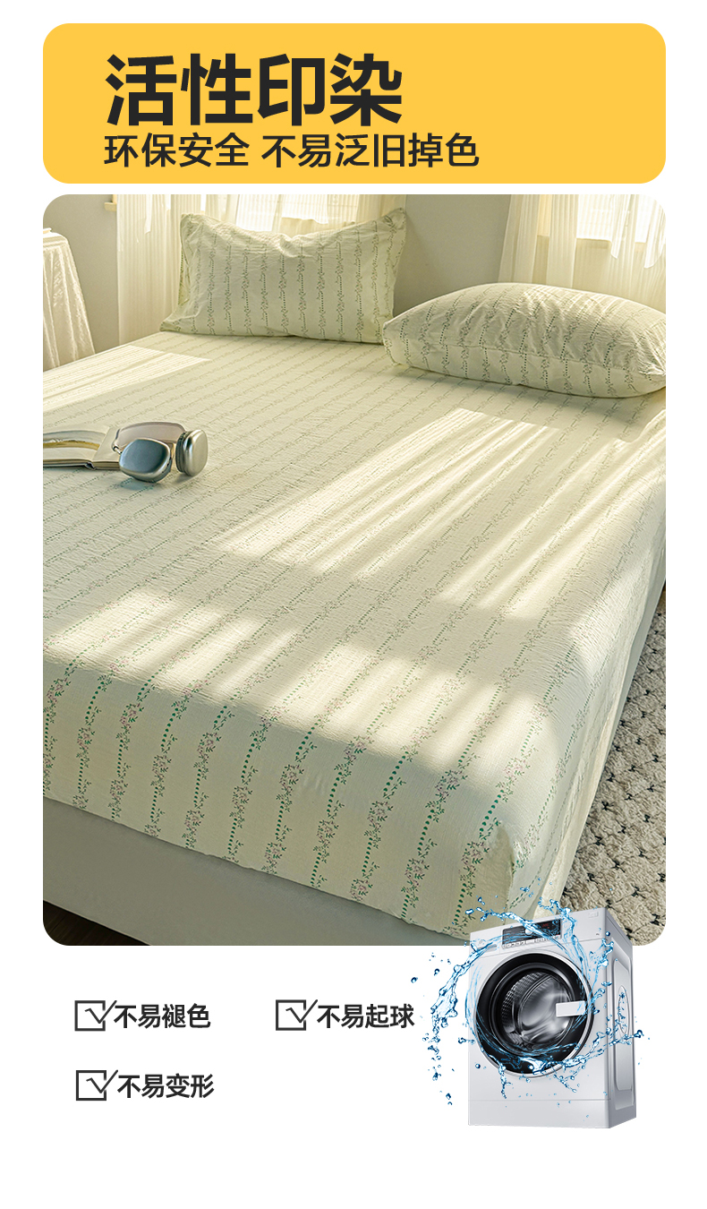• 91家纺网 家纺一手货源 找家纺 多品家纺 2025新款超柔云感双层纱水洗棉单品床笠 绿藤