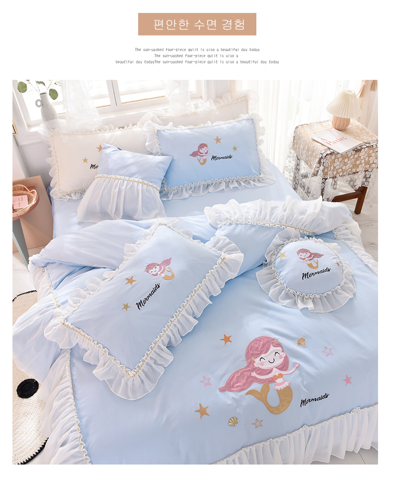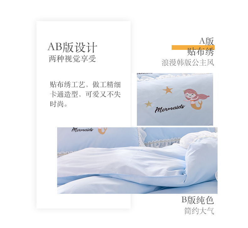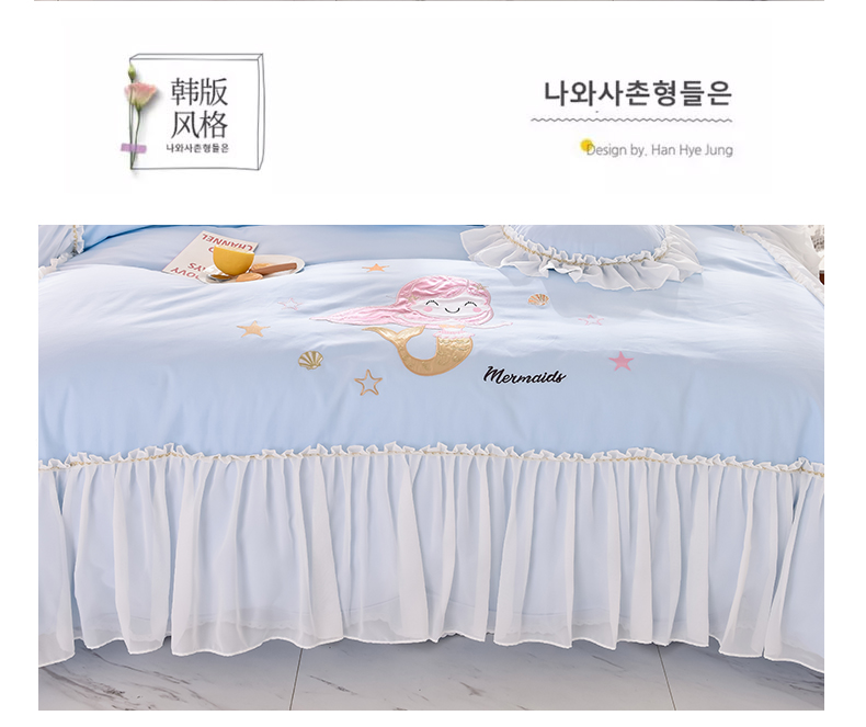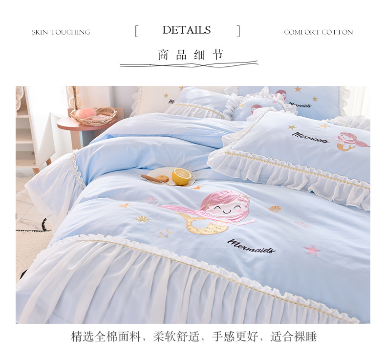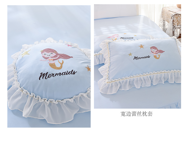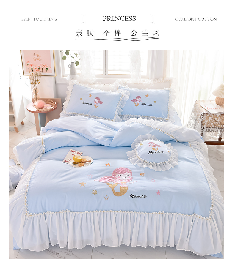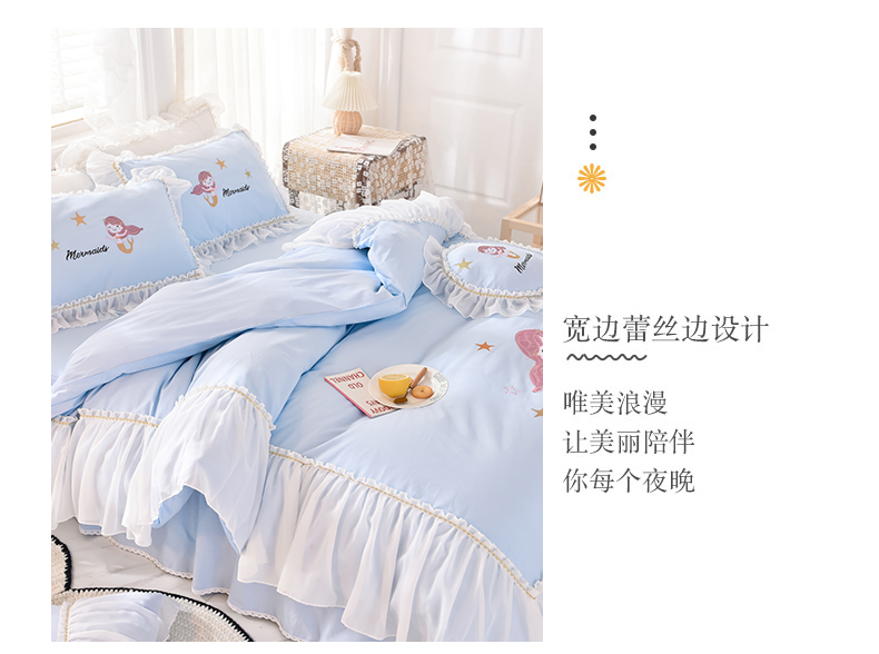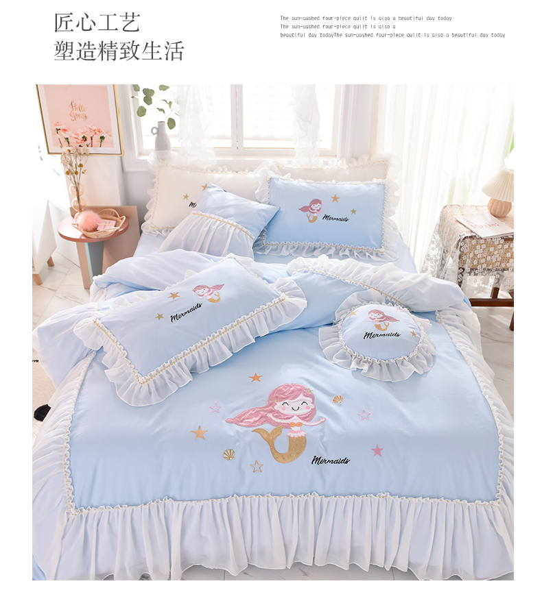 商品名称:花香四季家纺 2025新款13376纯棉贴布刺绣雪纺纱四件套-人鱼小姐 人鱼小姐蓝