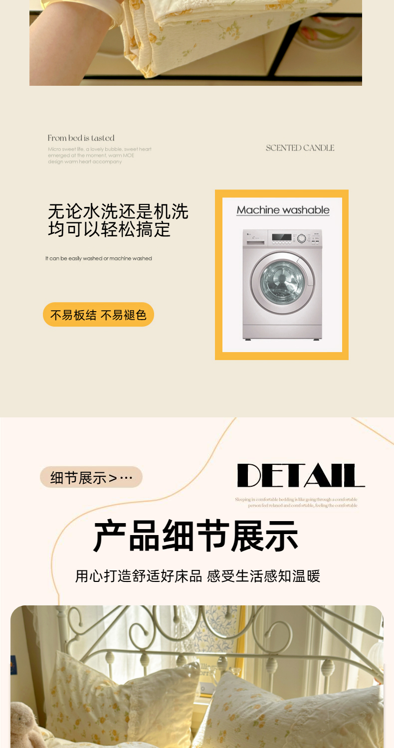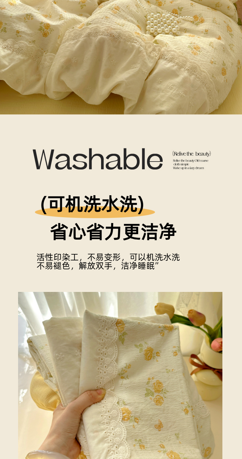 商品名称:(总)思诺羽床笠 2025新款A类法式小清新皱皱纱花边蕾丝水洗棉床上四件套宿舍床笠三件套