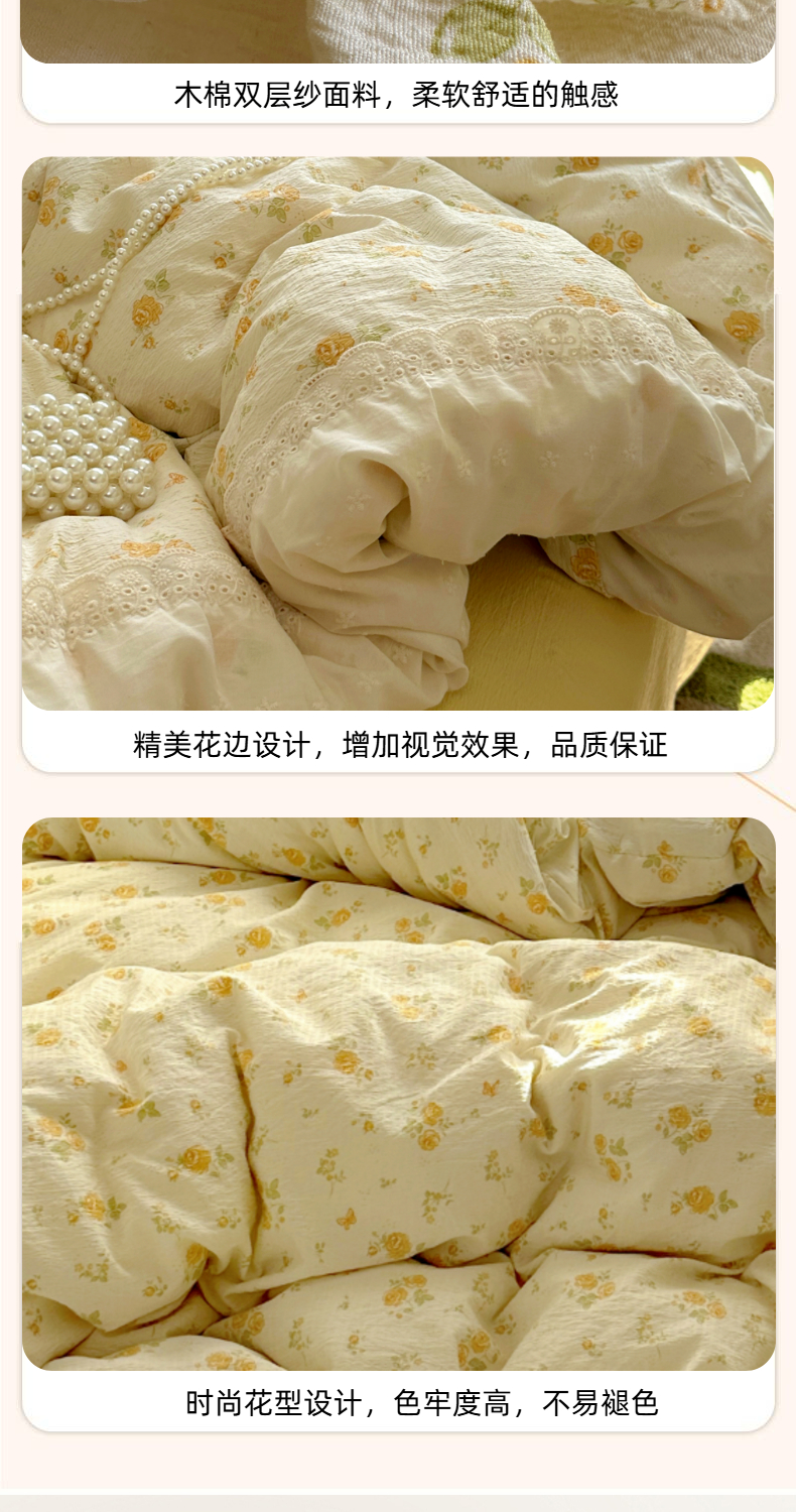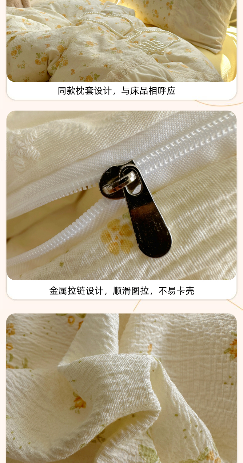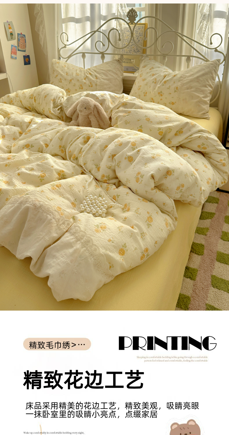 (总)思诺羽床笠 2025新款A类法式小清新皱皱纱花边蕾丝水洗棉床上四件套宿舍床笠三件套,草莓心情,蝶影,繁花千朵,黄色玫瑰,奶油波点,浓情郁金香,兔兔世界,紫色浪漫