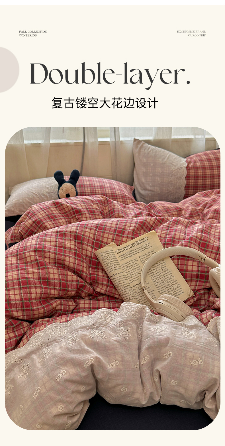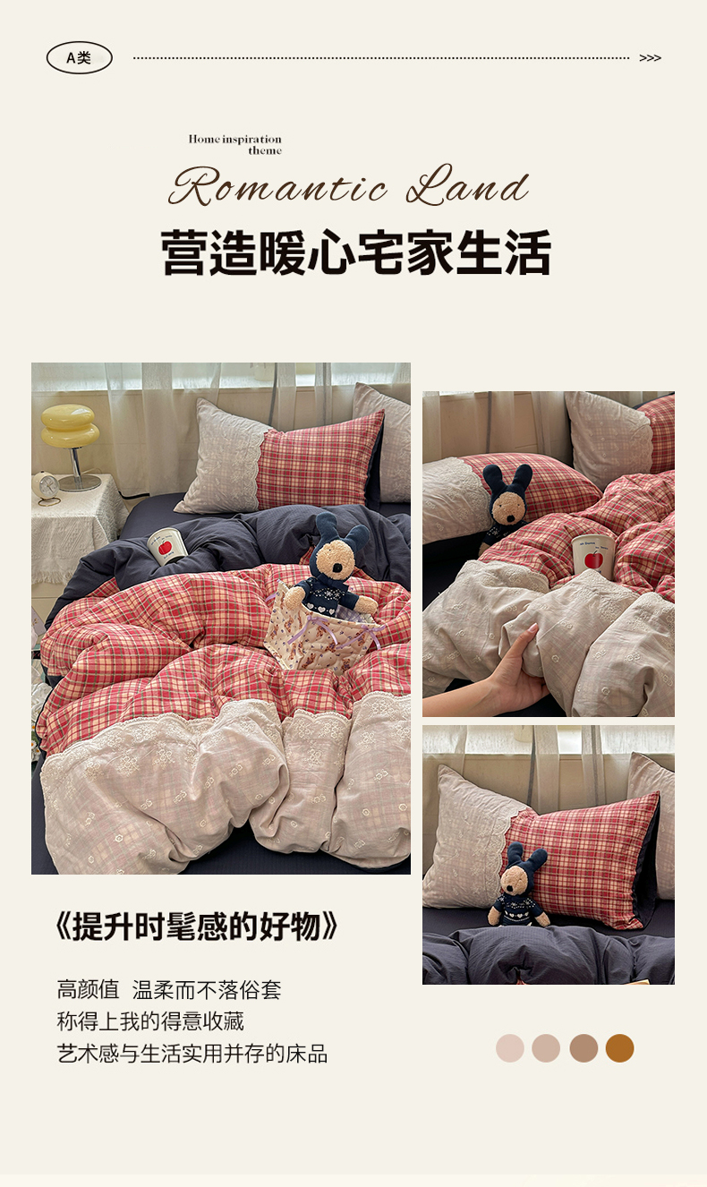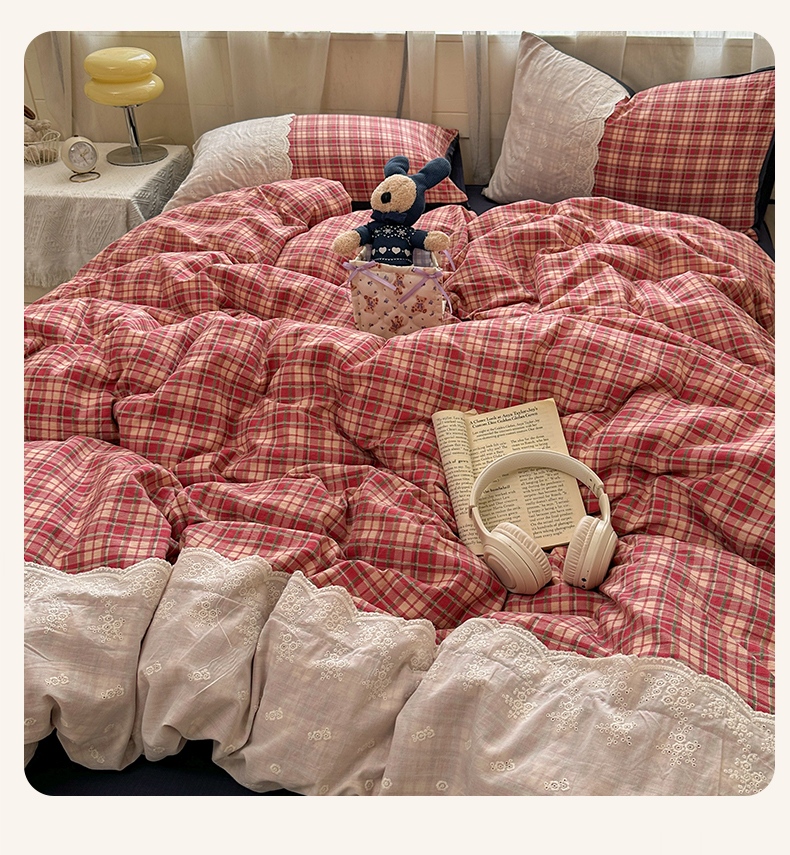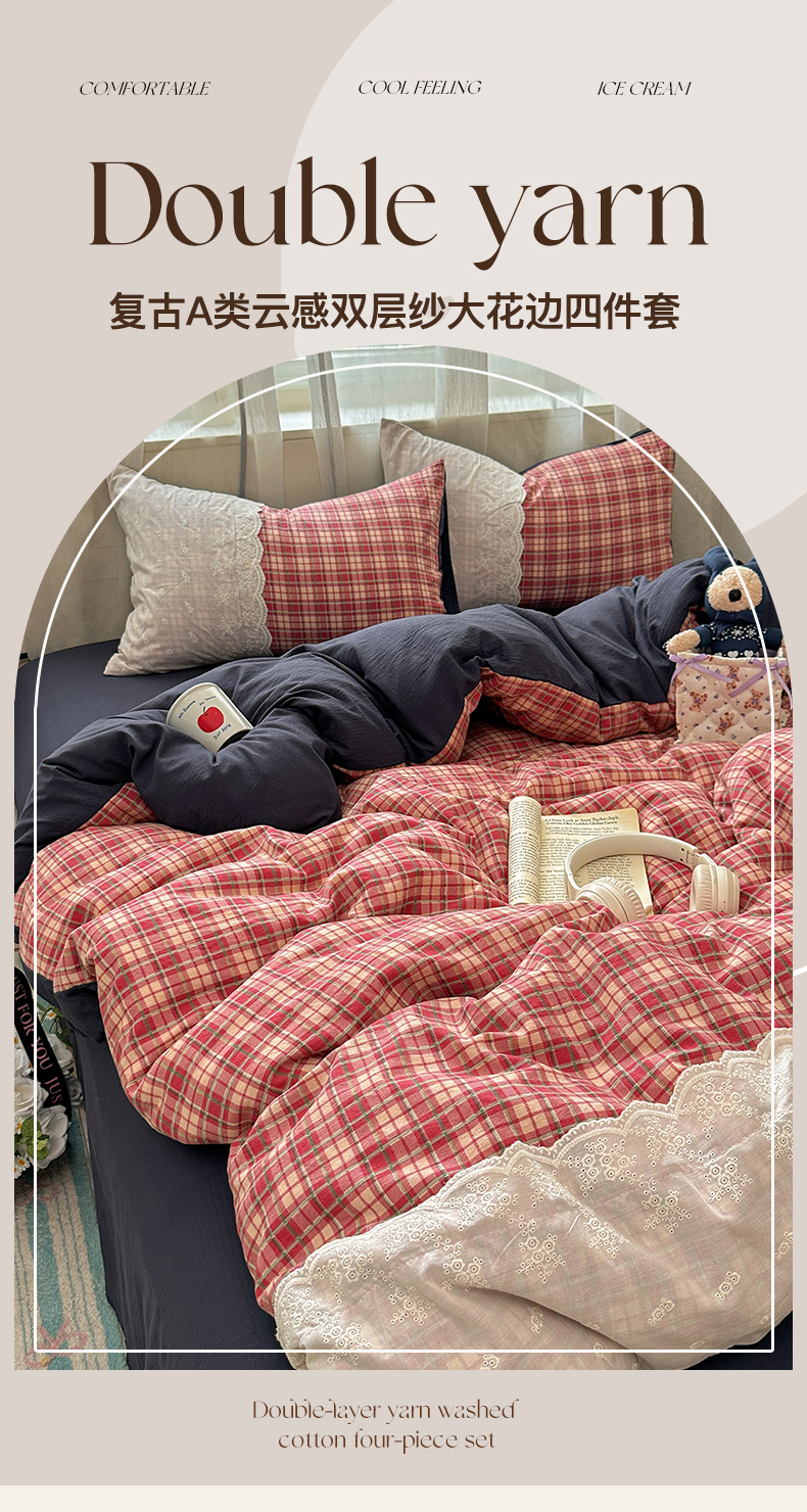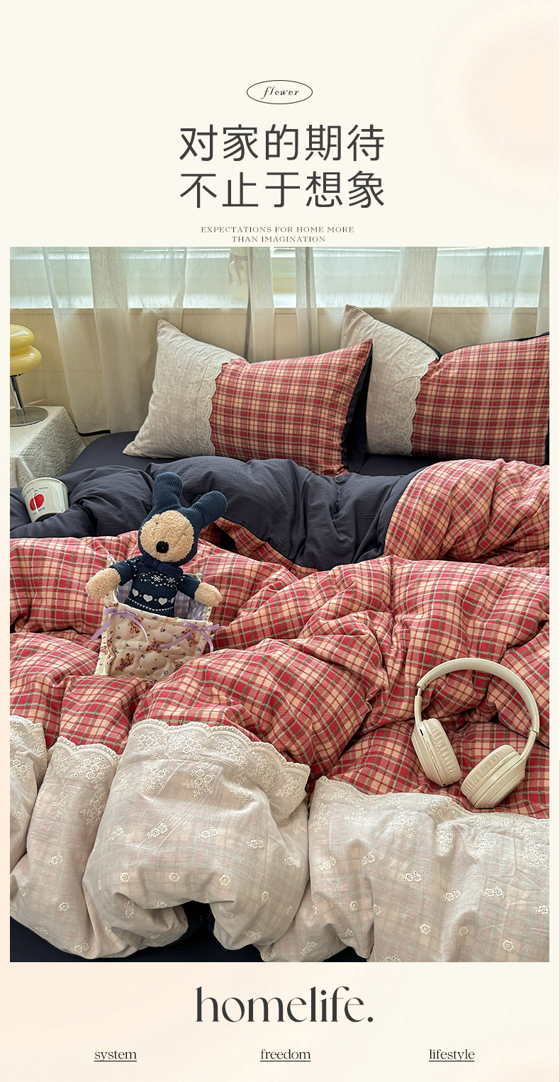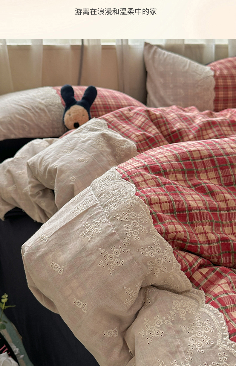 当前位置: 91家纺网 > 商品网购 > 床品套件 > 四件套 > 其它四件套 > 晚爱家纺(原晚安家居) 2025新款韩系少女风蕾丝花边四件套云感木棉双层纱-苏菲 苏菲·大红格