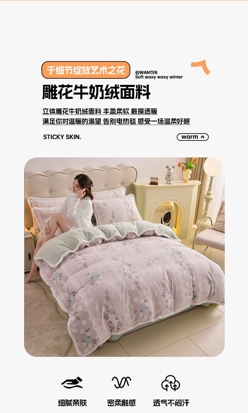 (总)芯诗曼家纺 2025新款兔毛绒兔兔绒大包边立体雕花绒印花牛奶绒四件套,多彩蝴蝶结,多彩生活,花满园,花样年华,曼妙花语-粉,曼妙花语-灰