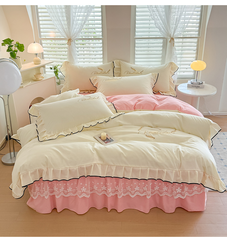 (总)柔享家 2025新款法式花边蕾丝床裙床笠床单水洗棉磨毛四件套-恩格斯,藏蓝+天际蓝,豆沙+浅灰,粉玉+嫩绿,米黄+粉玉,嫩绿+米黄,浅灰+浅灰,天际蓝+宝石蓝,丁香紫+香芋紫