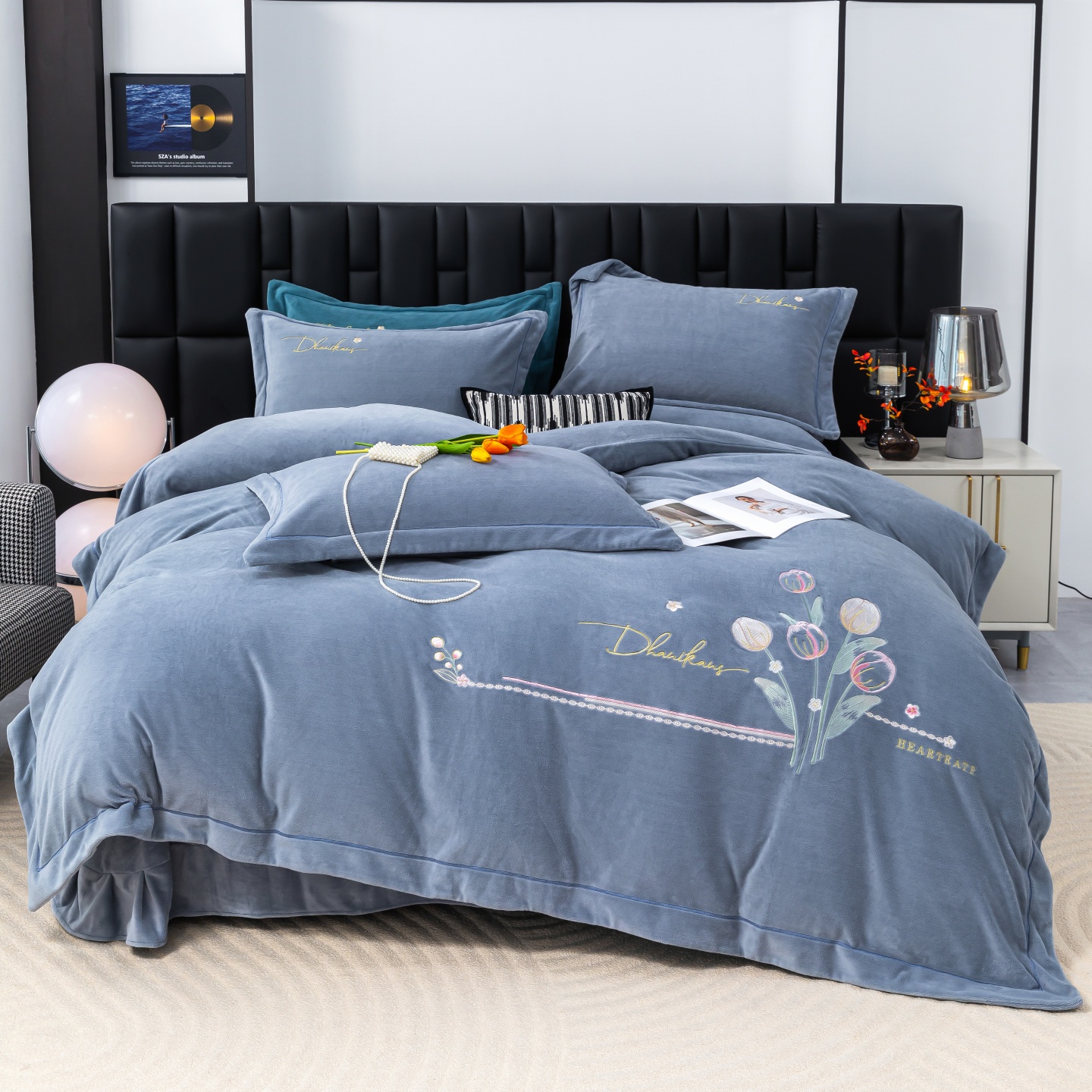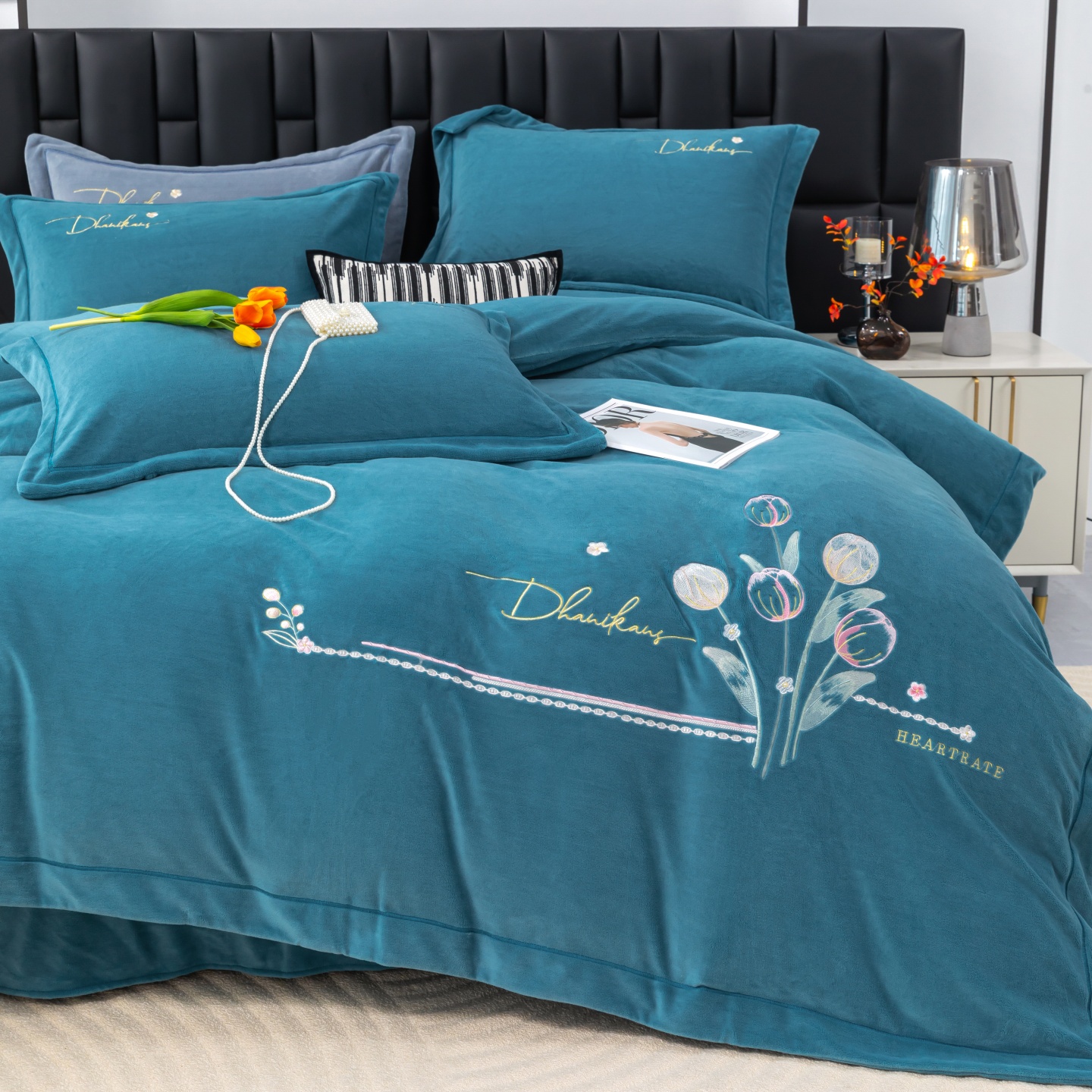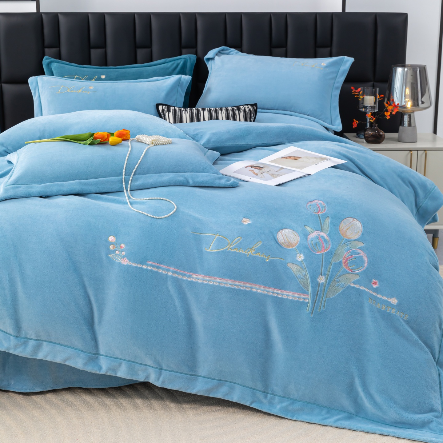 优姿家纺 2025新款10斤牛奶绒宽边绣花保暖四件套-郁金花香 郁金花香-天兰