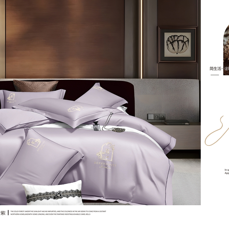 商品名称:2025新款60s支贡缎长绒棉刺绣花四件套纯棉全棉100%棉轻奢风四件套 艾尚-薰衣紫