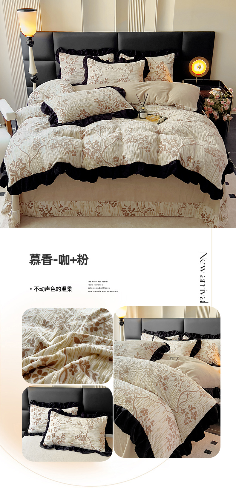 (总)找底底家纺 2025新款花边9-10斤牛奶绒床盖款四件套,花妖,梨花落,小樱桃,紫蔻