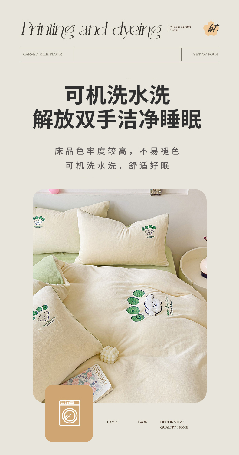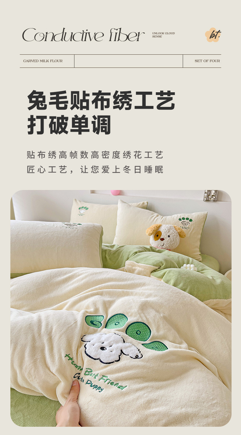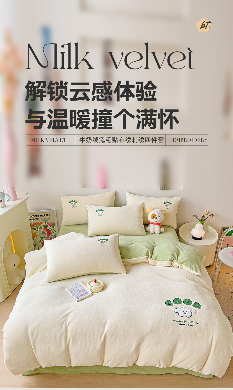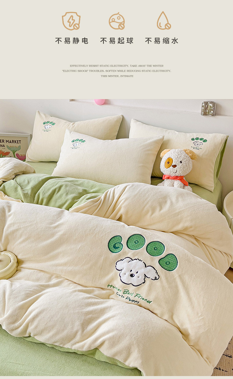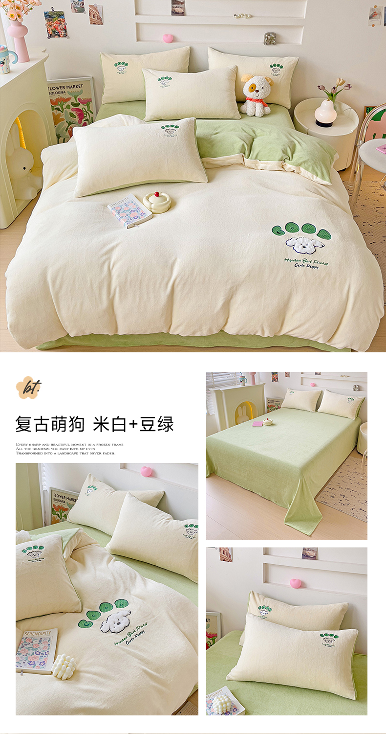当前位置: 91家纺网 > 商品网购 > 床品套件 > 四件套 > 牛奶绒四件套 > 眷恋家纺 2025新款牛奶绒毛巾绣四件套 复古萌狗-米白+豆绿