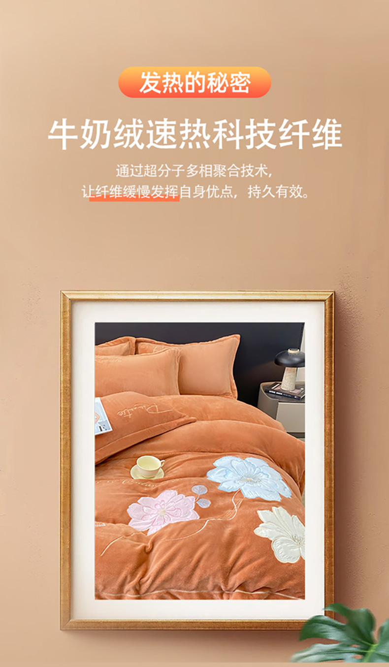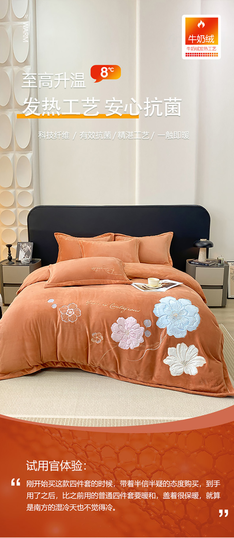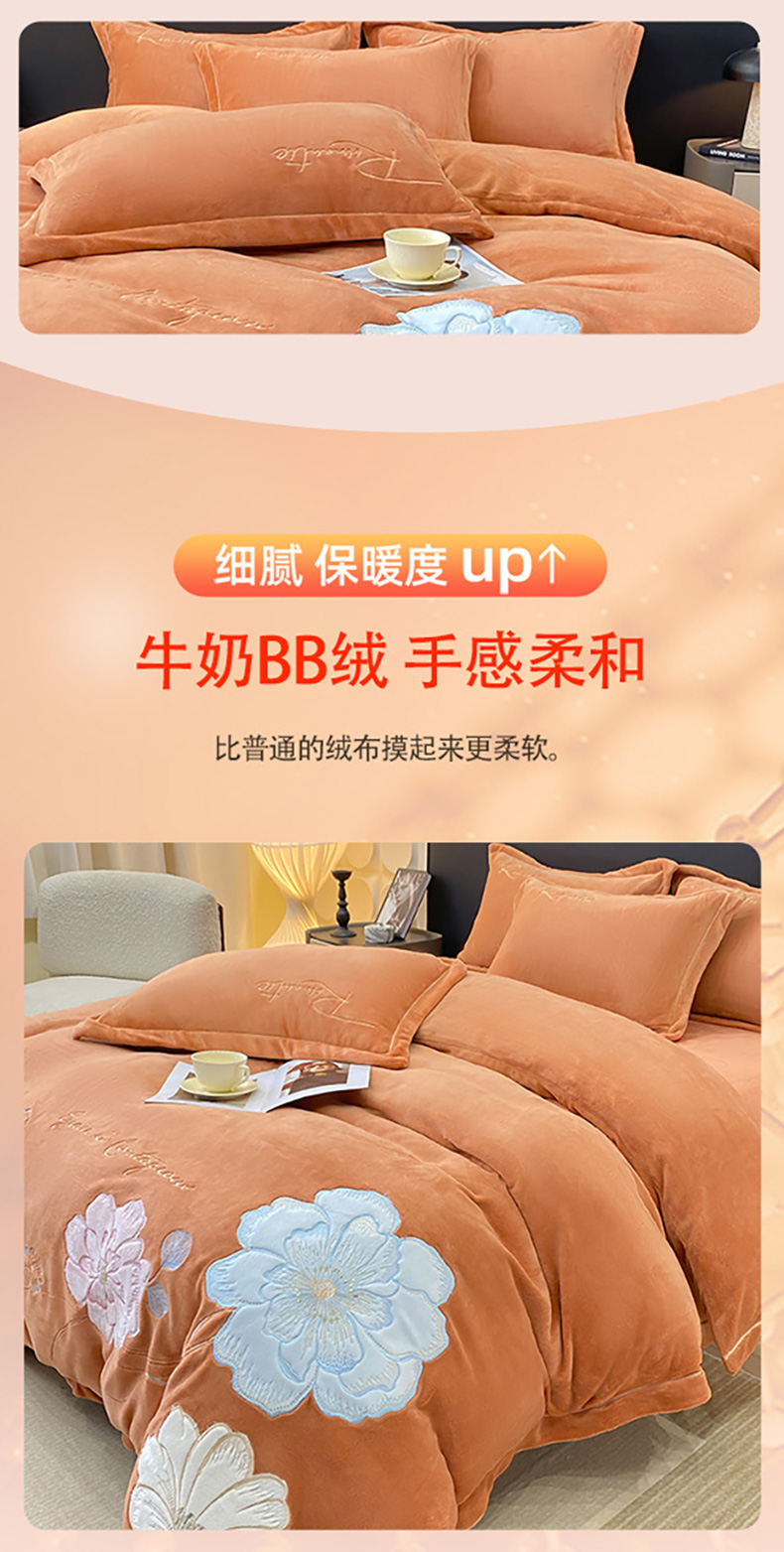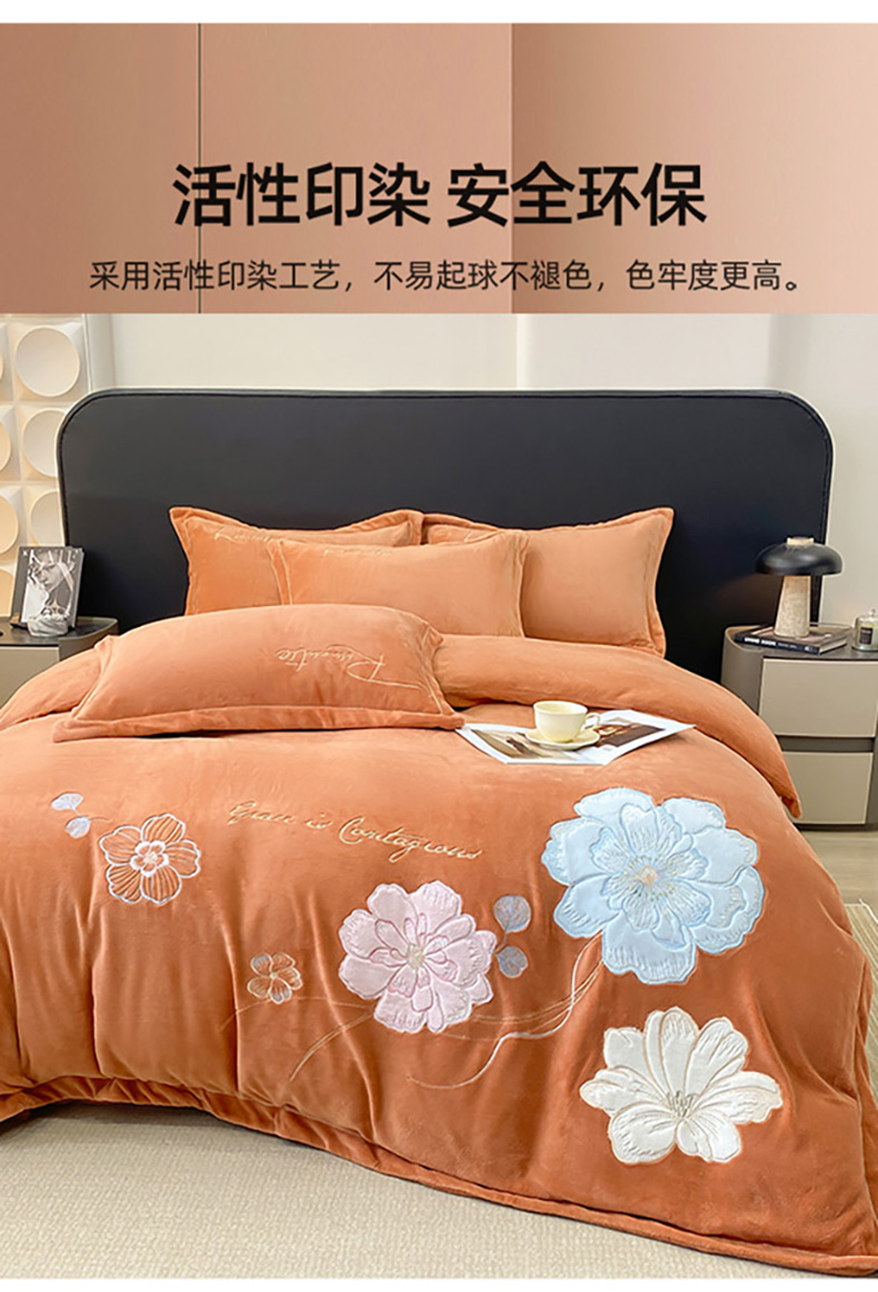 商品名称:悦织湾家纺 2025新款9斤重牛奶绒四件套纯色贴布绣人件富贵系列240克重高密保暖轻奢时尚床上用品4件套 黛西-南瓜橘