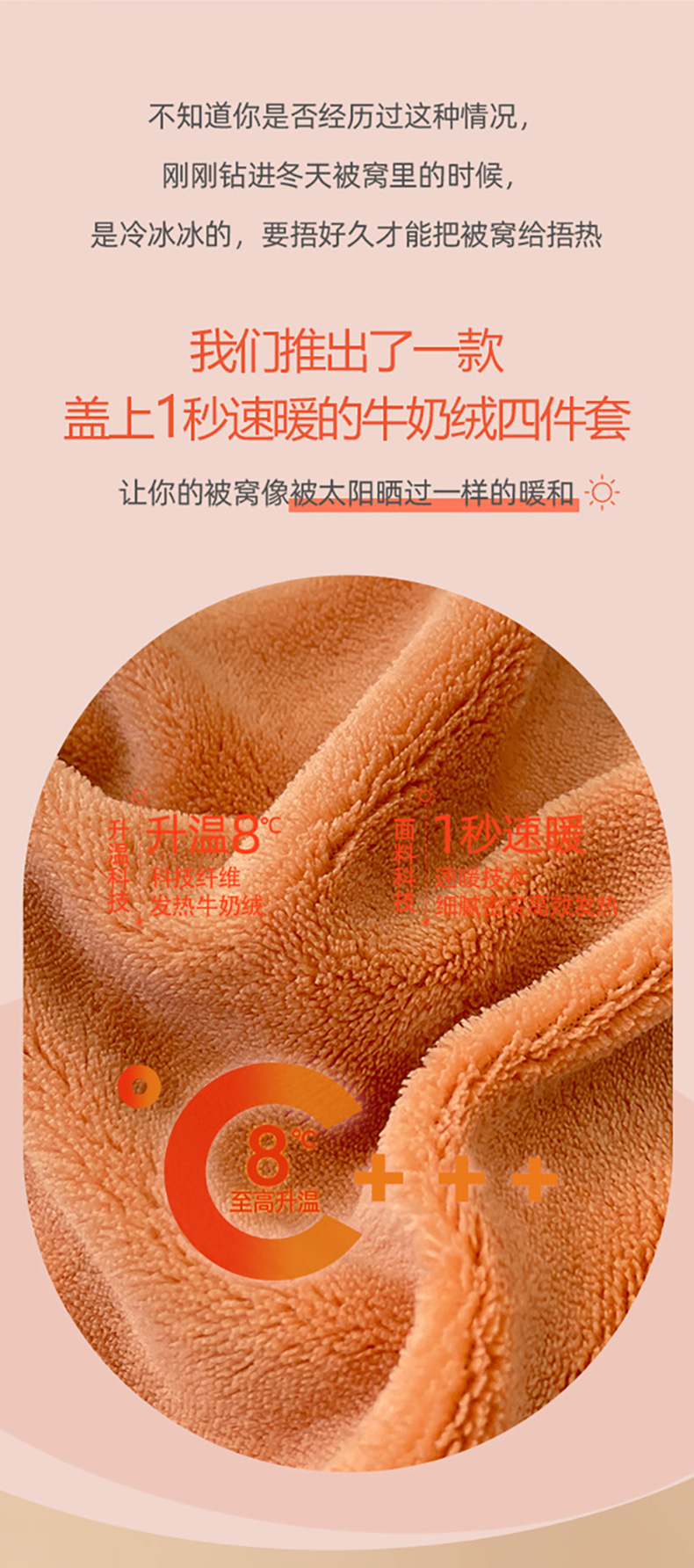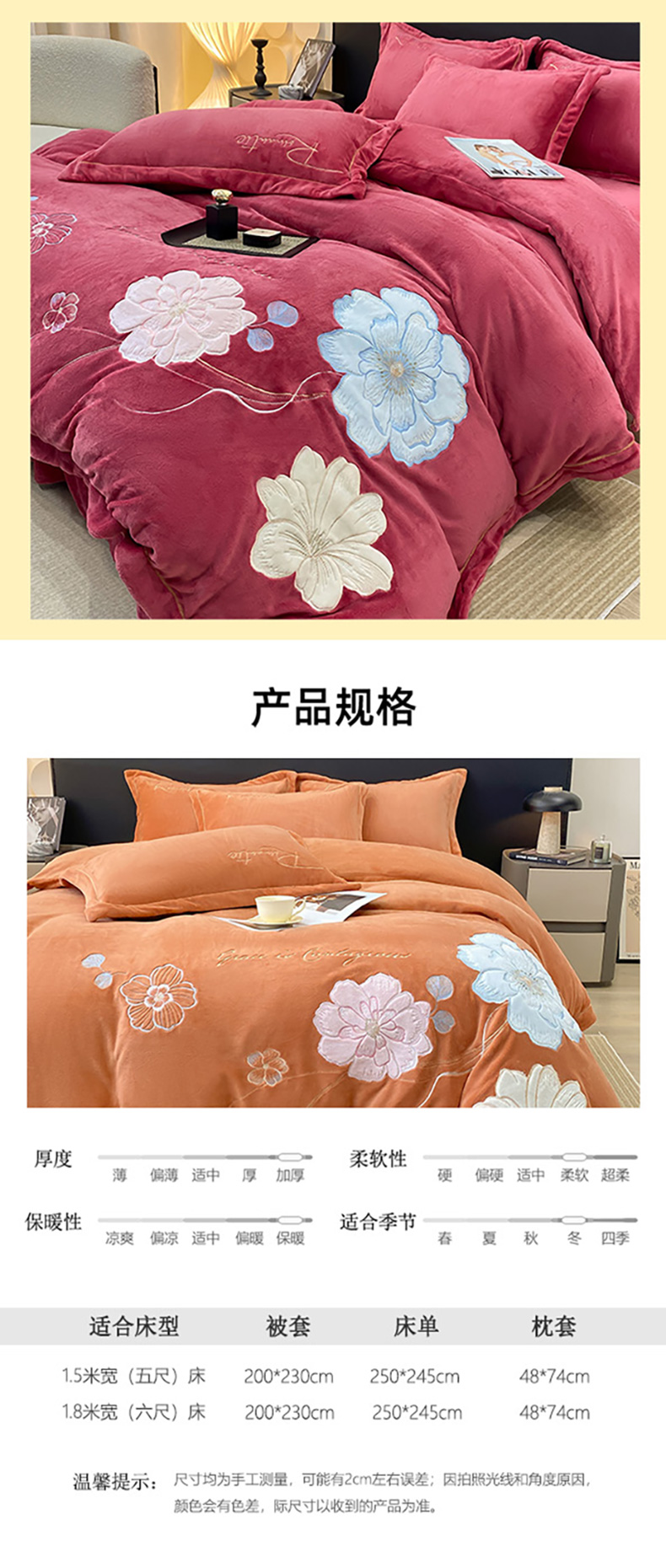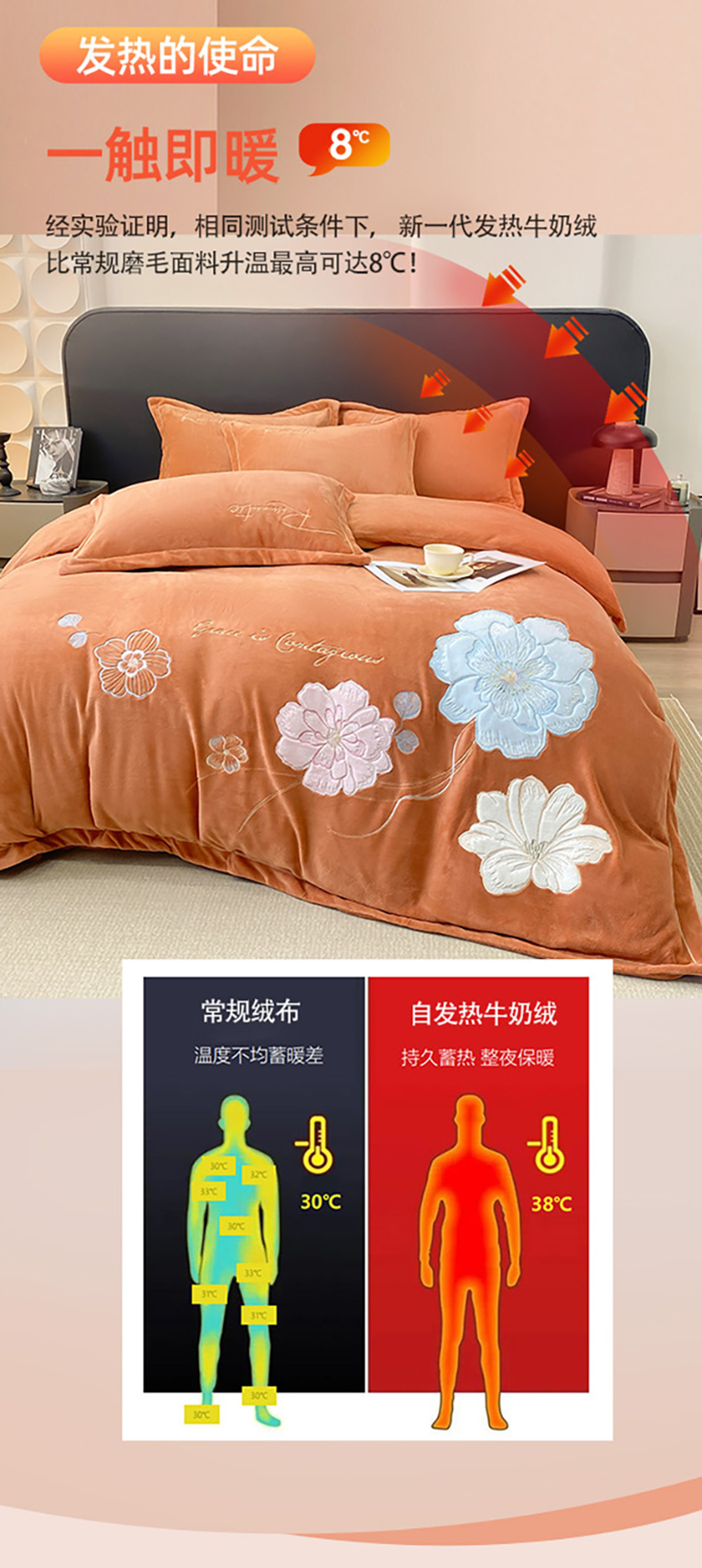 商品名称:悦织湾家纺 2025新款9斤重牛奶绒四件套纯色贴布绣人件富贵系列240克重高密保暖轻奢时尚床上用品4件套 黛西-南瓜橘
