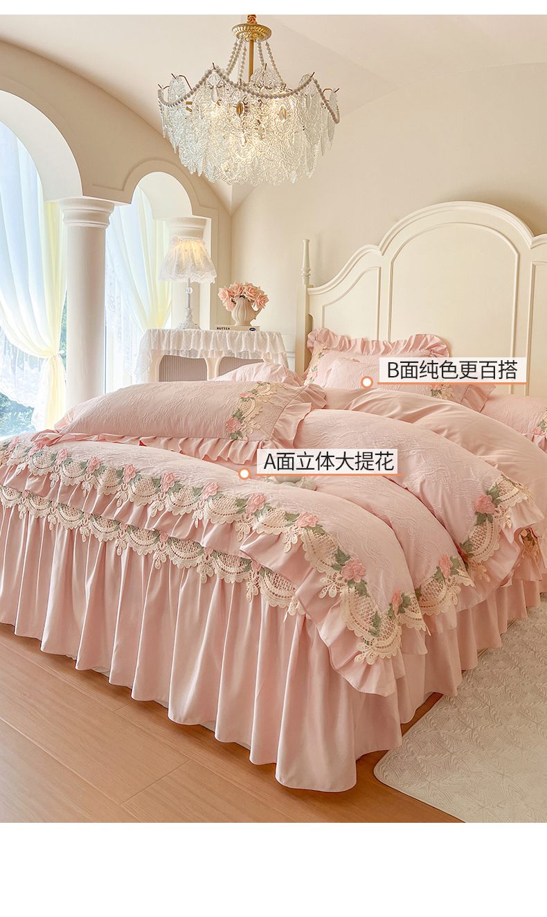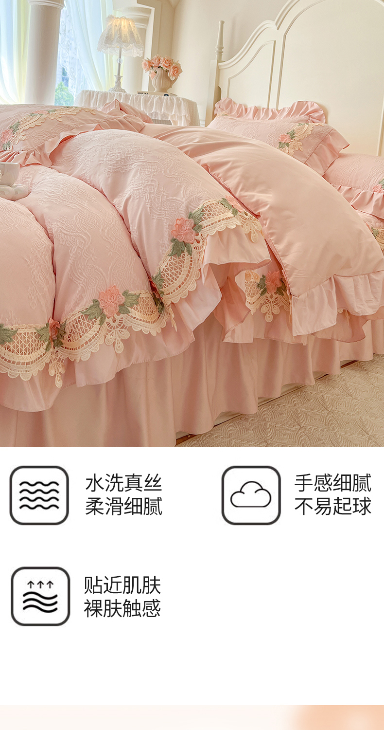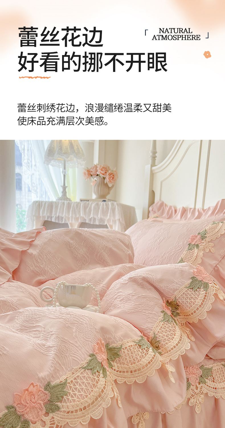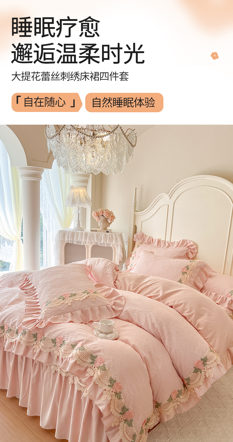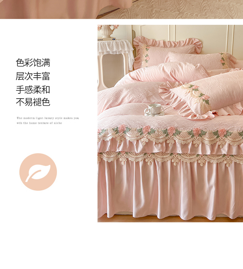 当前位置: 91家纺网 > 商品网购 > 床品套件 > 四件套 > 其它四件套 > 网红馆(ck家纺) 2025新款水洗真丝蕾丝刺绣床裙四件套-慕尚 嫩粉