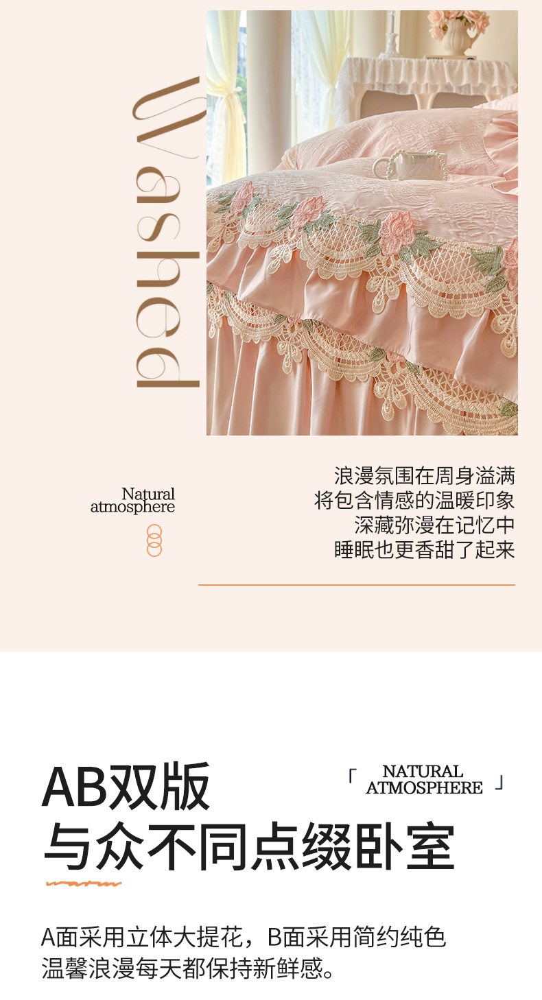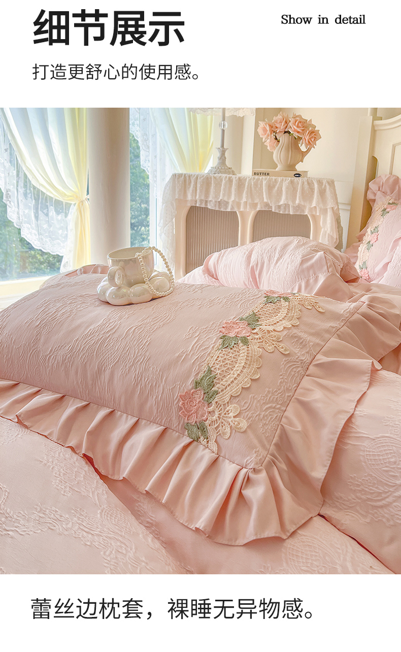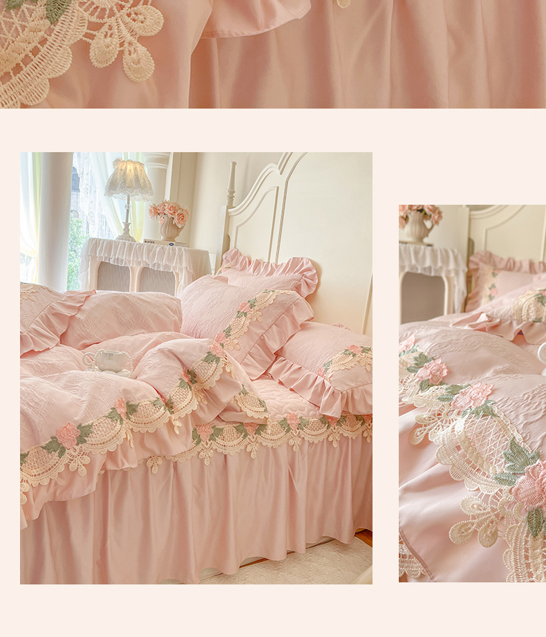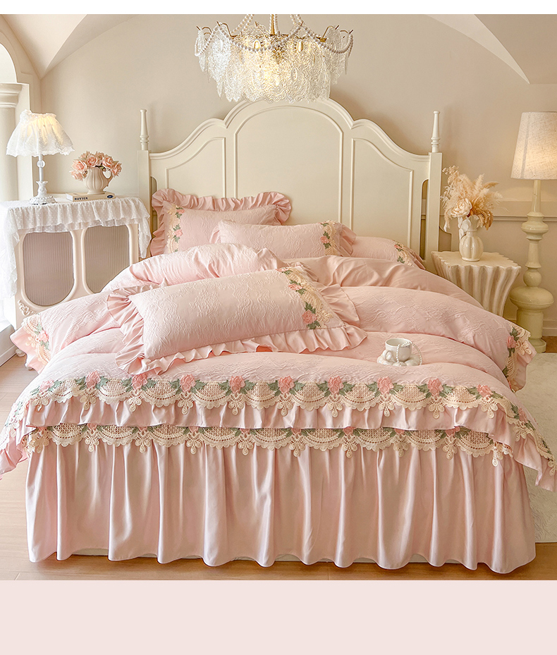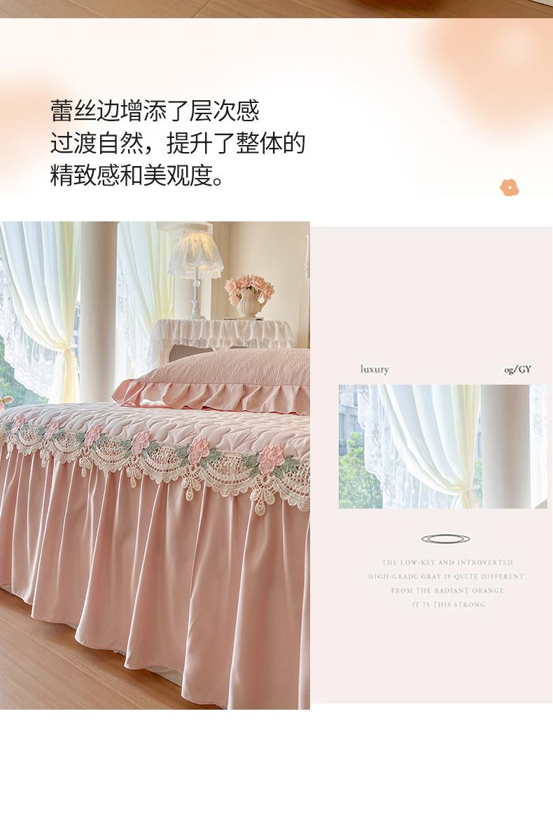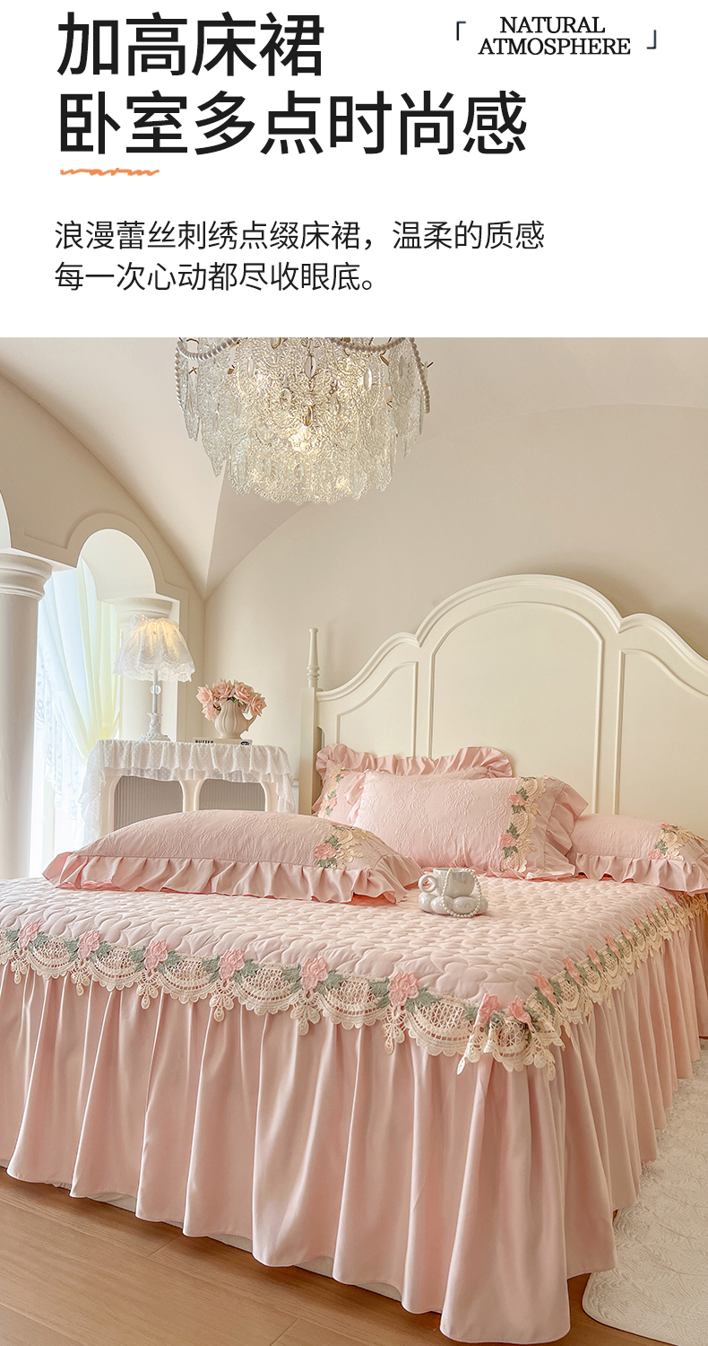当前位置: 91家纺网 > 商品网购 > 床品套件 > 四件套 > 其它四件套 > 网红馆(ck家纺) 2025新款水洗真丝蕾丝刺绣床裙四件套-慕尚 嫩粉