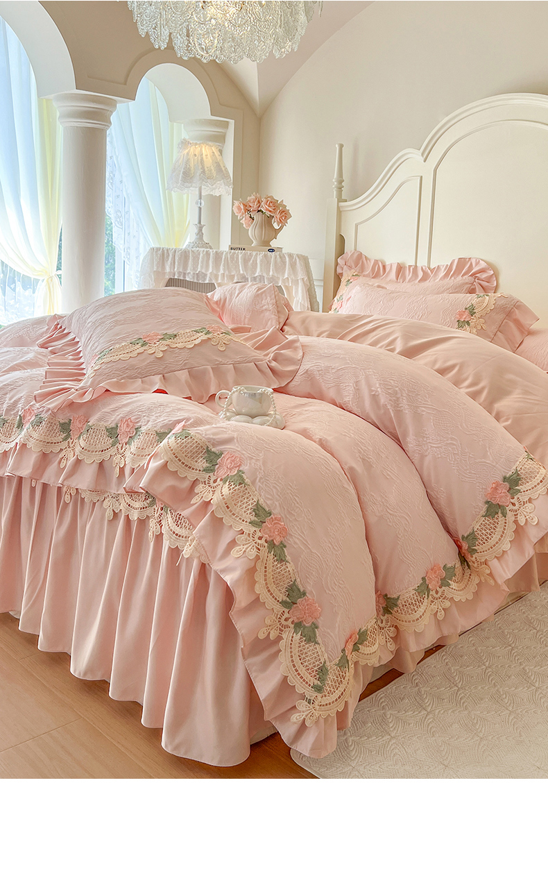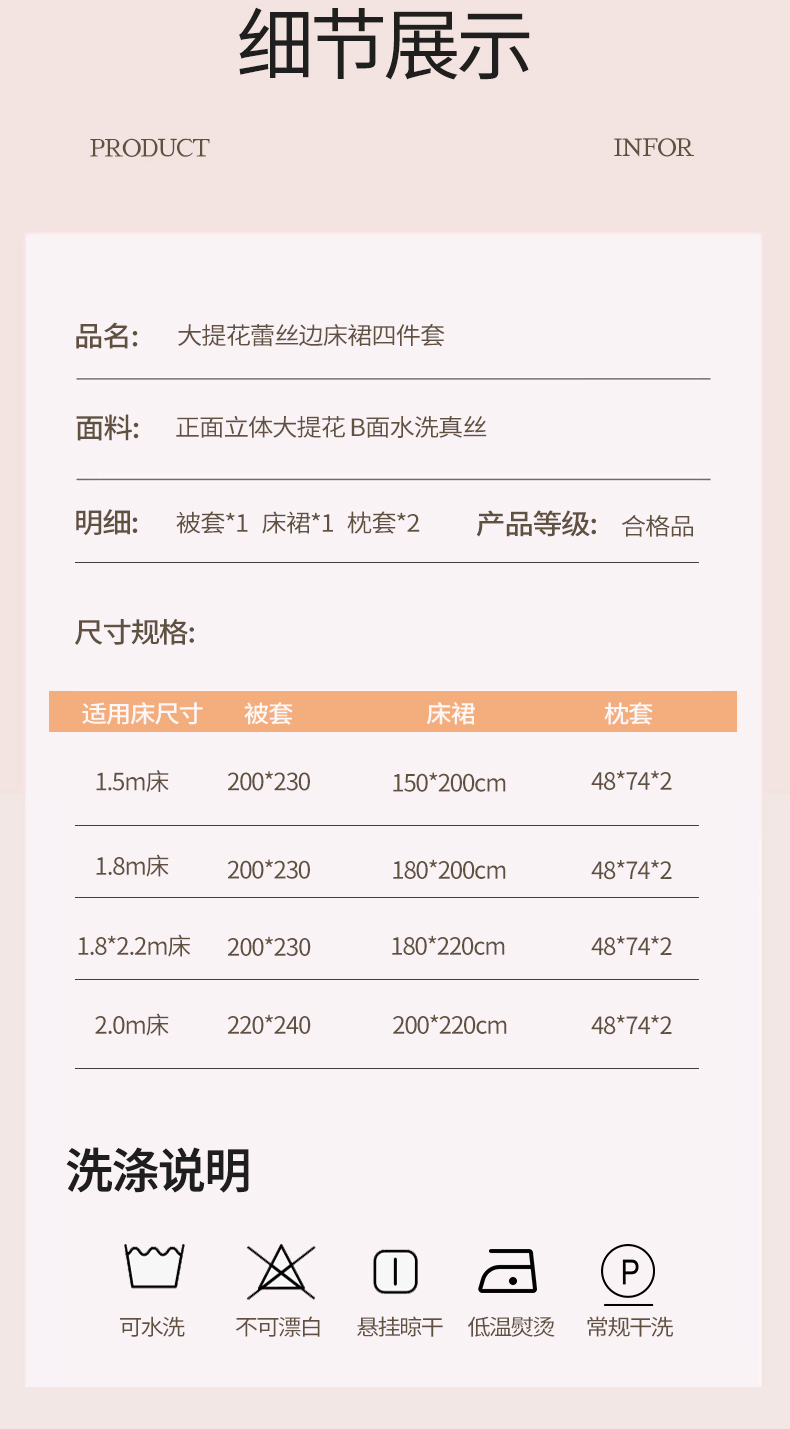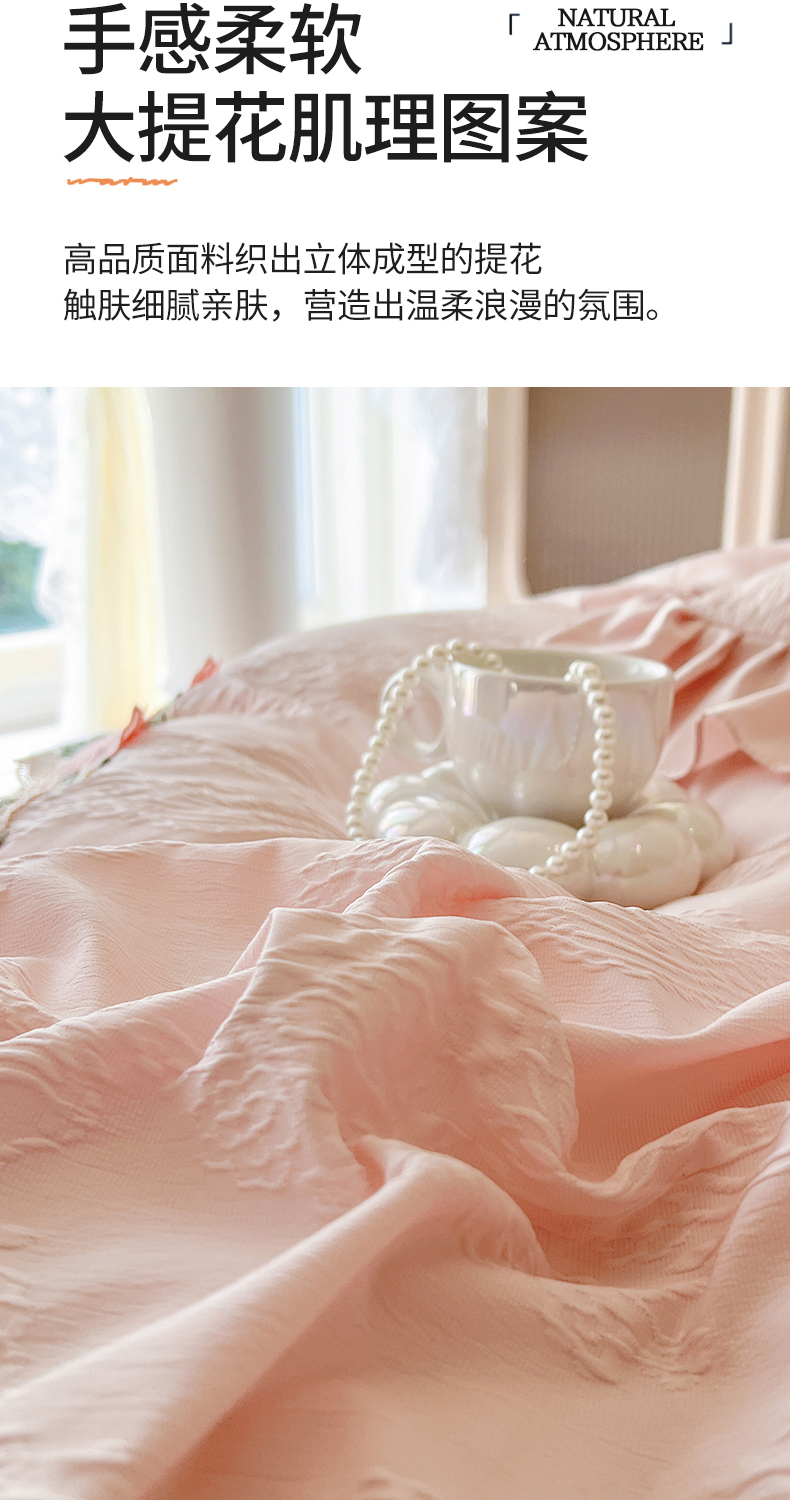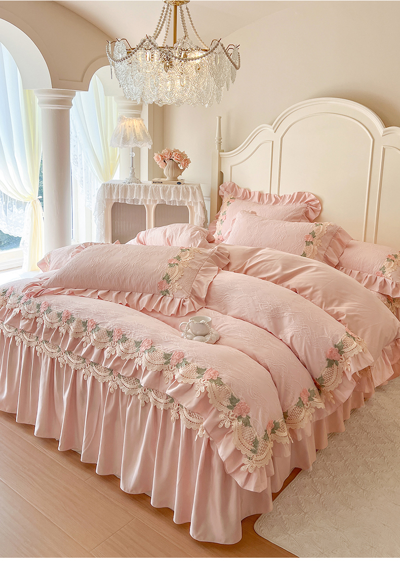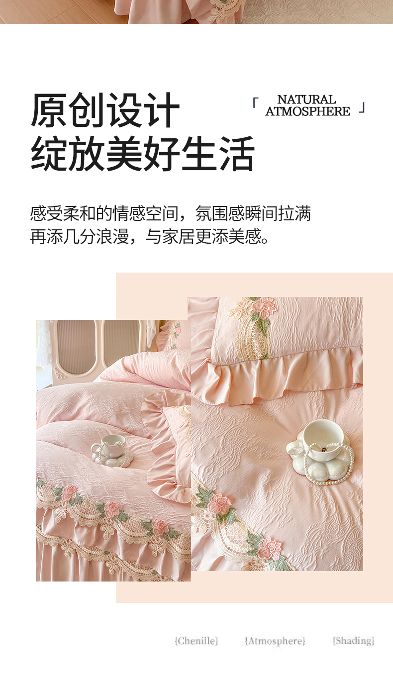 当前位置: 91家纺网 > 商品网购 > 床品套件 > 四件套 > 其它四件套 > 网红馆(ck家纺) 2025新款水洗真丝蕾丝刺绣床裙四件套-慕尚 嫩粉