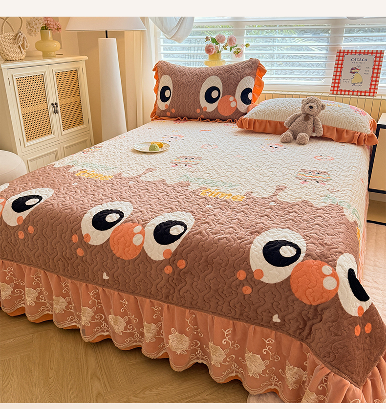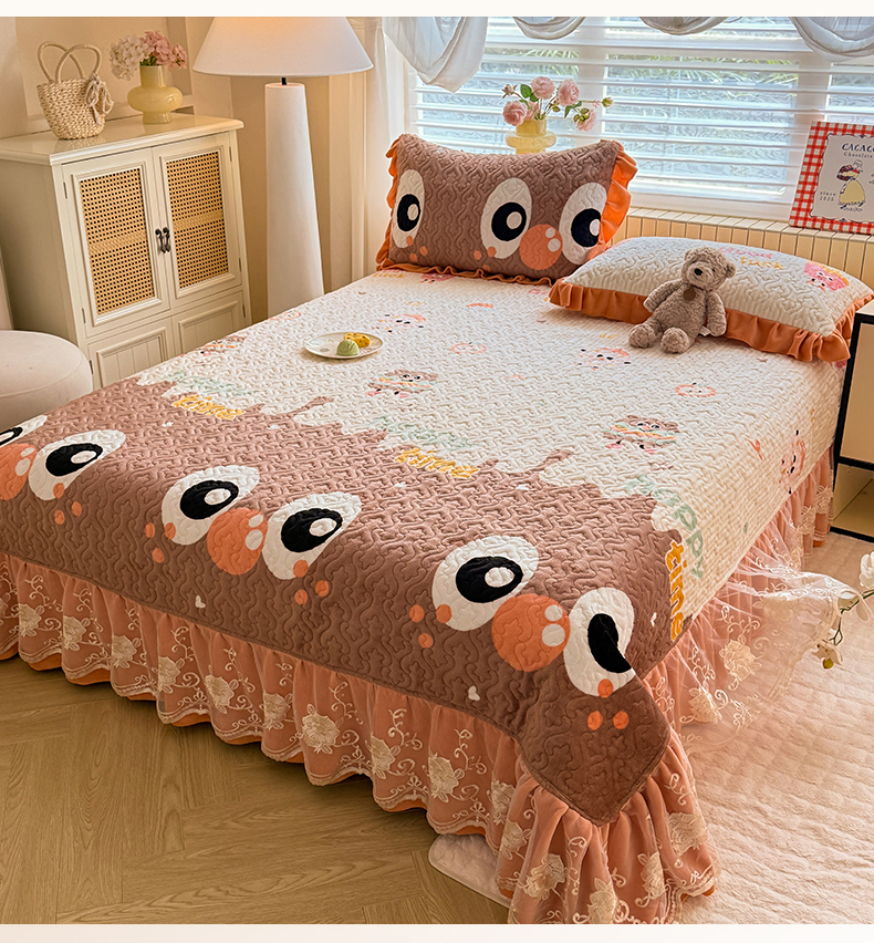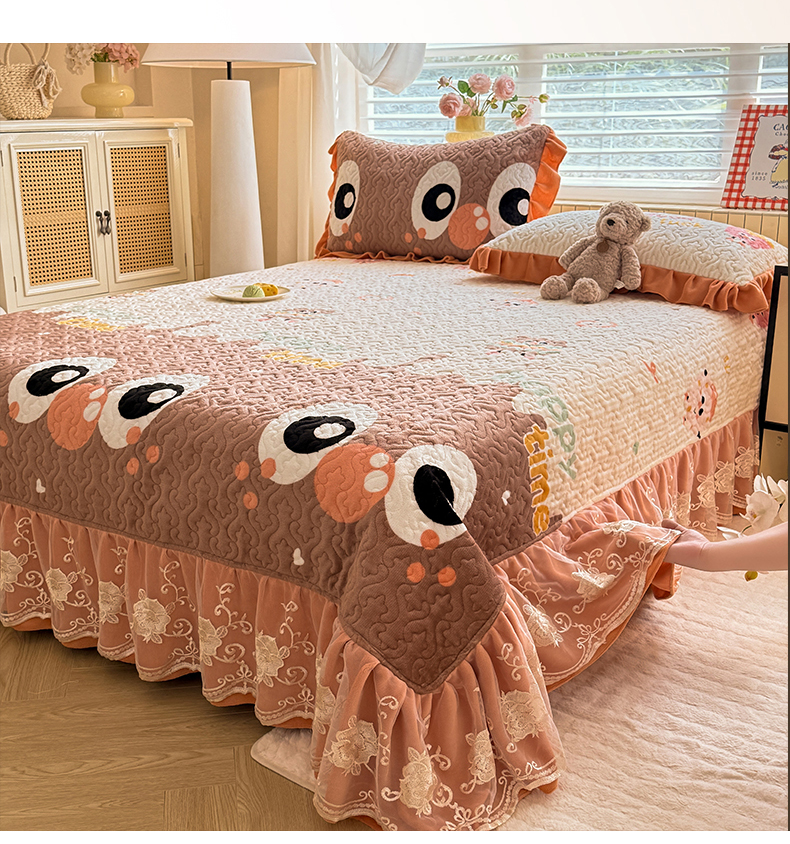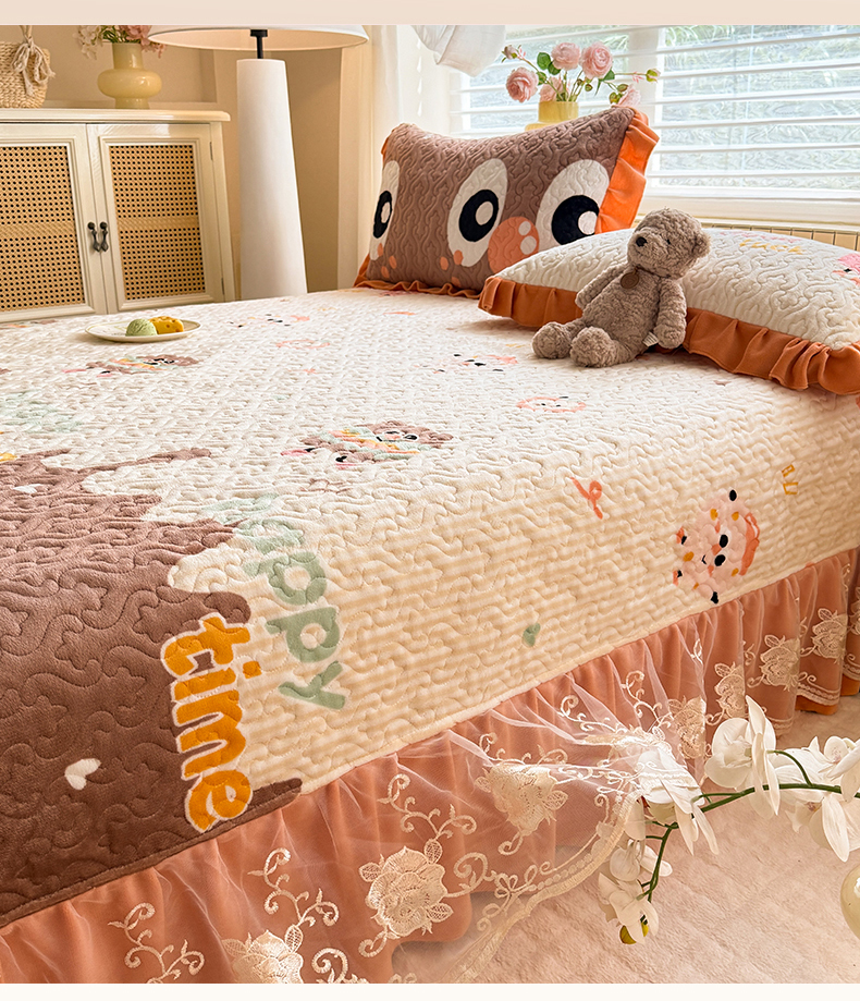 美达家纺 2025新款高克重牛奶绒花边款夹棉床盖三件套 甜蜜奶吧