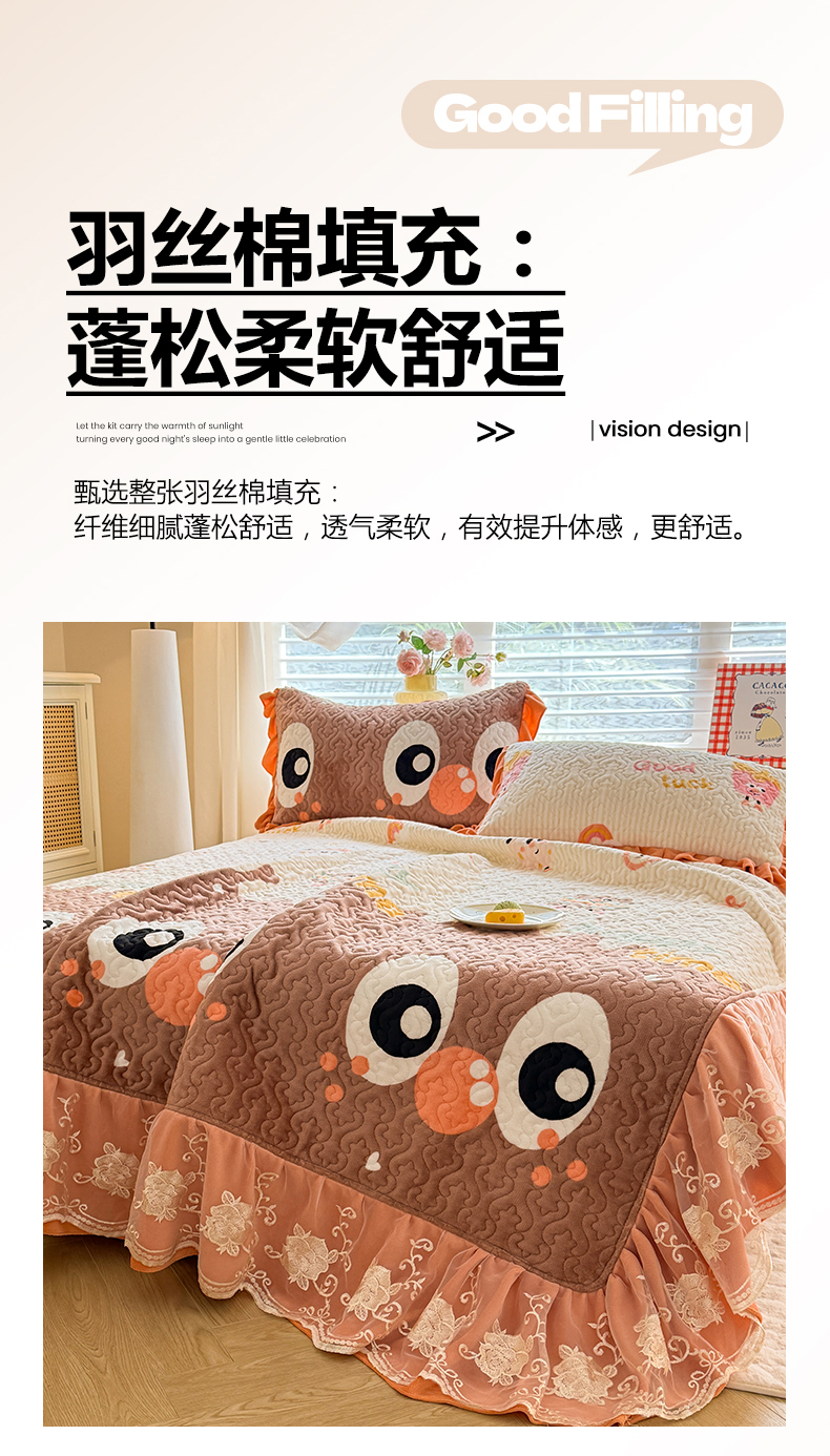 商品名称:美达家纺 2025新款高克重牛奶绒花边款夹棉床盖三件套 甜蜜奶吧