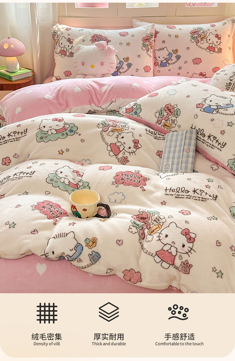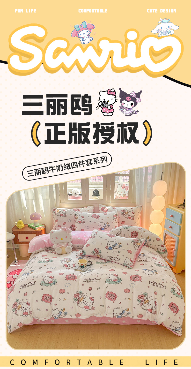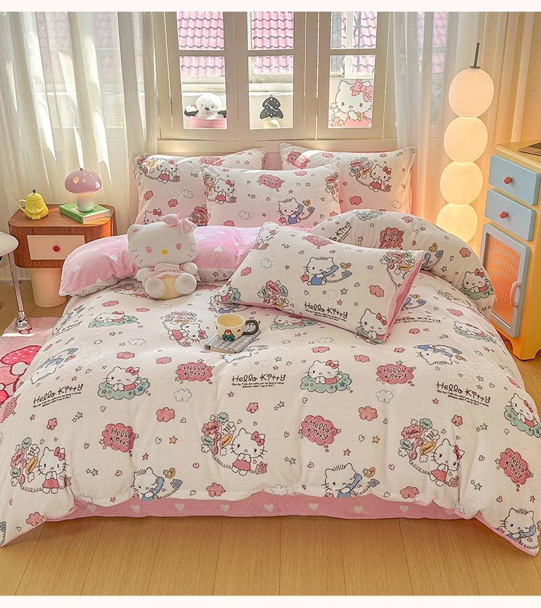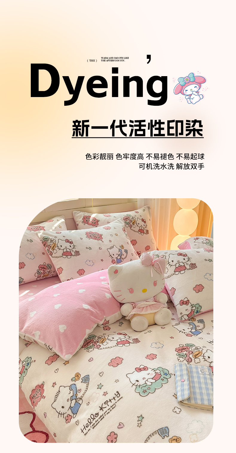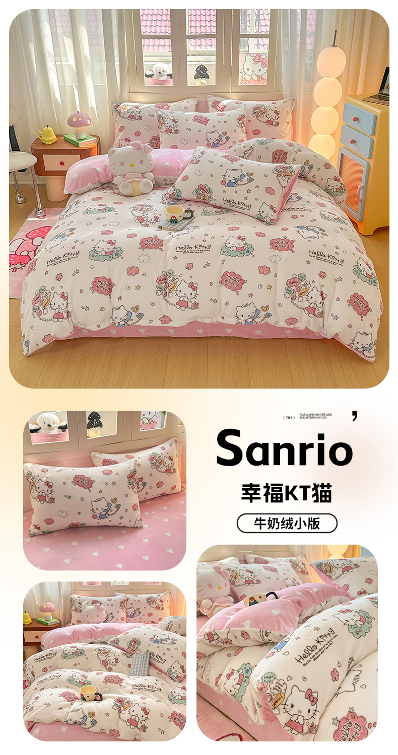 当前位置: 91家纺网 > 商品网购 > 床品套件 > 四件套 > 牛奶绒四件套 > 博雅 2025新款三丽鸥正版授权高克重牛奶绒小版四件套提供买家秀 牛奶绒小版-幸福KT猫专版花型