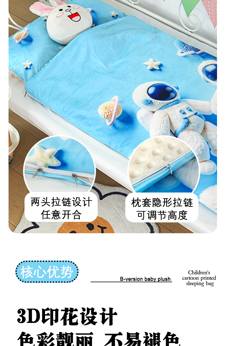(总)沁童儿童用品店 2025新款儿童3D立体印花A版宝宝绒+B版豆豆绒儿童睡袋,太空宝宝,彩虹马,彩色小熊,可爱猫咪,可爱小熊,蘑菇娃娃,企鹅宝宝,水果娃娃,云朵汽车,太空宝宝,企鹅宝宝,云朵汽车
