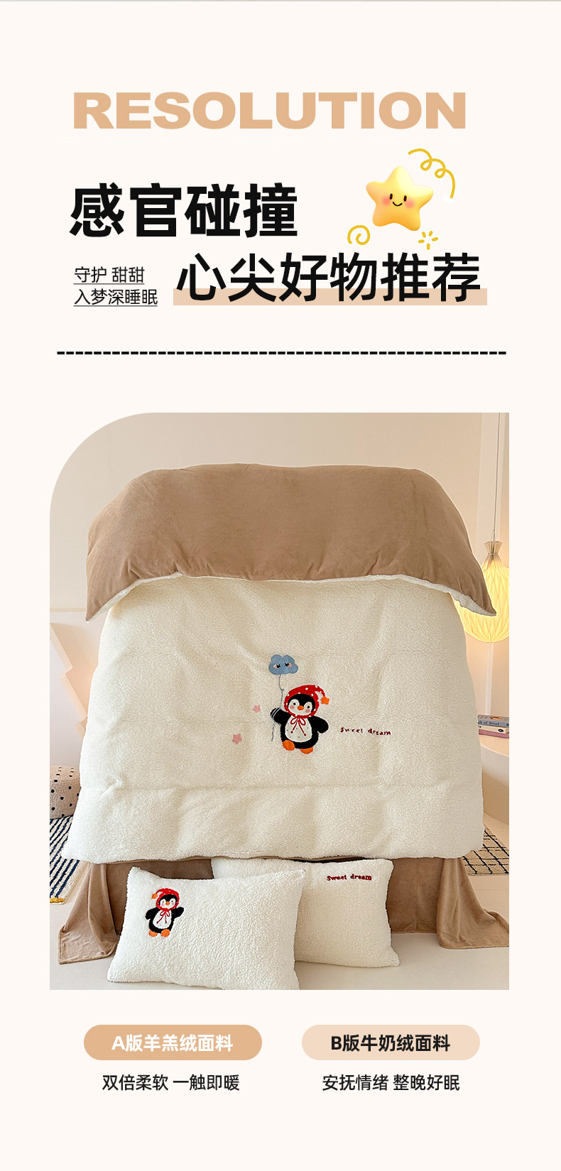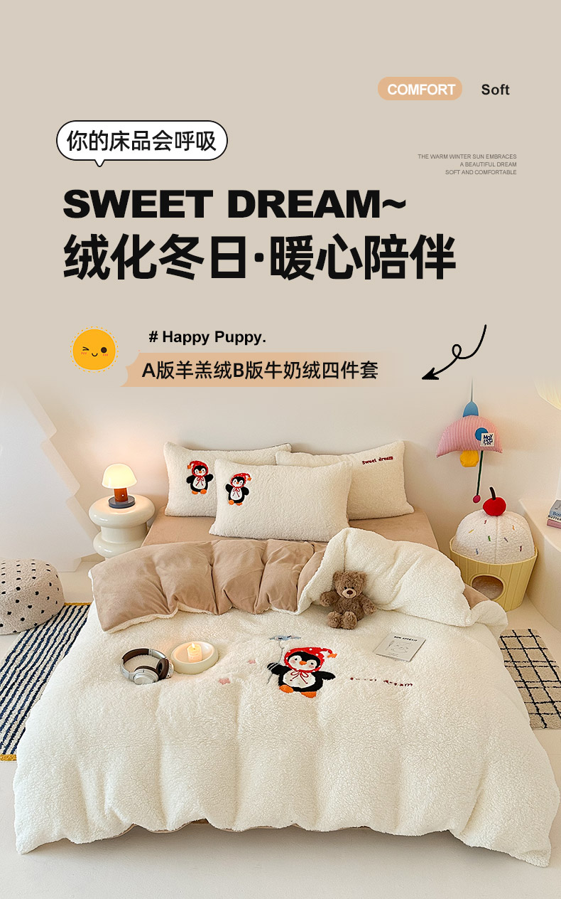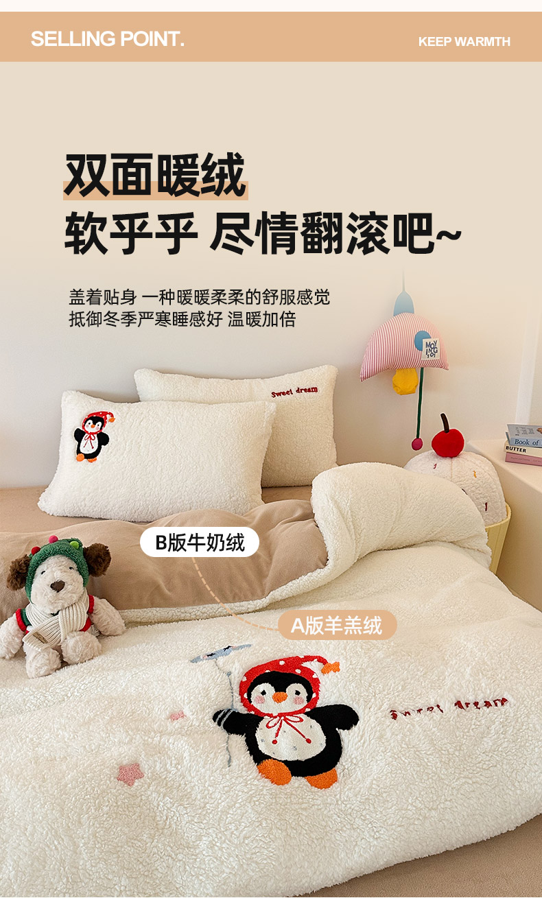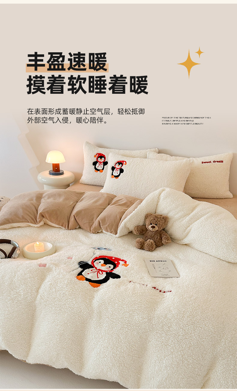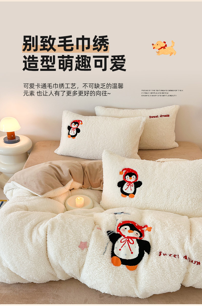 (总)梓之赫 2025新款小版羊羔绒牛奶绒卡通四件套冬季加厚保暖,汉堡-白卡其,汉堡-黄,汉堡-咖,企鹅-白卡其,企鹅-粉,企鹅-蓝,曲奇-白粉,星星小狗-白卡其,星星小狗-蓝