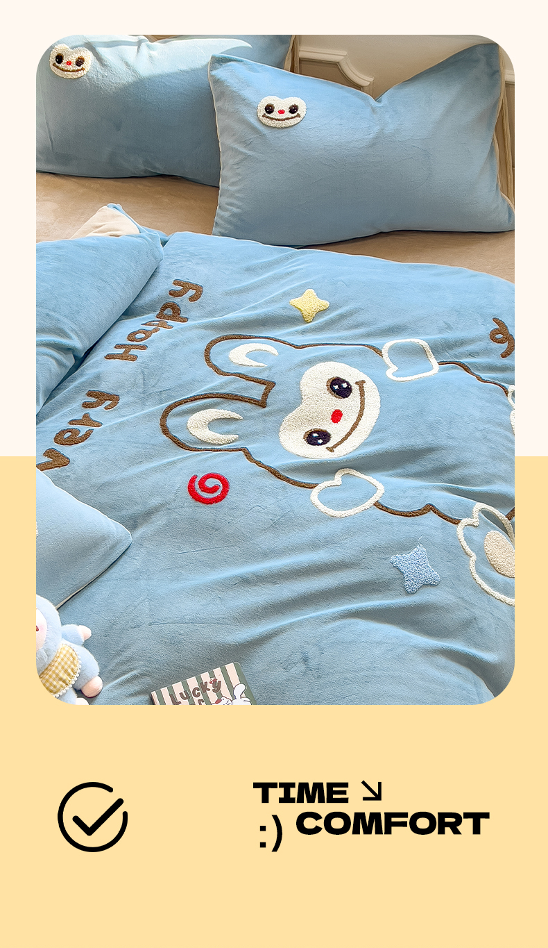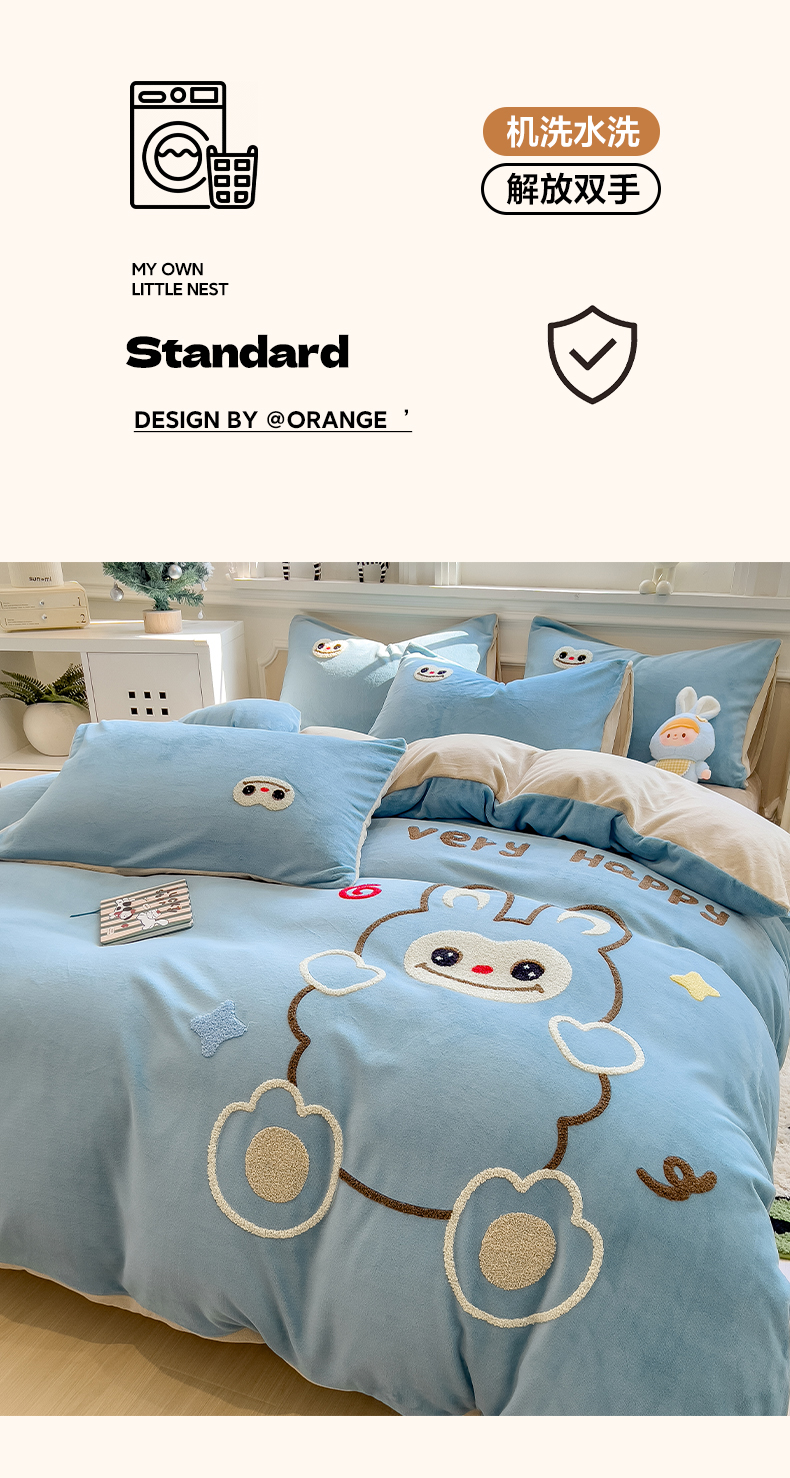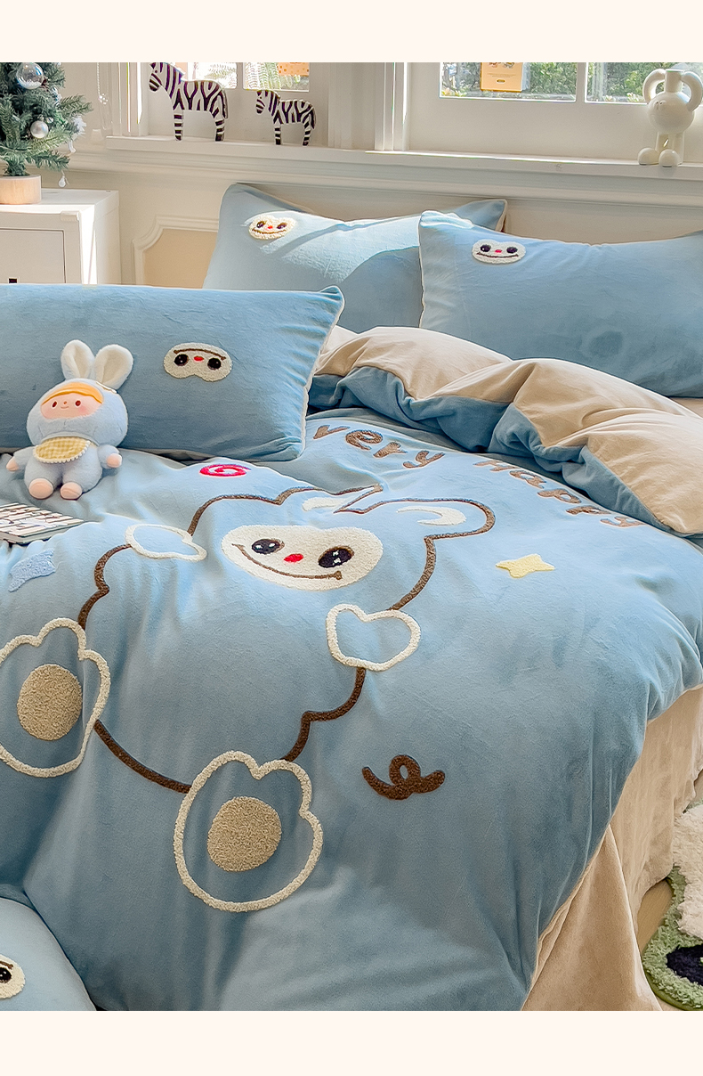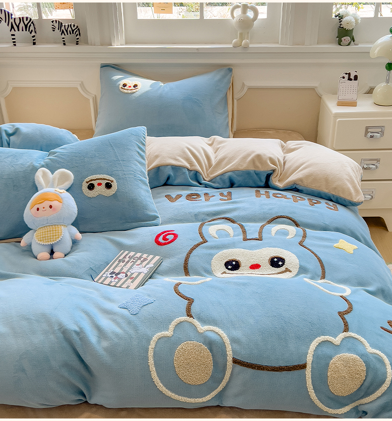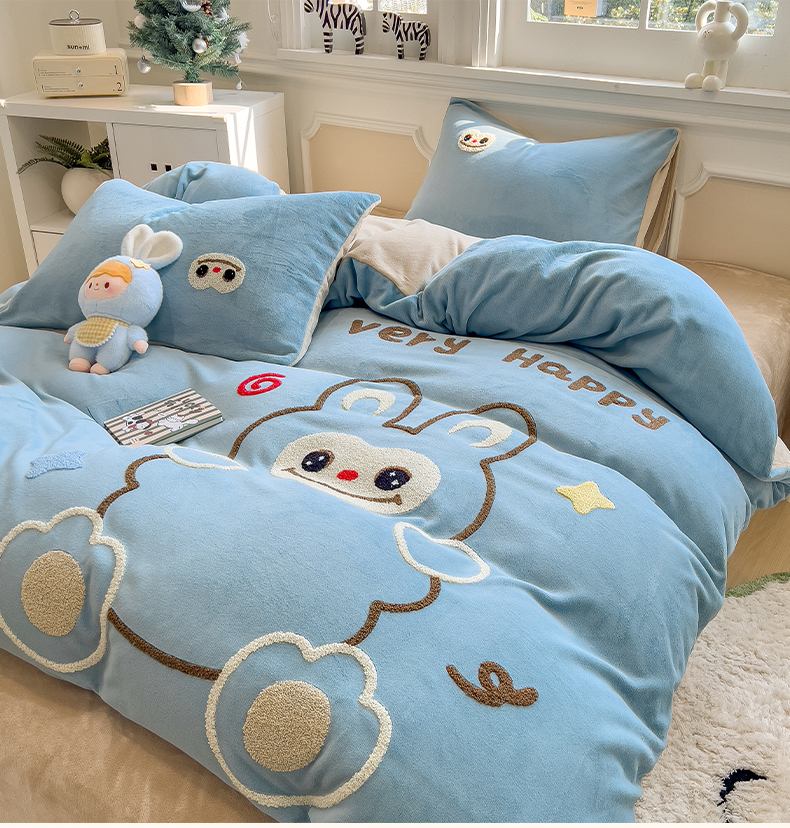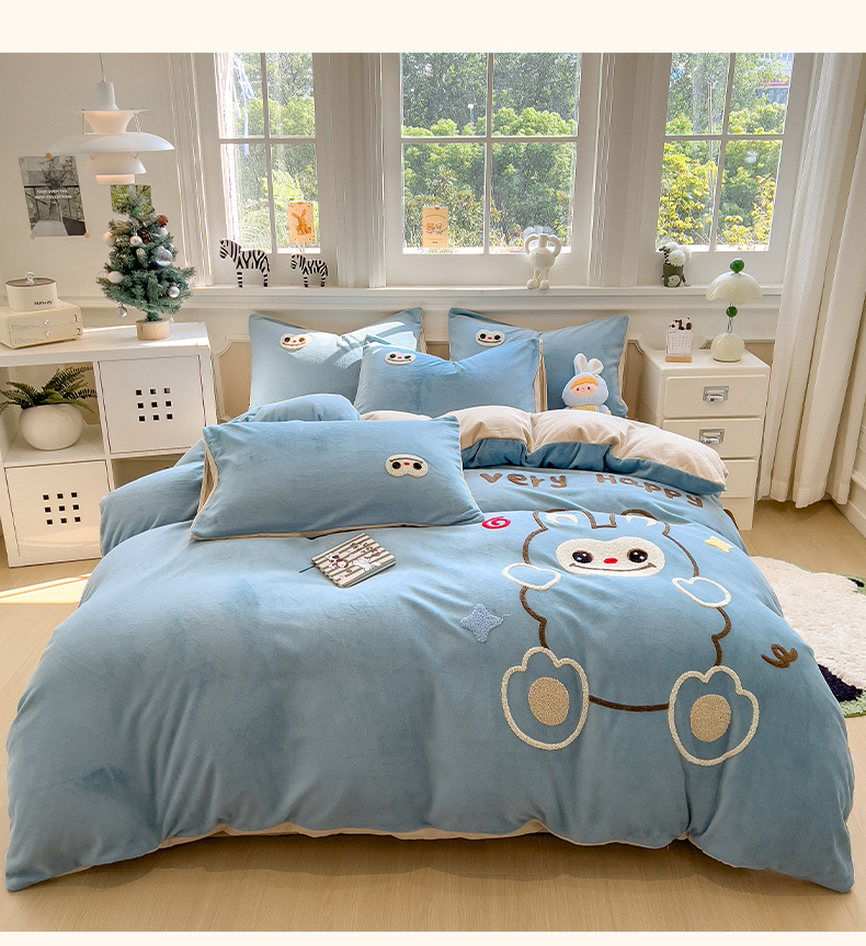 当前位置: 91家纺网 > 商品网购 > 床品套件 > 四件套 > 牛奶绒四件套 > 悦织语 2025新款加厚200克高克重毛巾绣牛奶绒四件套 可爱布布-蓝