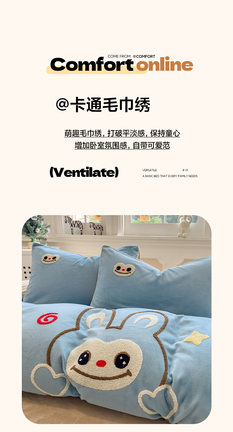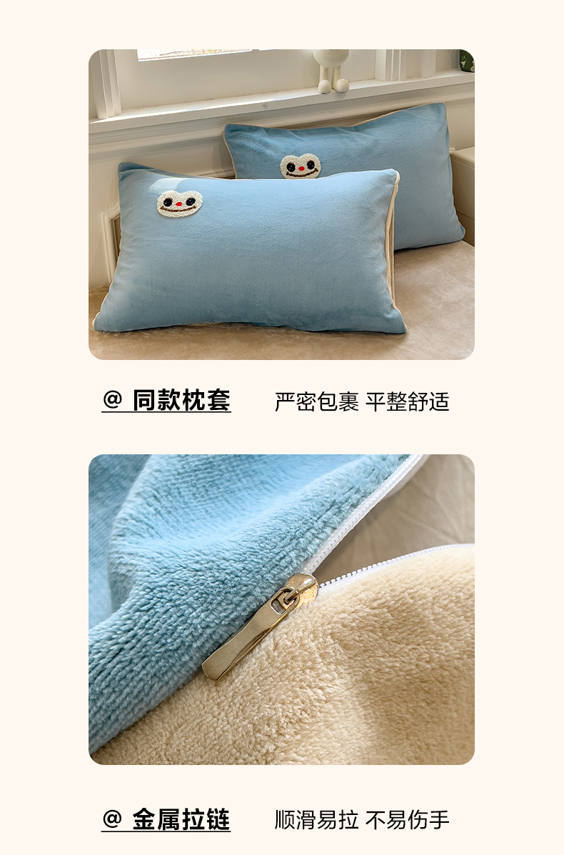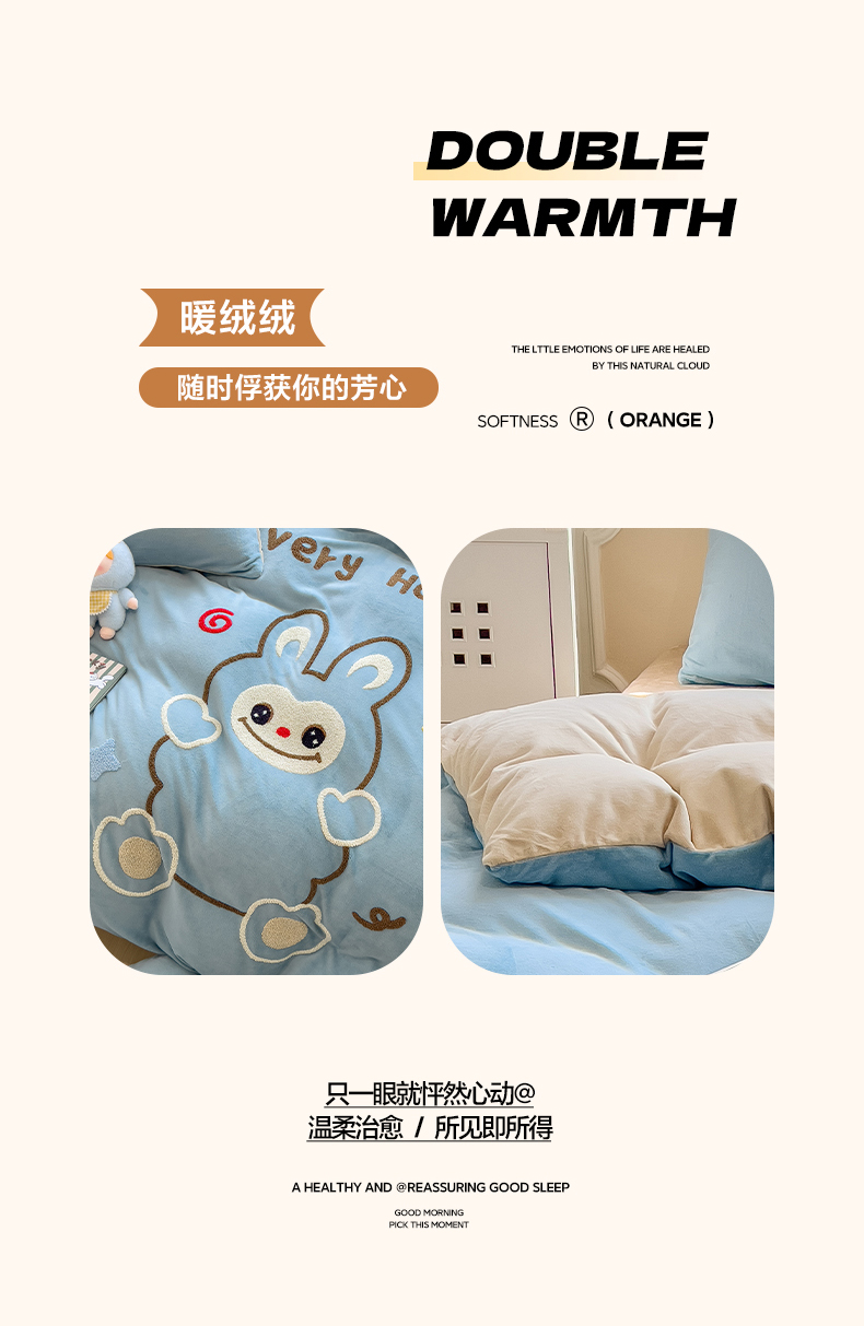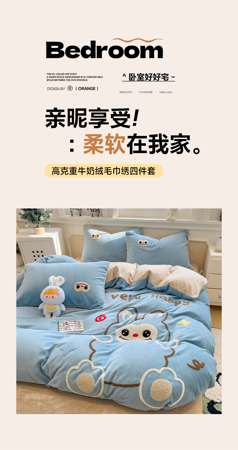 当前位置: 91家纺网 > 商品网购 > 床品套件 > 四件套 > 牛奶绒四件套 > 悦织语 2025新款加厚200克高克重毛巾绣牛奶绒四件套 可爱布布-蓝