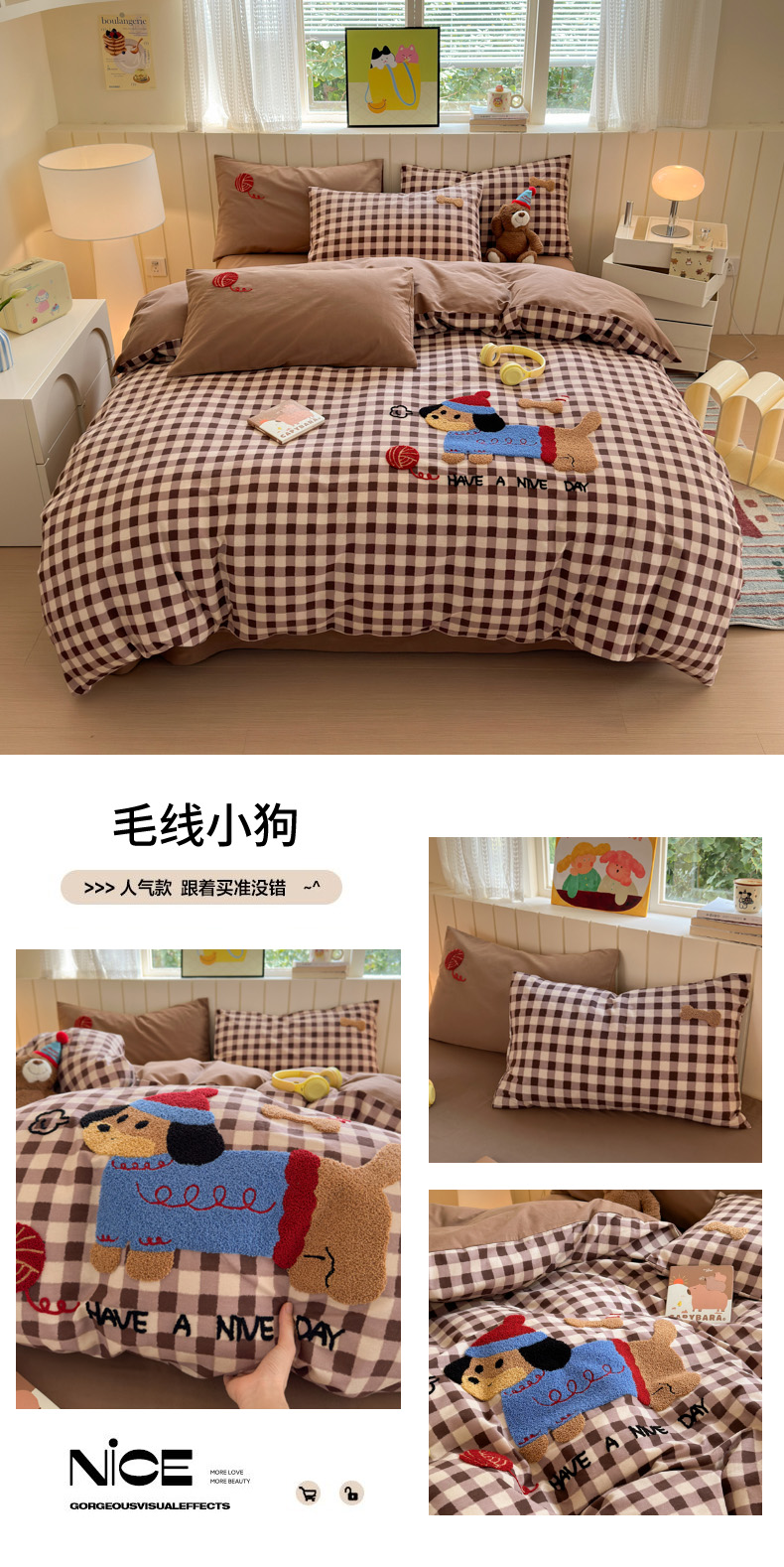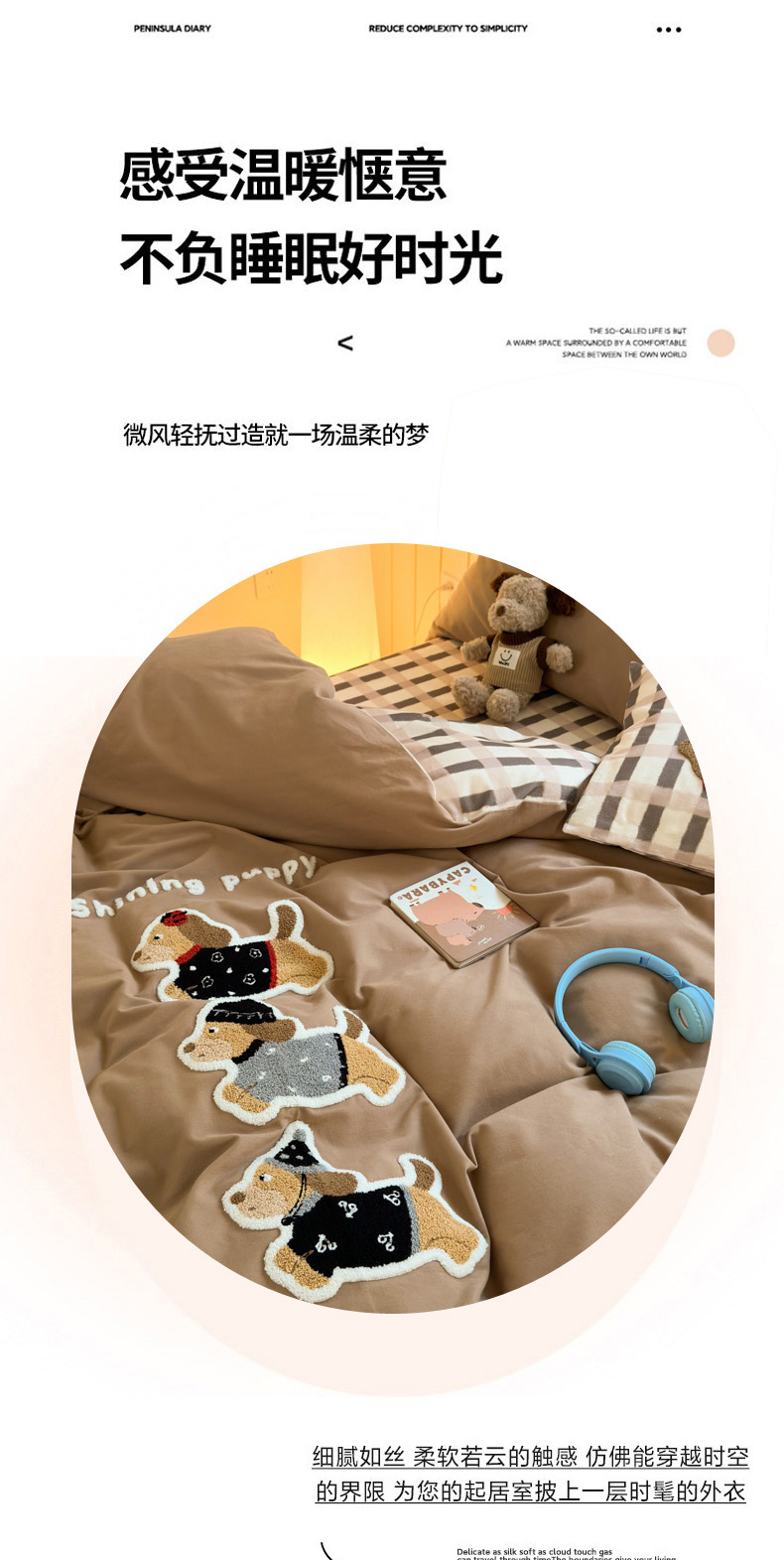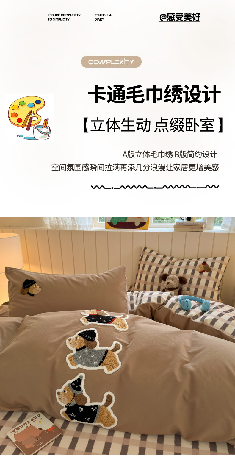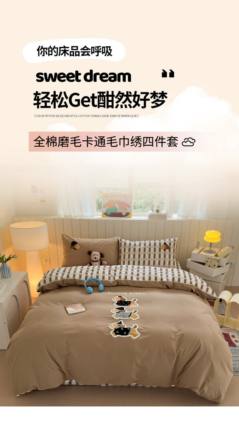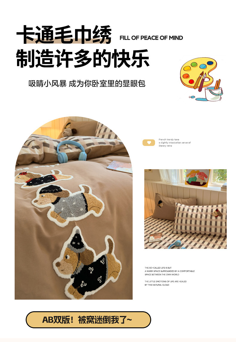 当前位置: 91家纺网 > 商品网购 > 床品套件 > 四件套 > 毛巾绣四件套 > 如意朵 2025新款全棉磨毛卡通毛巾绣四件套(专版花型)-场景二 复古小狗