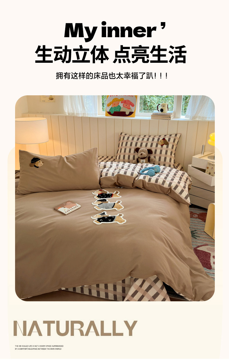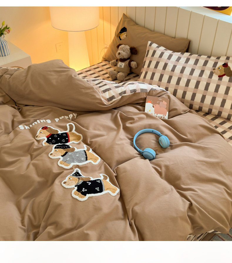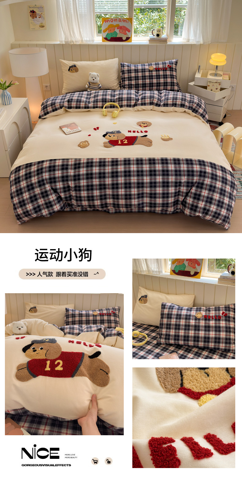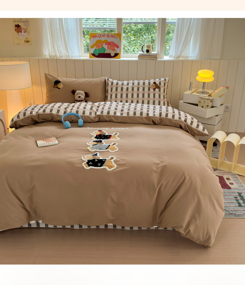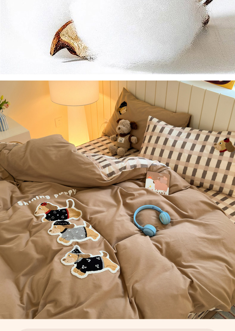 当前位置: 91家纺网 > 商品网购 > 床品套件 > 四件套 > 毛巾绣四件套 > 如意朵 2025新款全棉磨毛卡通毛巾绣四件套(专版花型)-场景二 复古小狗