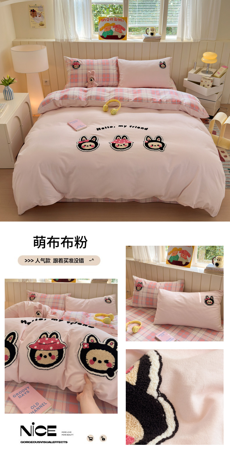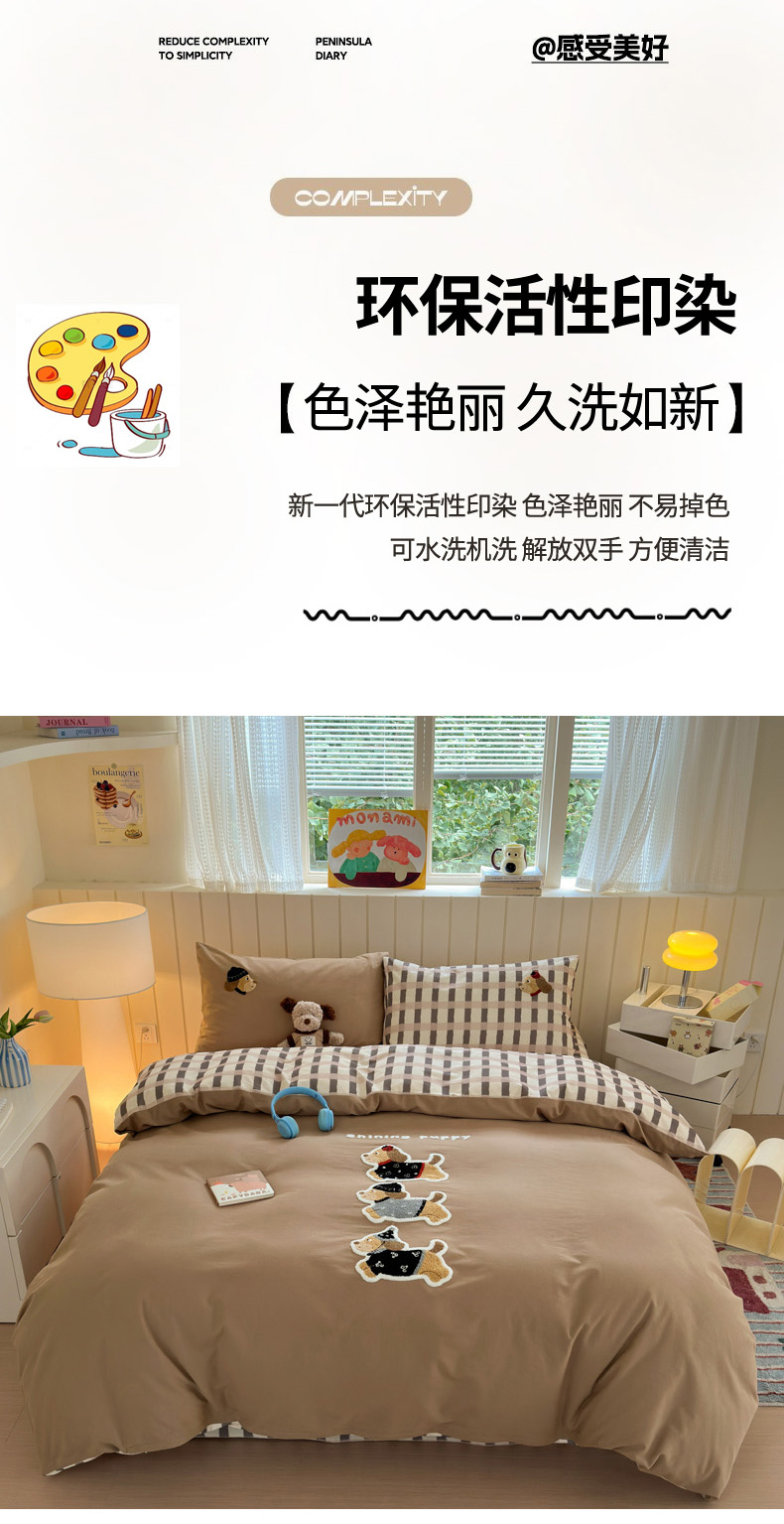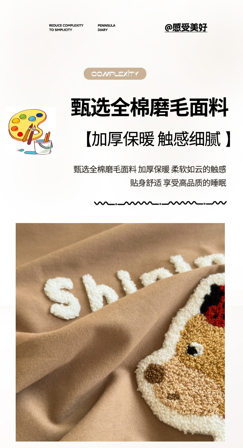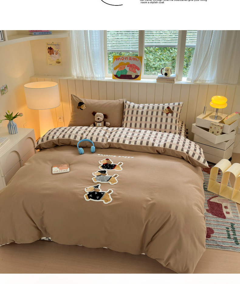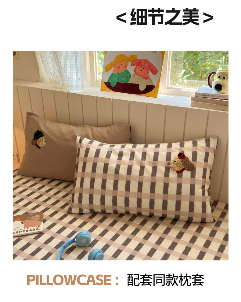 当前位置: 91家纺网 > 商品网购 > 床品套件 > 四件套 > 毛巾绣四件套 > 如意朵 2025新款全棉磨毛卡通毛巾绣四件套(专版花型)-场景二 复古小狗