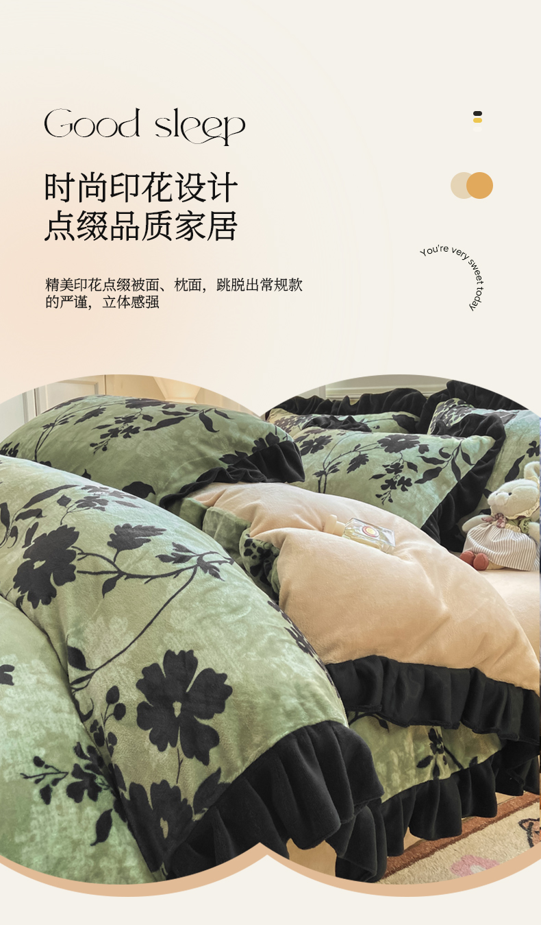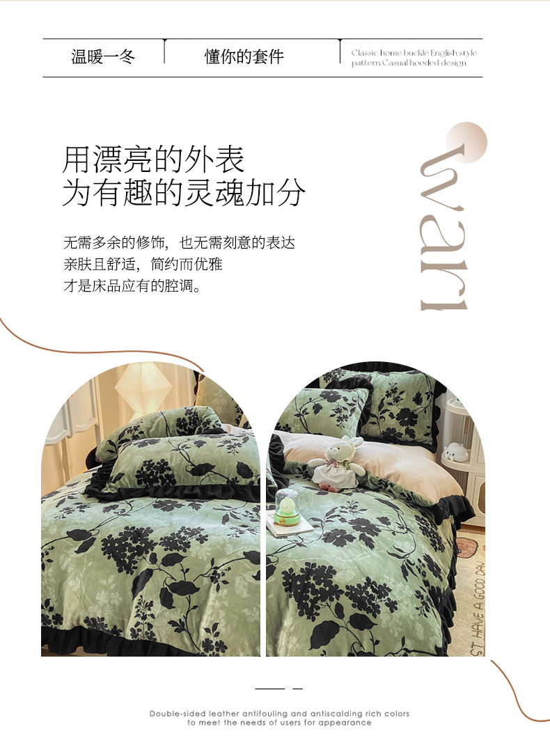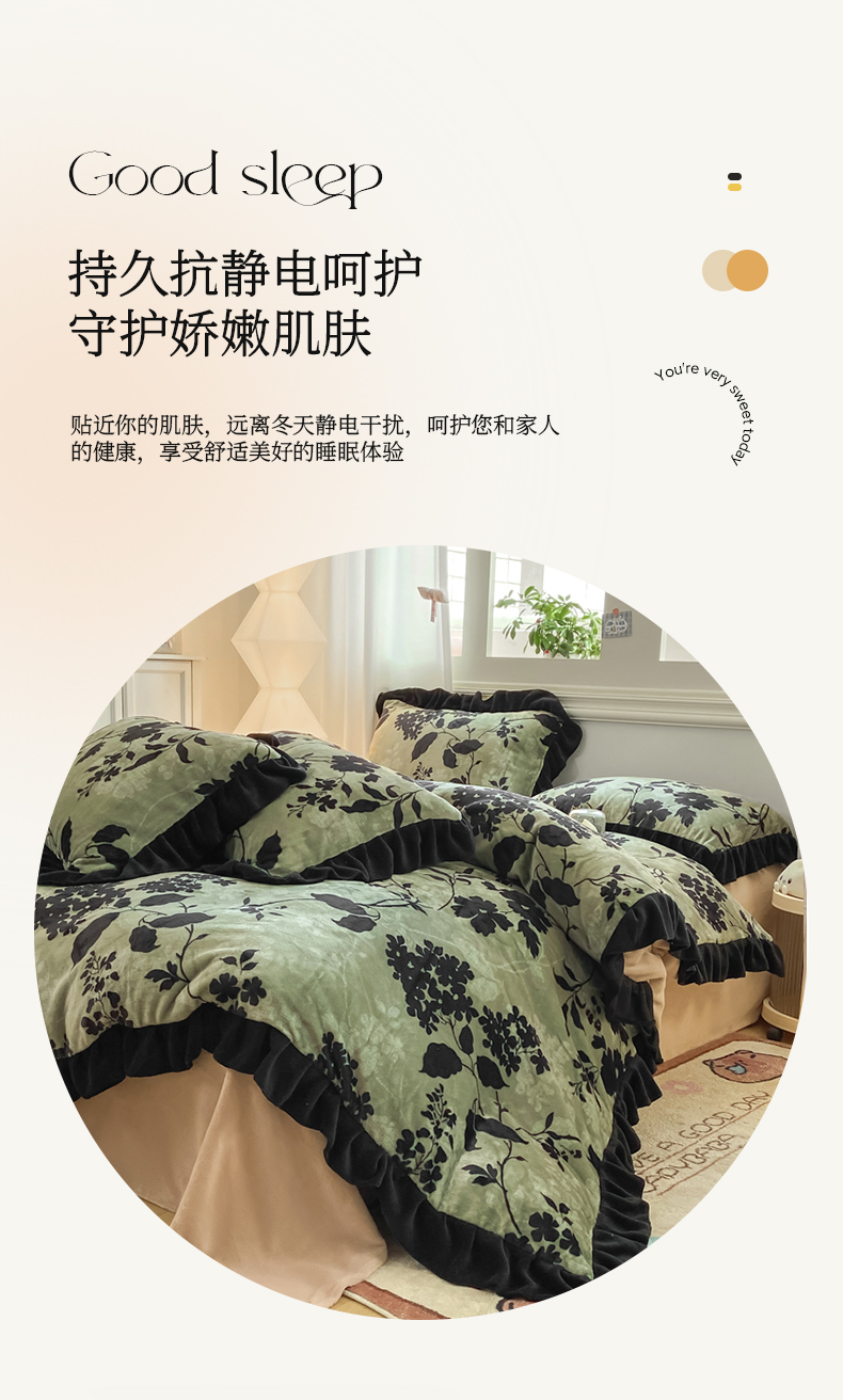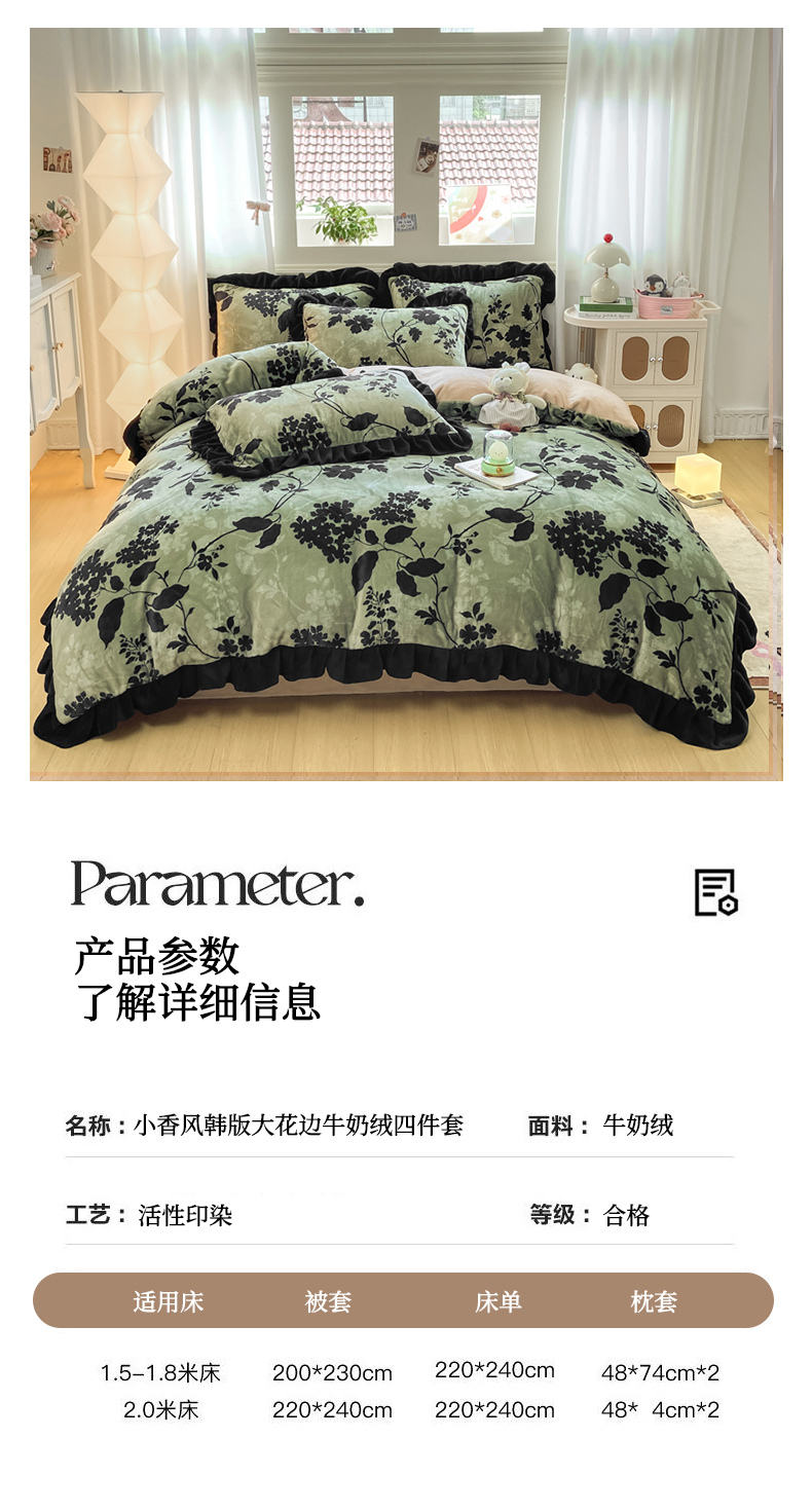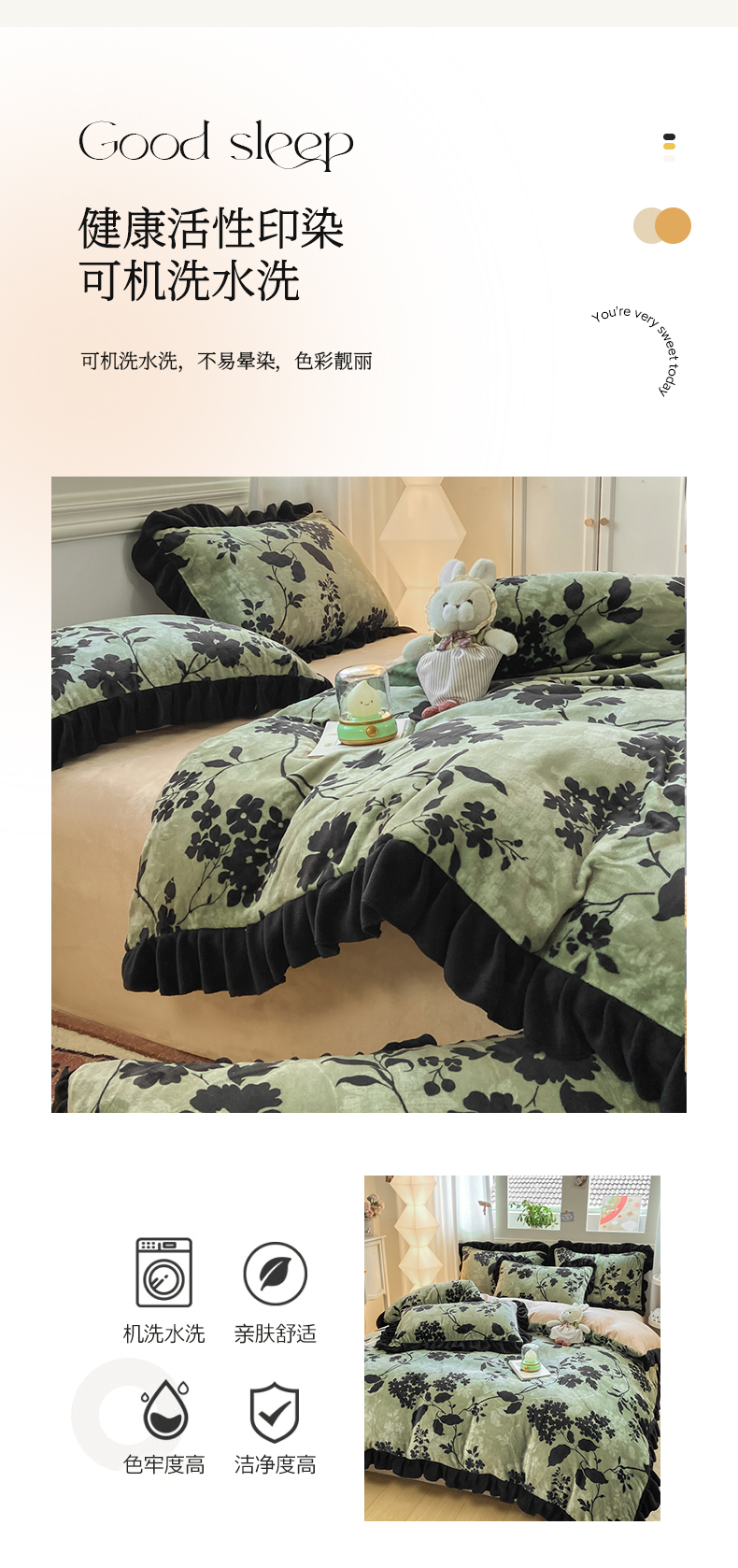 商品名称:富之航家纺 2025新款小香风赫本风ins风大牌韩版大花边轻奢牛奶绒四件套 游园-绿