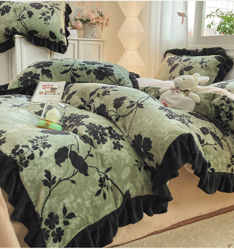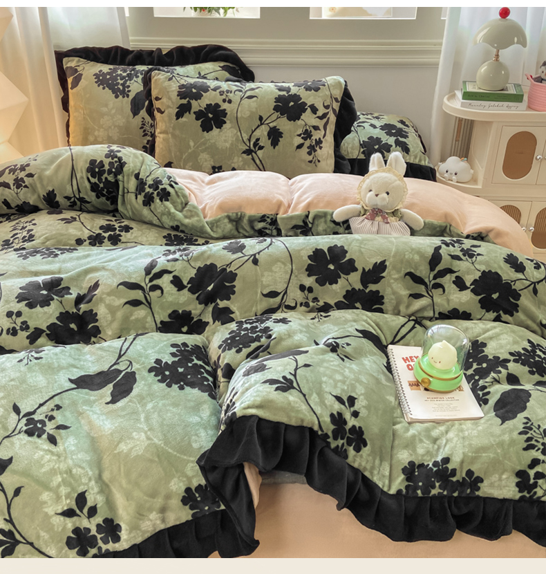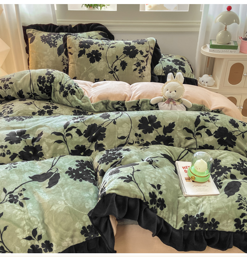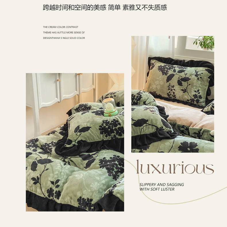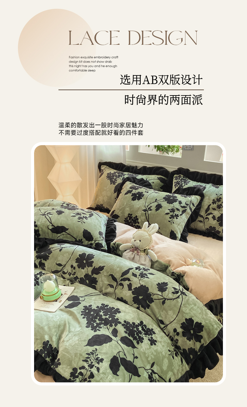 富之航家纺 2025新款小香风赫本风ins风大牌韩版大花边轻奢牛奶绒四件套 游园-绿