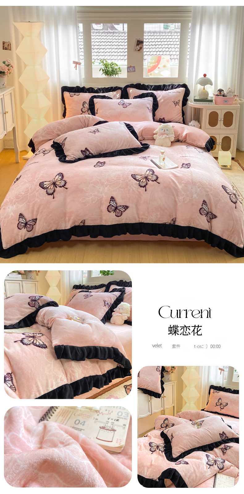 (总)富之航家纺 2025新款小香风赫本风ins风大牌韩版大花边轻奢牛奶绒四件套,蝶恋花,蝶栖,黑糖,楼桃,眠语,慕秋,叶叙,游园-白,游园-绿,紫萝