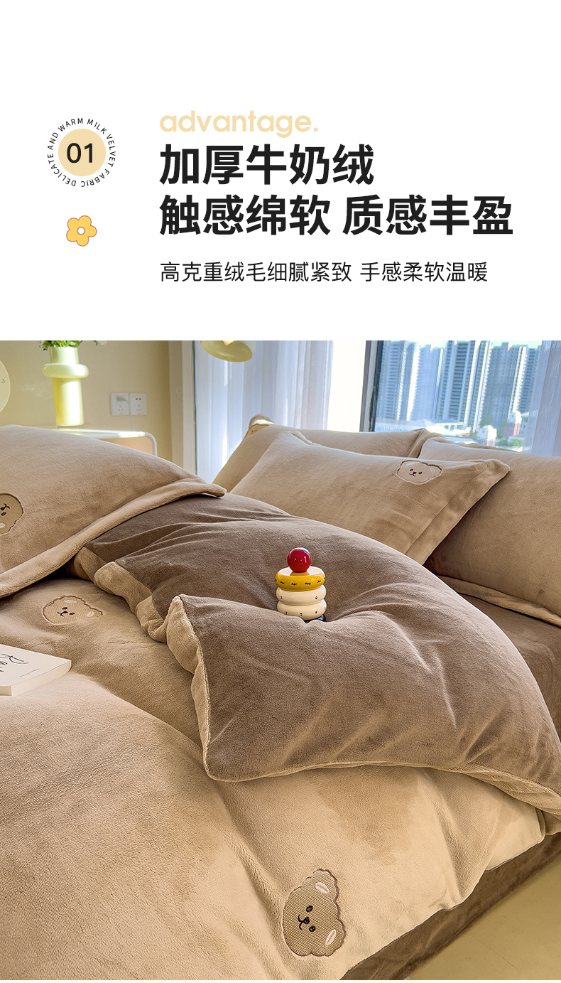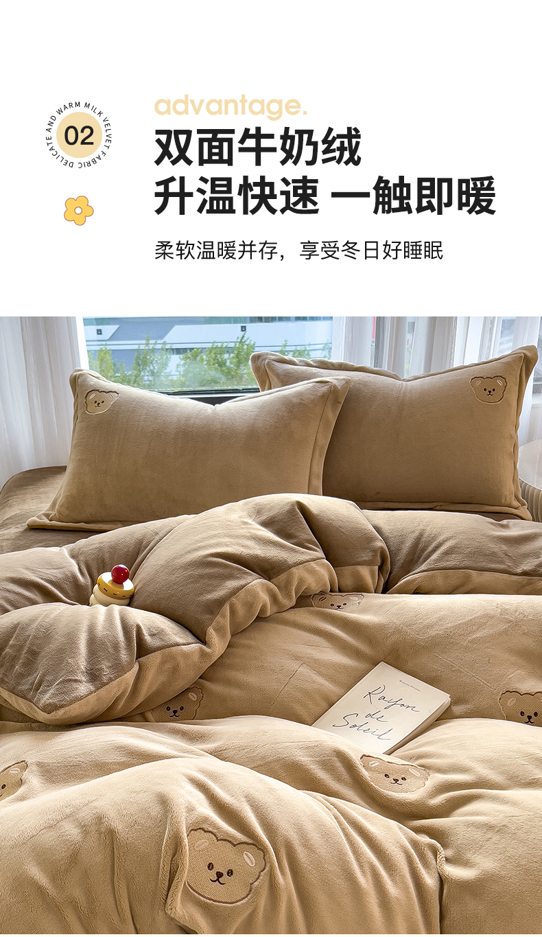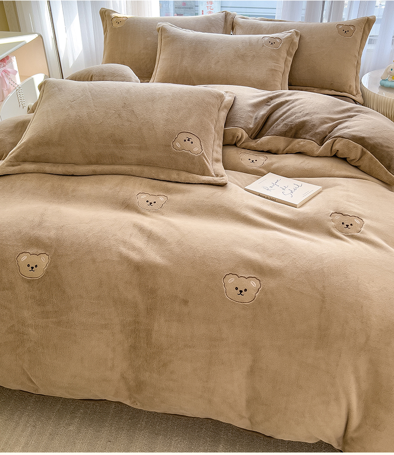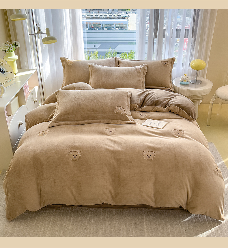 商品名称:丽美人家纺 2025新款牛奶绒卡通刺绣系列四件套 嘟嘟熊-咖