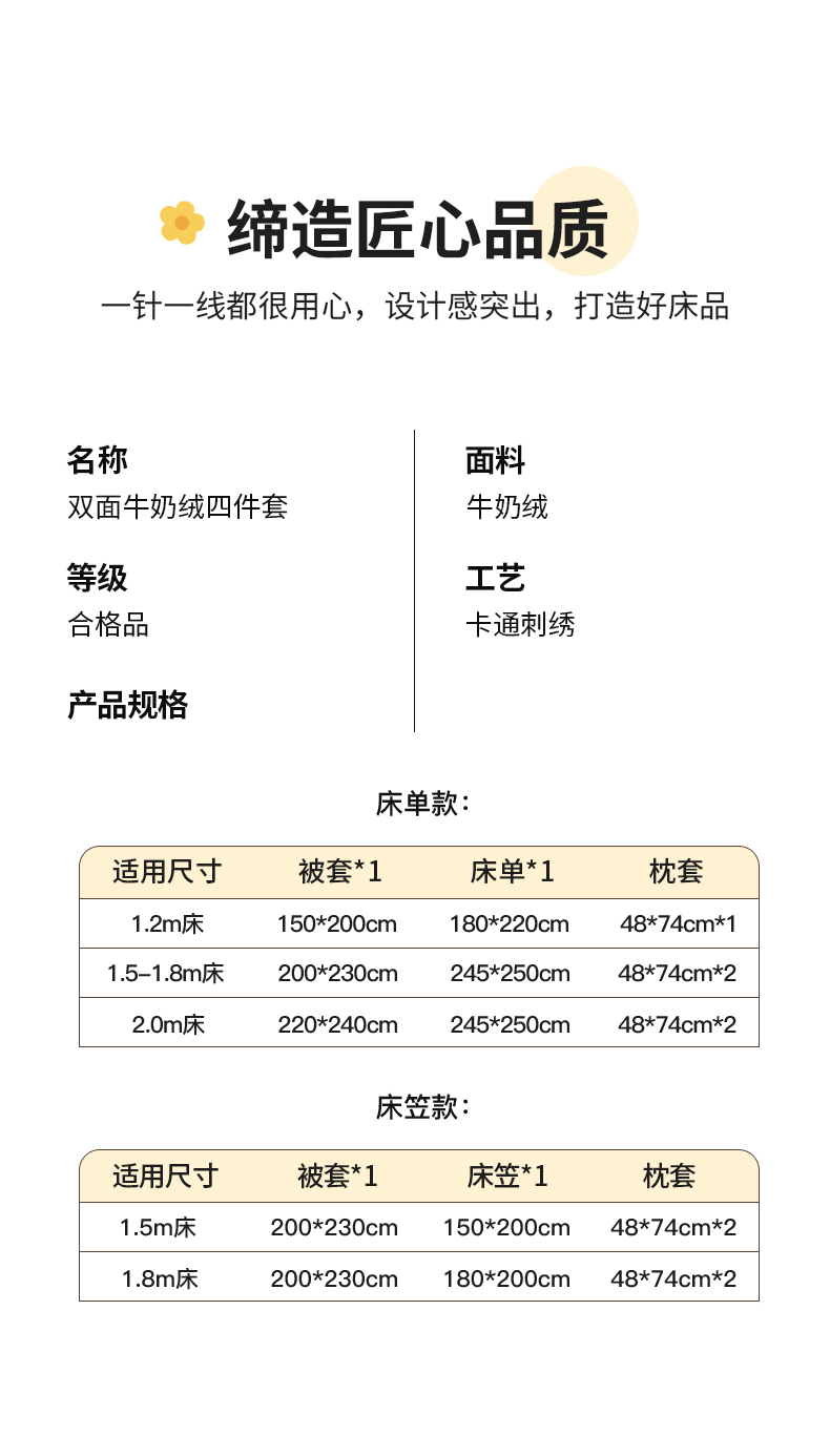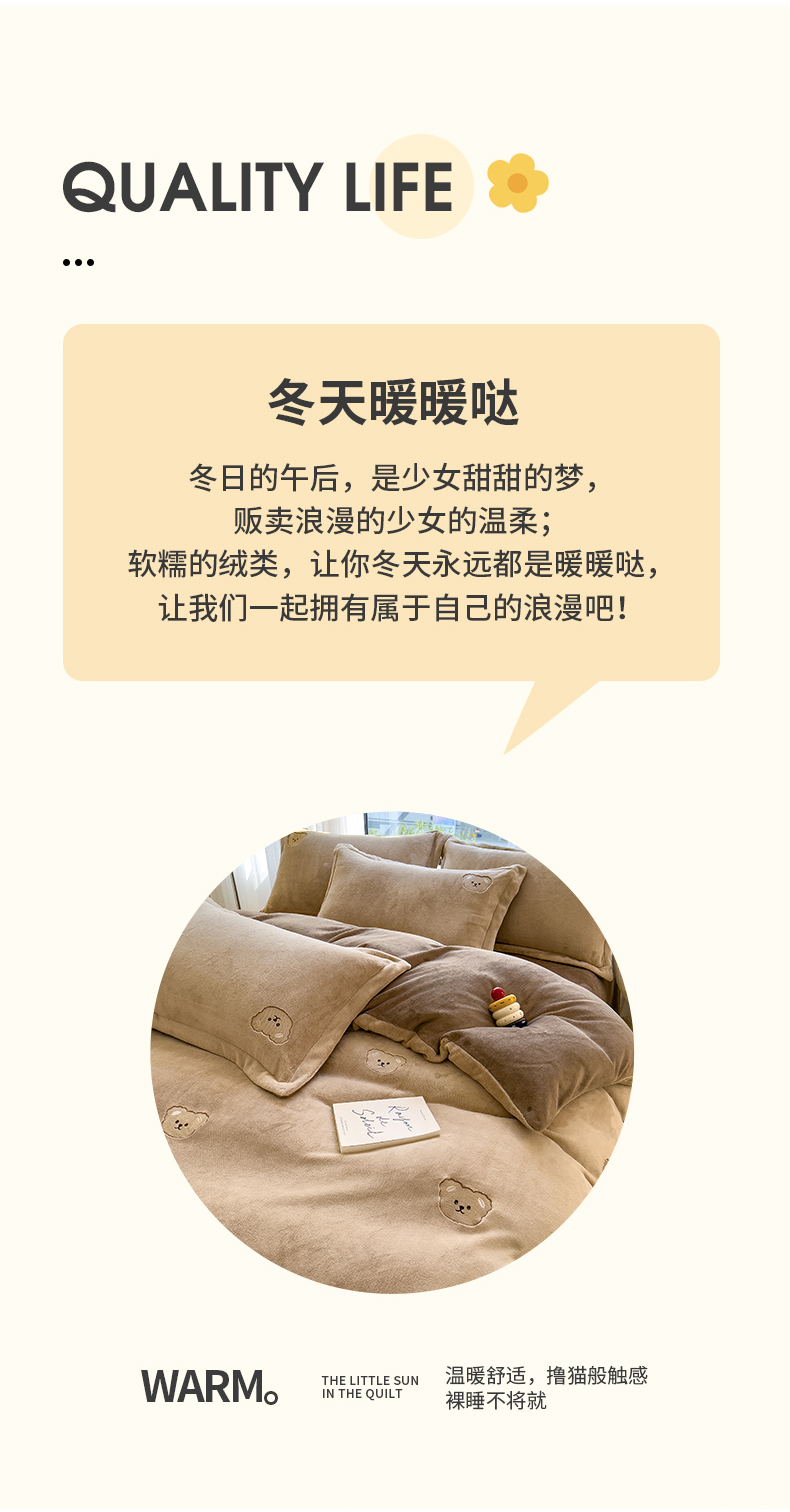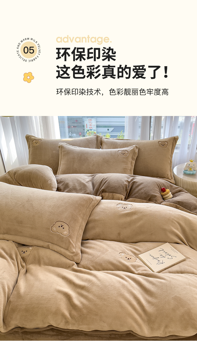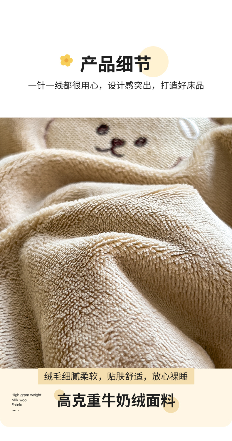 商品名称:丽美人家纺 2025新款牛奶绒卡通刺绣系列四件套 嘟嘟熊-咖