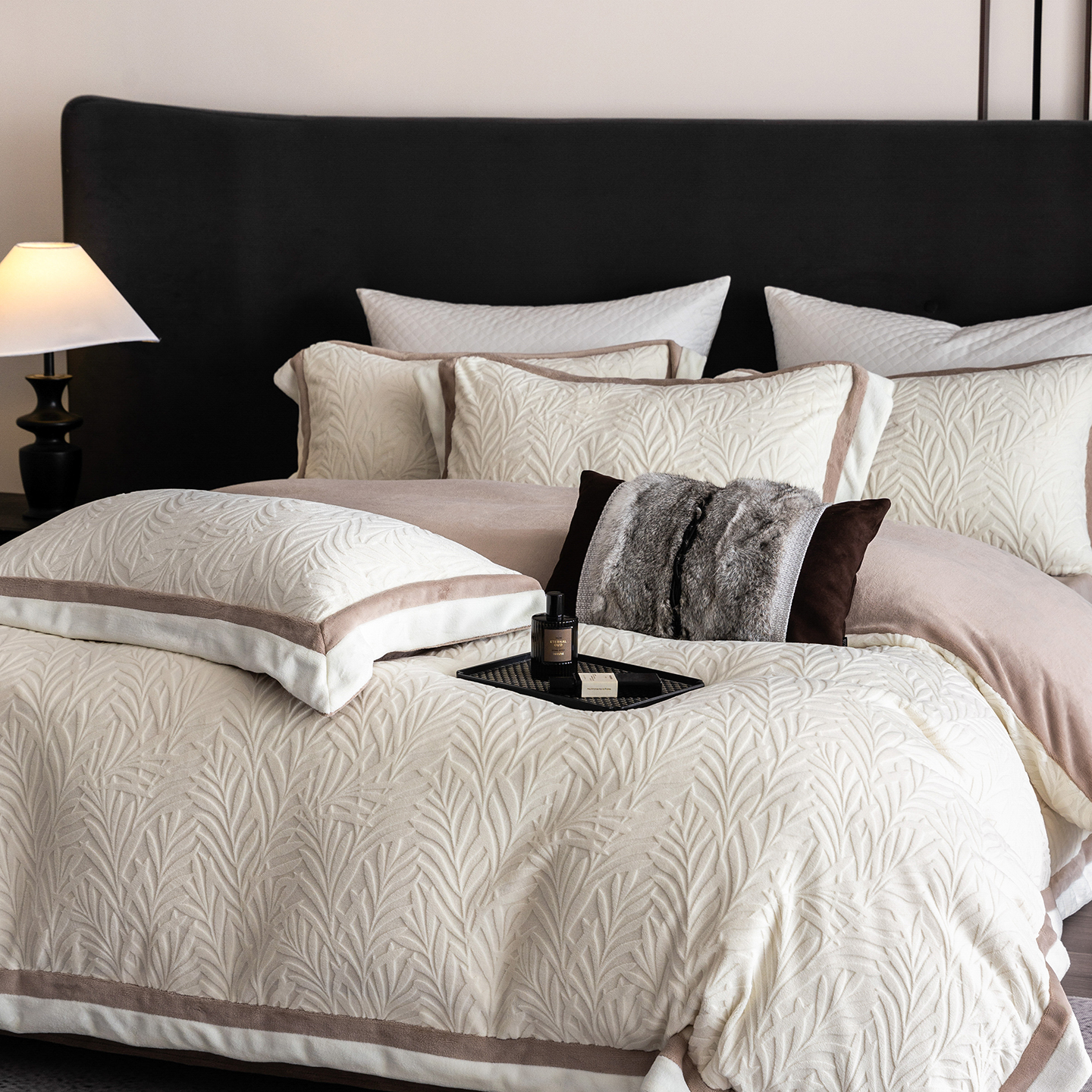 商品名称:蓝梦 2025新款亲肤舒适牛奶绒四件套-榈叶系列 榈叶-米月白