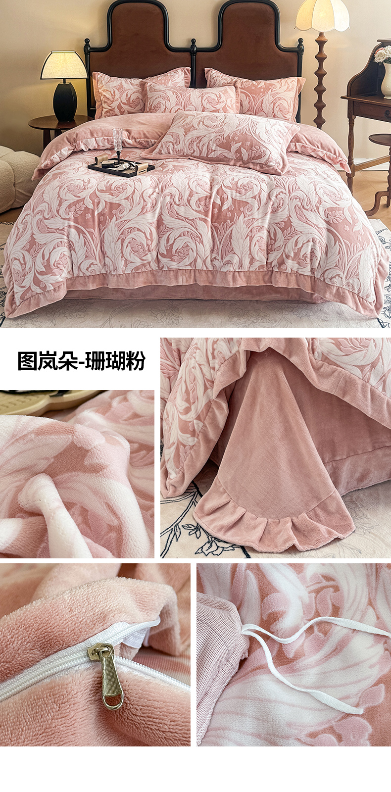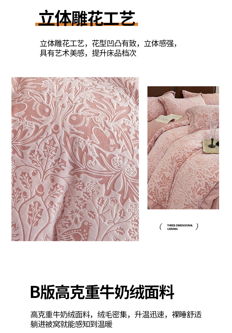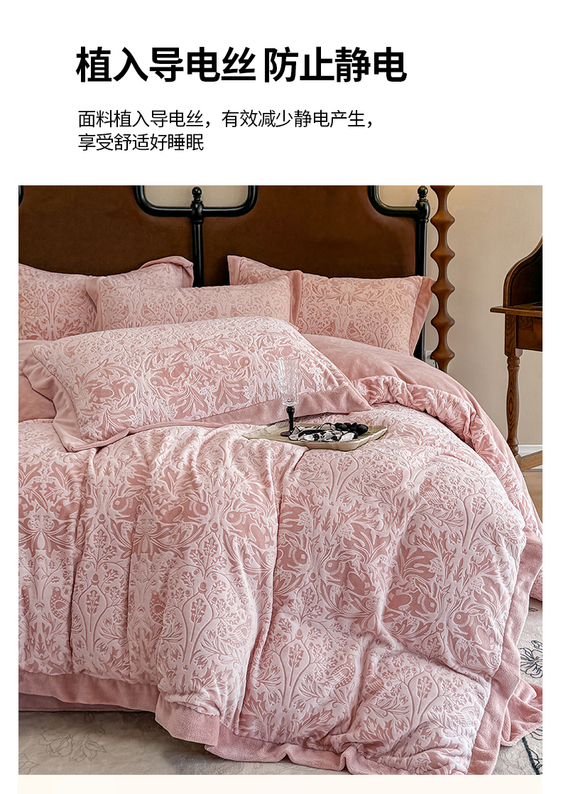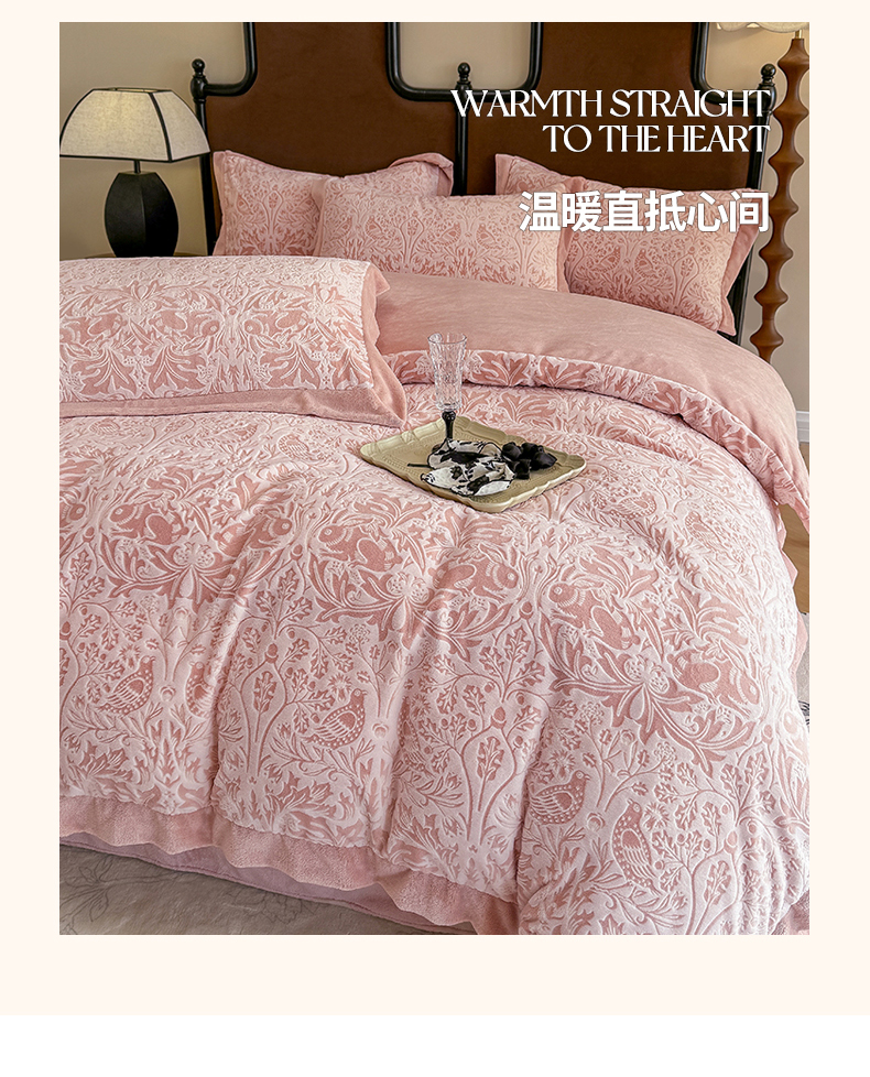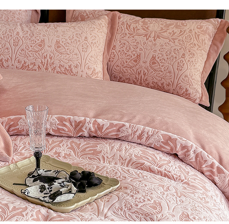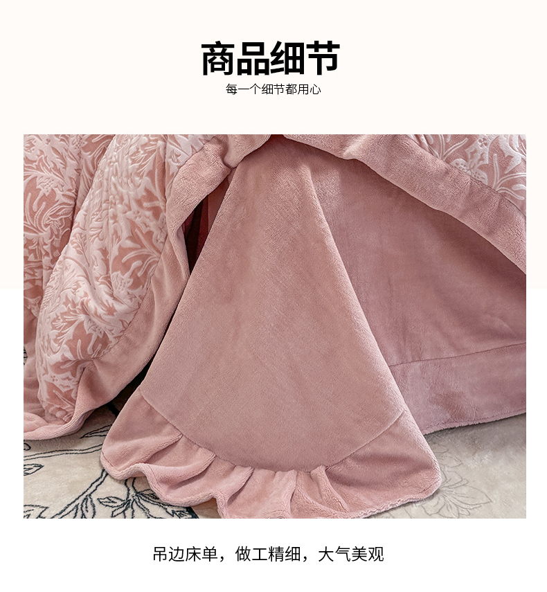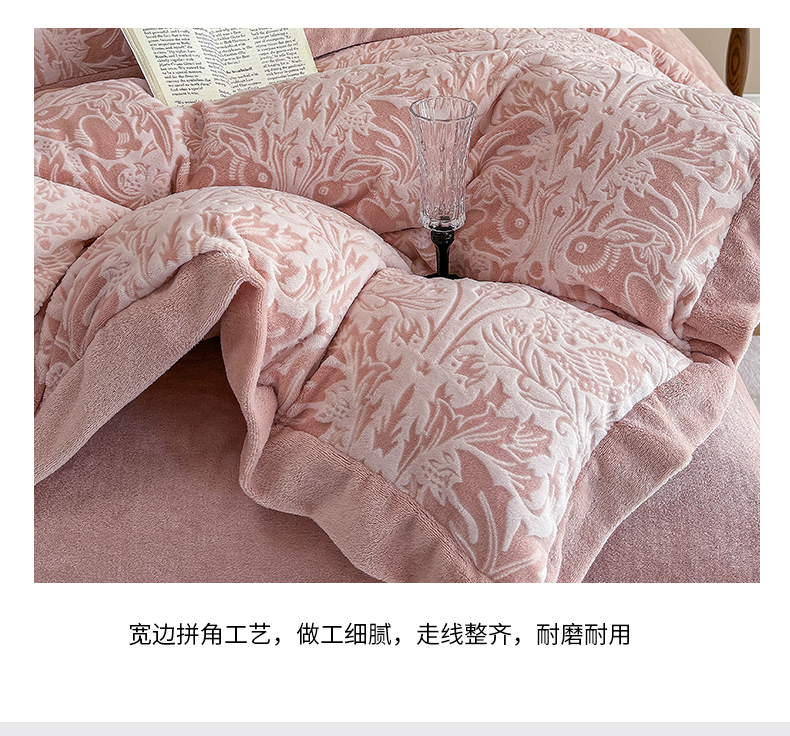 商品名称:慕晨 2025新款高克重雕花牛奶绒法式风大宽边拼角吊边床单四件套 可可西里-珊瑚粉