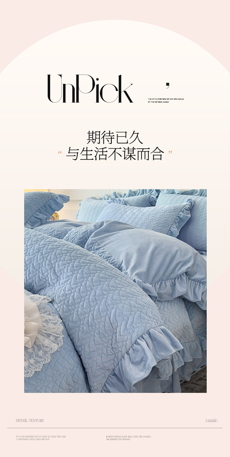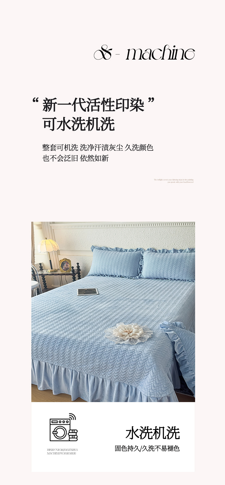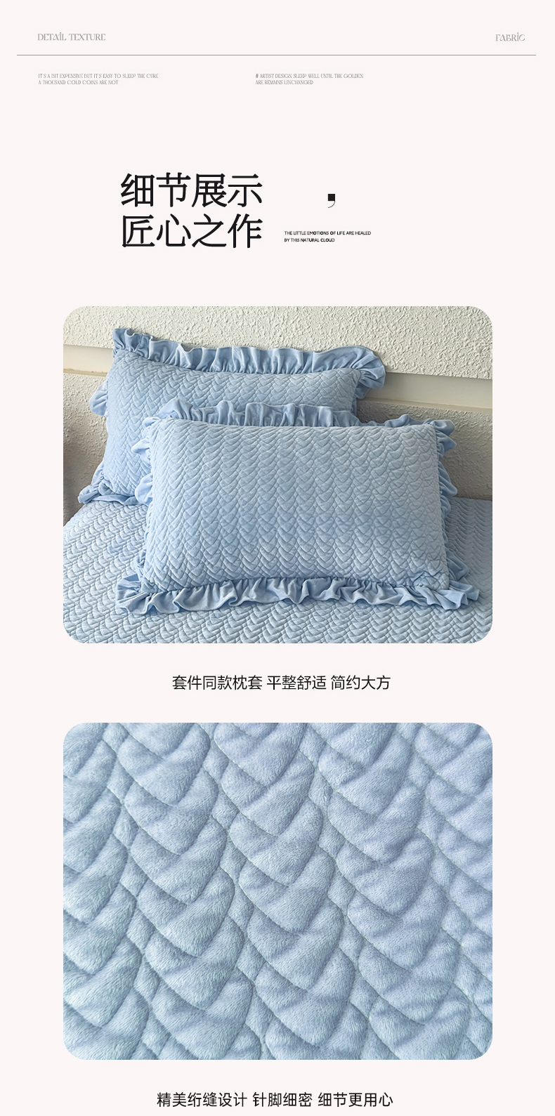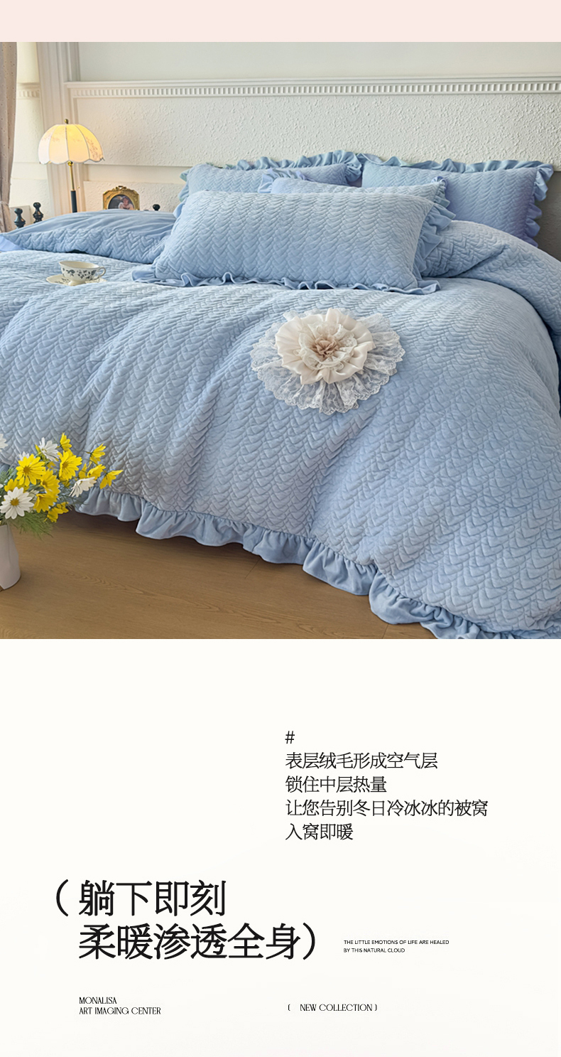 商品名称:乐嘉盈2025年新款纯色刺绣床裙款牛奶绒四件套-云栖 云栖-蓝