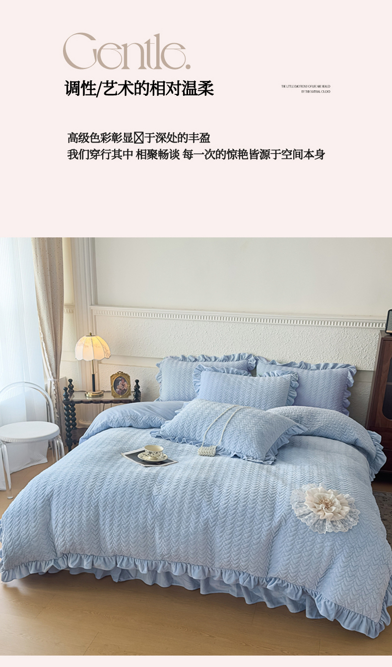 乐嘉盈2025年新款纯色刺绣床裙款牛奶绒四件套-云栖 云栖-蓝